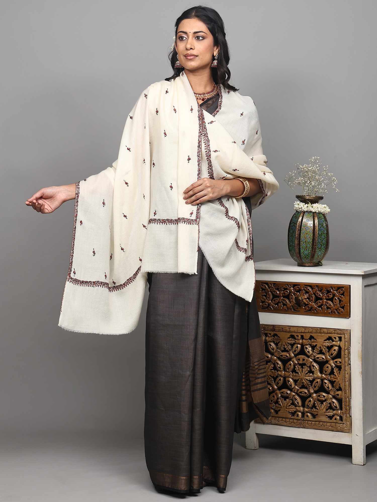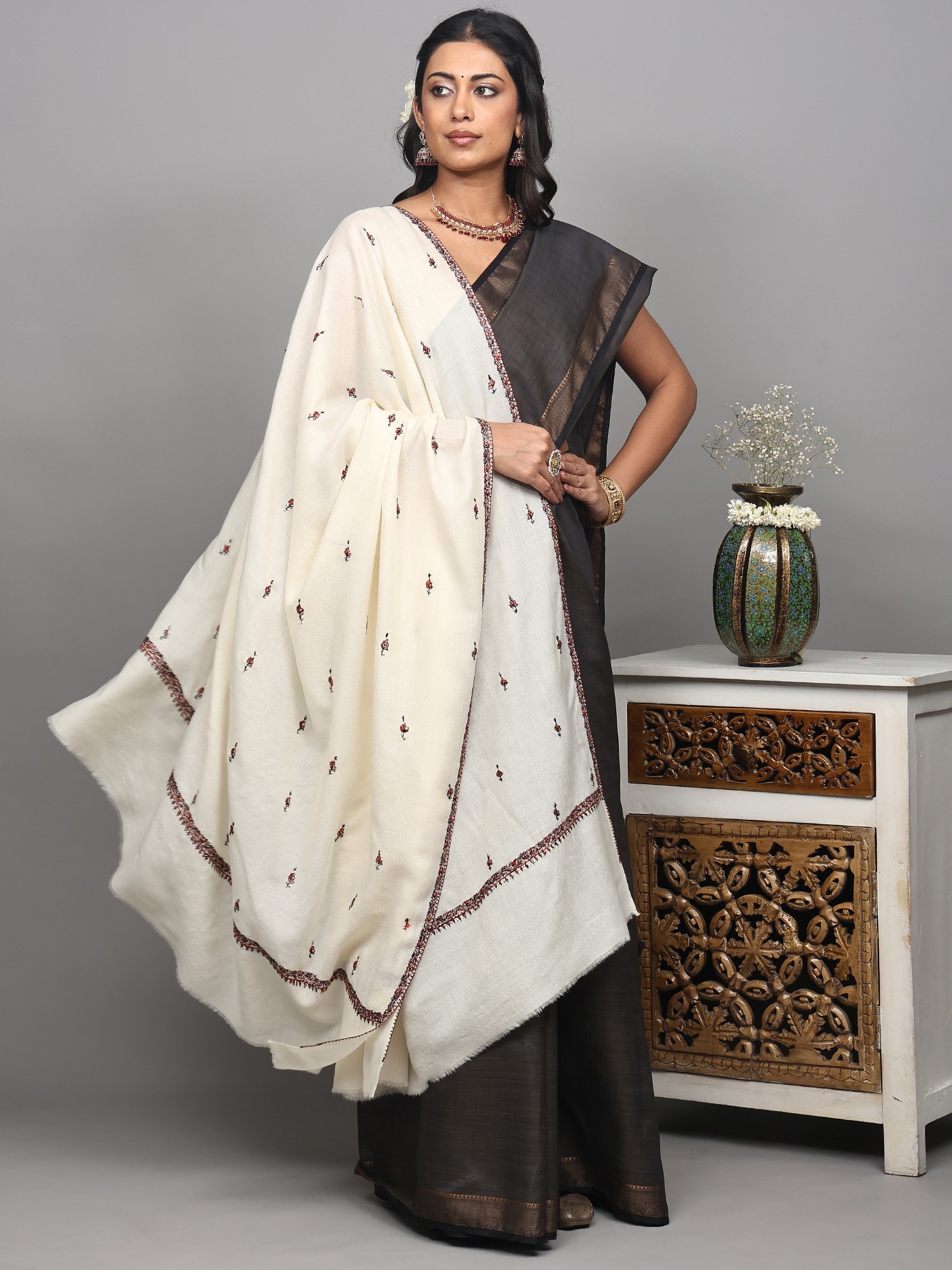 Cannoli-Cream Handloom Pure Pashmina Shawl from Kashmir with Sozni-Embroidery by Hand