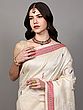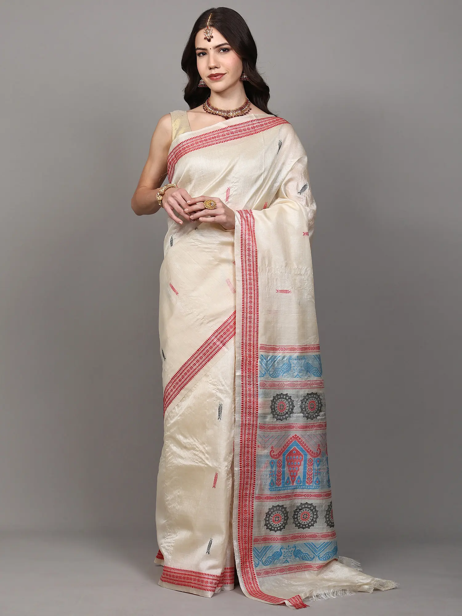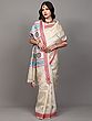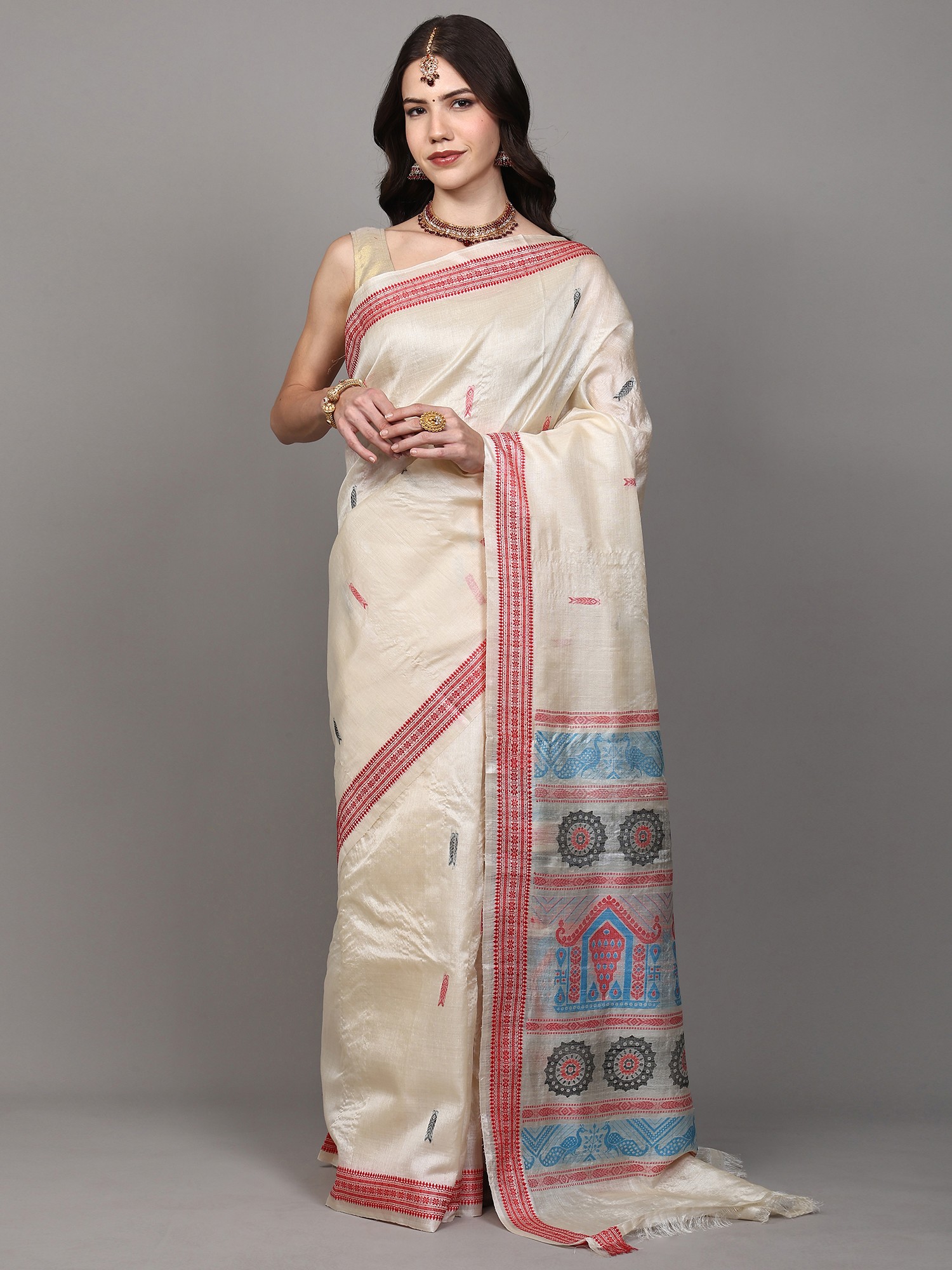 Bluefin Pure Silk Saree Temple Border Saree with Embroidered Dancing Girl and Woven Motifs from Chhattisgarh