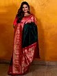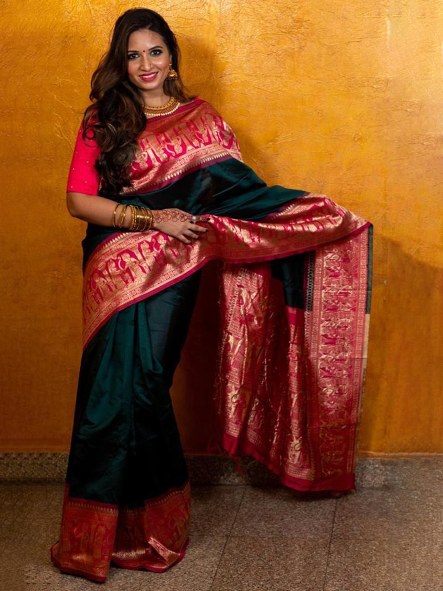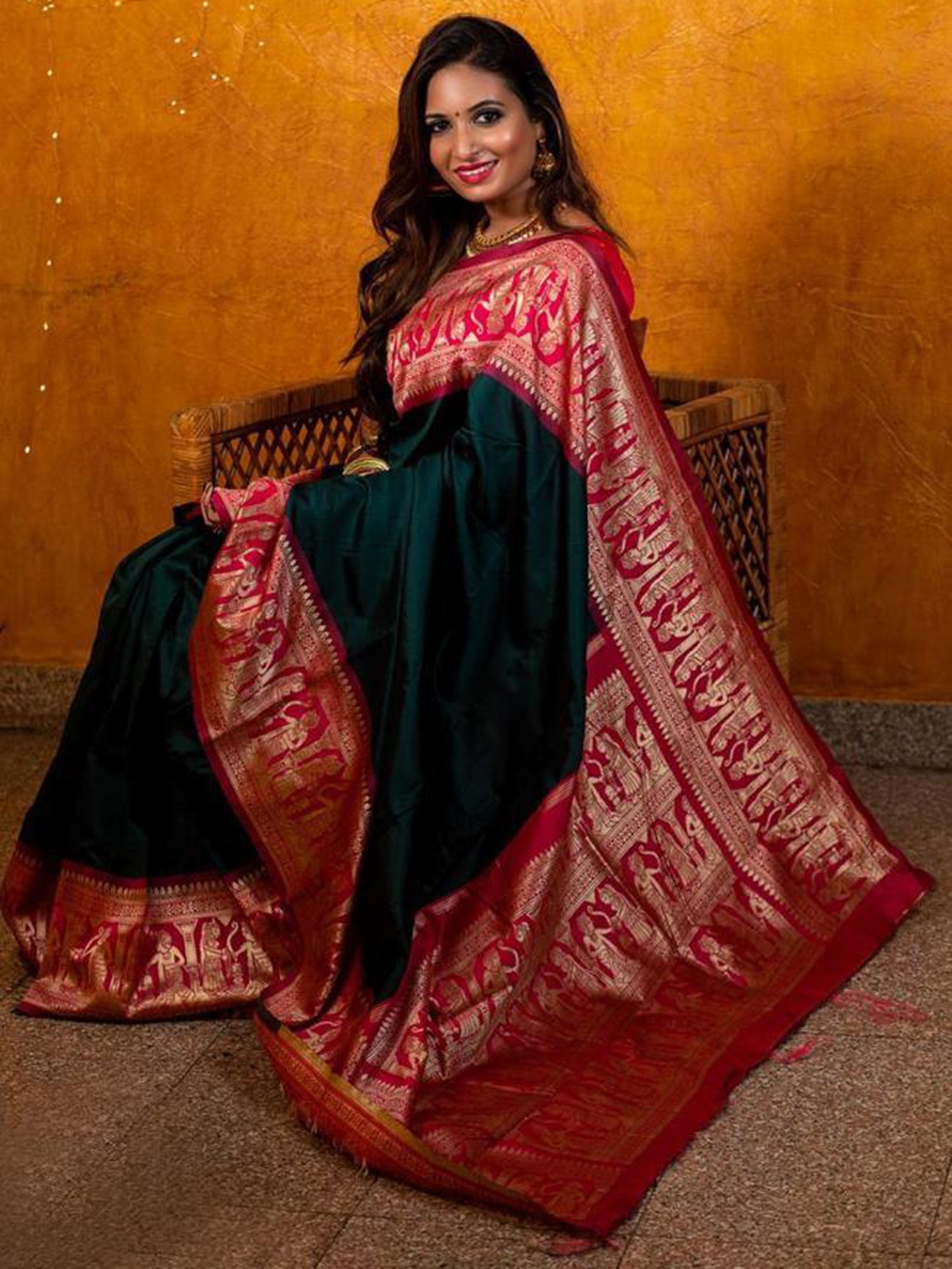 The captivating interplay of deep green and vibrant maroon accents creates a striking visual harmony. The lustrous sheen of the silk catches the light, highlighting the elaborate golden Jacquard patterns that adorn the pallu and border. This rich textile experience is completed by the promise of a perfectly tailored blouse and underskirt, ensuring a flawless silhouette and an unparalleled sense of luxury.