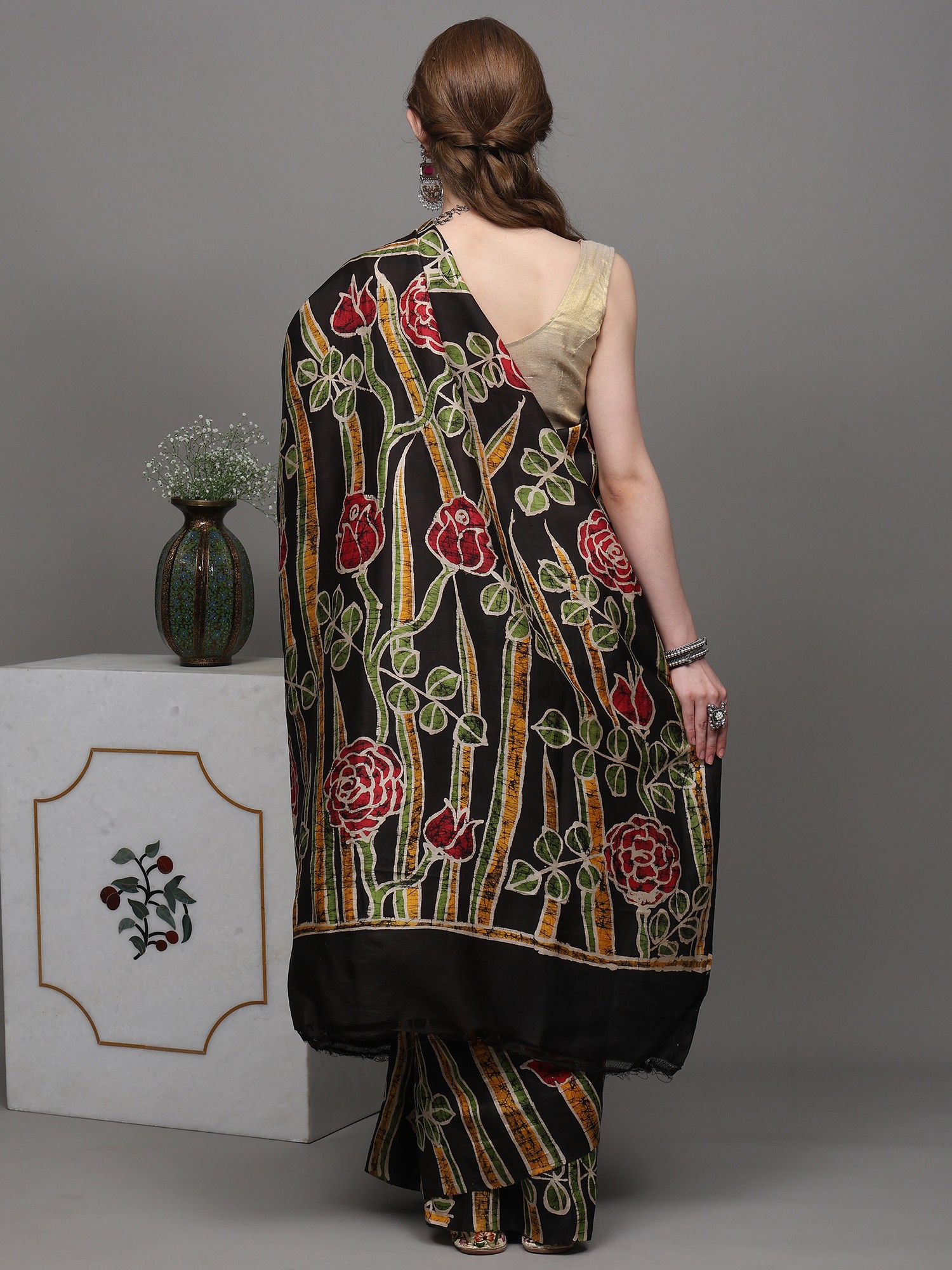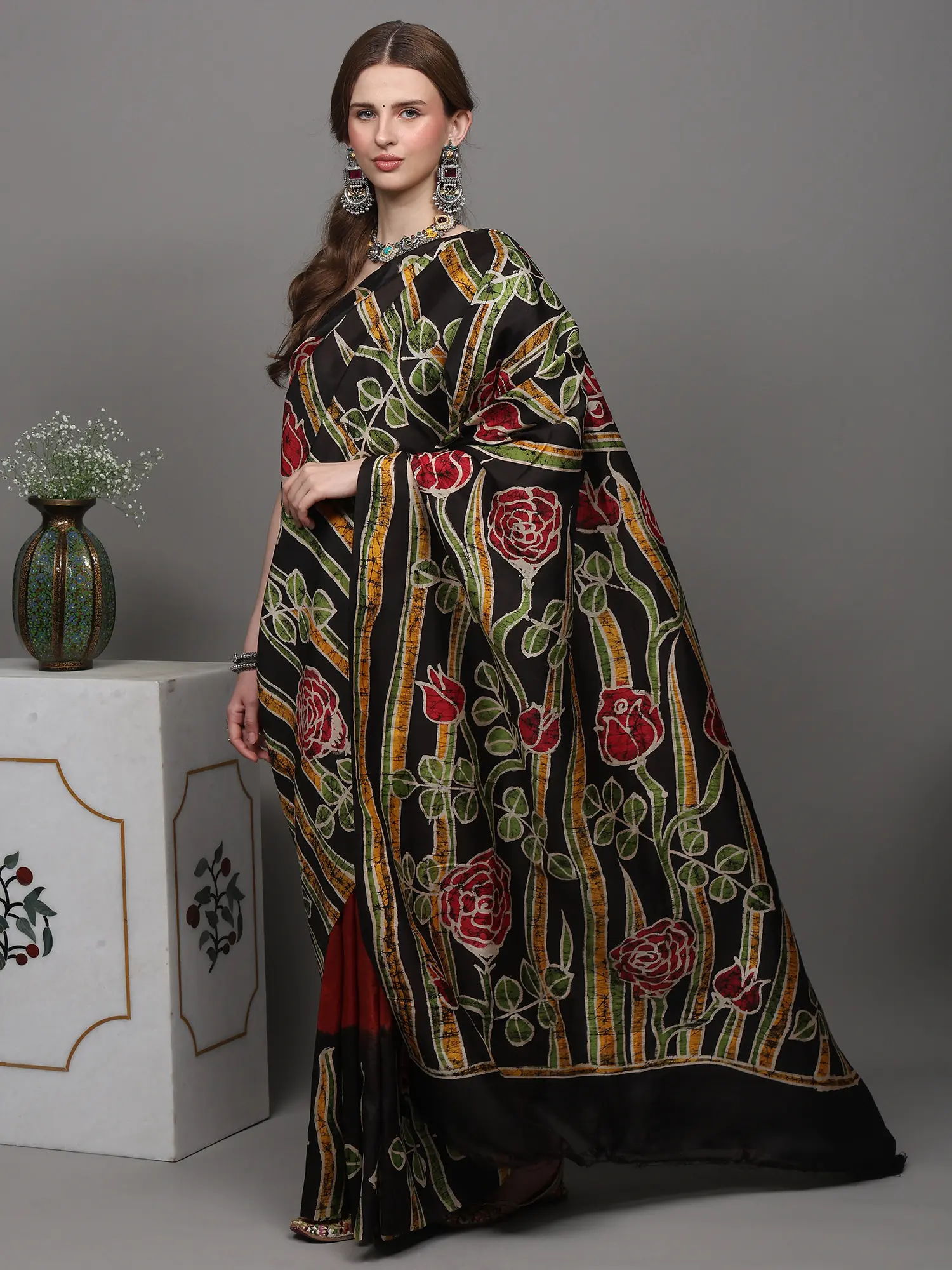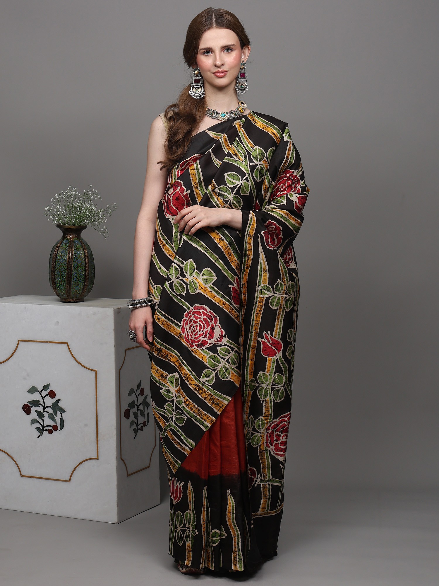 The Caramel and Black Handloom Batik Sari from Madhya Pradesh is a masterpiece, paying homage to the awe-inspiring art of Batik. Printed with delicate roses, it's an ode to the electorate and their vibrant spirit. Roses, the prime motif, symbolize youth, romance, and fresh bloom, infusing the wearer with a fragrant essence of art. The intricate Batik technique beautifully blends caramel and black, creating a visual symphony that captures the heart. This sari isn't just fabric; it's a canvas of emotions, a celebration of democracy and artistry, and a reminder that beauty can be found in both nature and the human spirit.