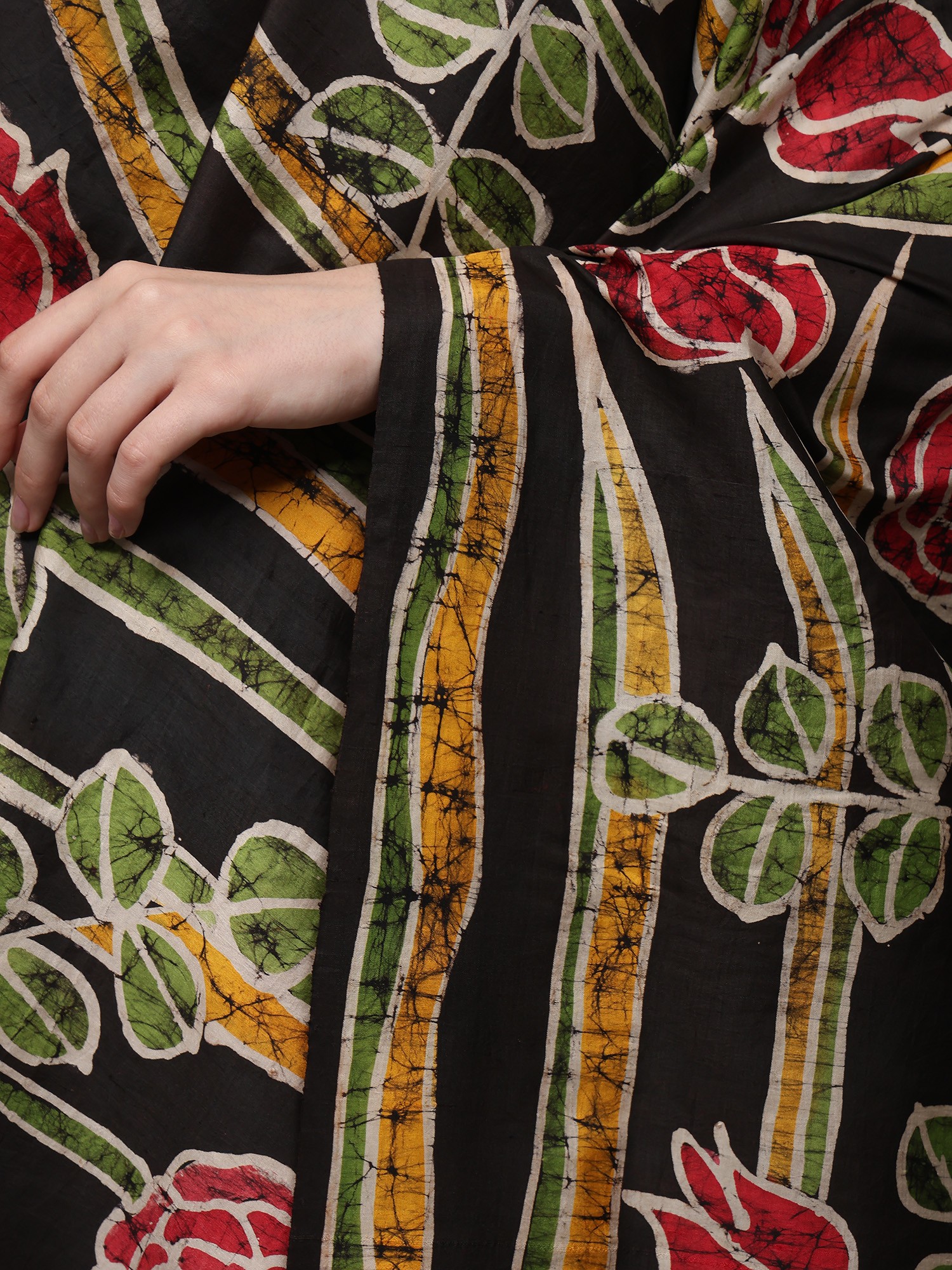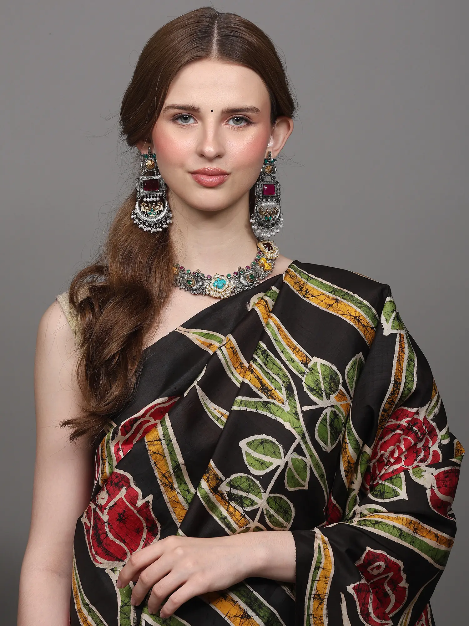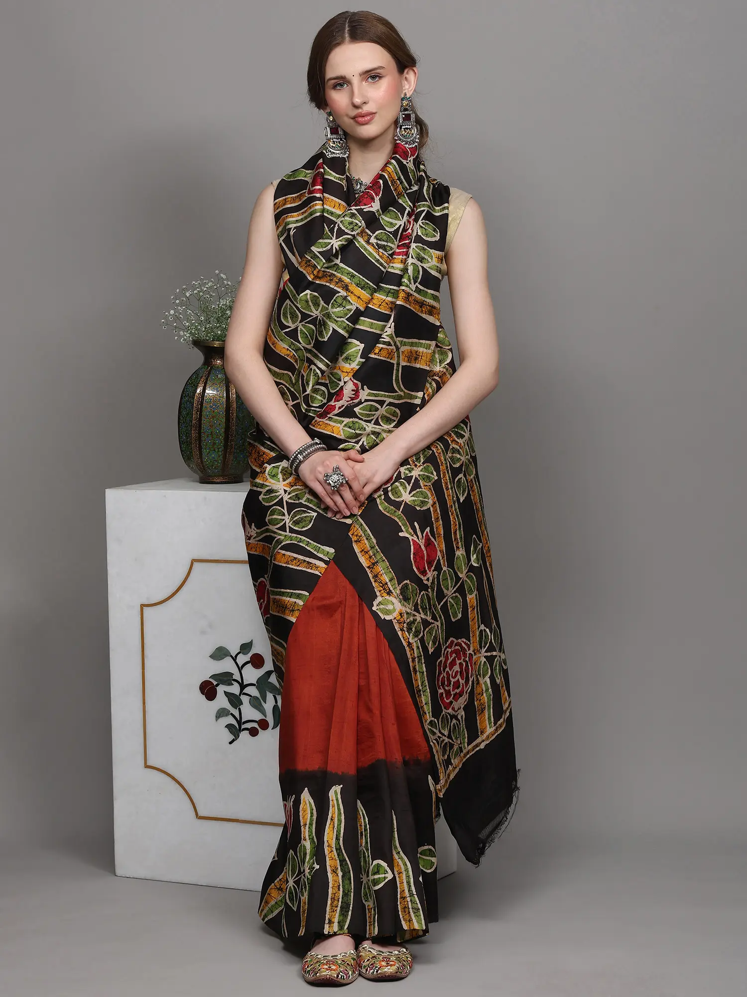 The Caramel and Black Handloom Batik Sari from Madhya Pradesh is a masterpiece, paying homage to the awe-inspiring art of Batik. Printed with delicate roses, it's an ode to the electorate and their vibrant spirit. Roses, the prime motif, symbolize youth, romance, and fresh bloom, infusing the wearer with a fragrant essence of art. The intricate Batik technique beautifully blends caramel and black, creating a visual symphony that captures the heart. This sari isn't just fabric; it's a canvas of emotions, a celebration of democracy and artistry, and a reminder that beauty can be found in both nature and the human spirit.
