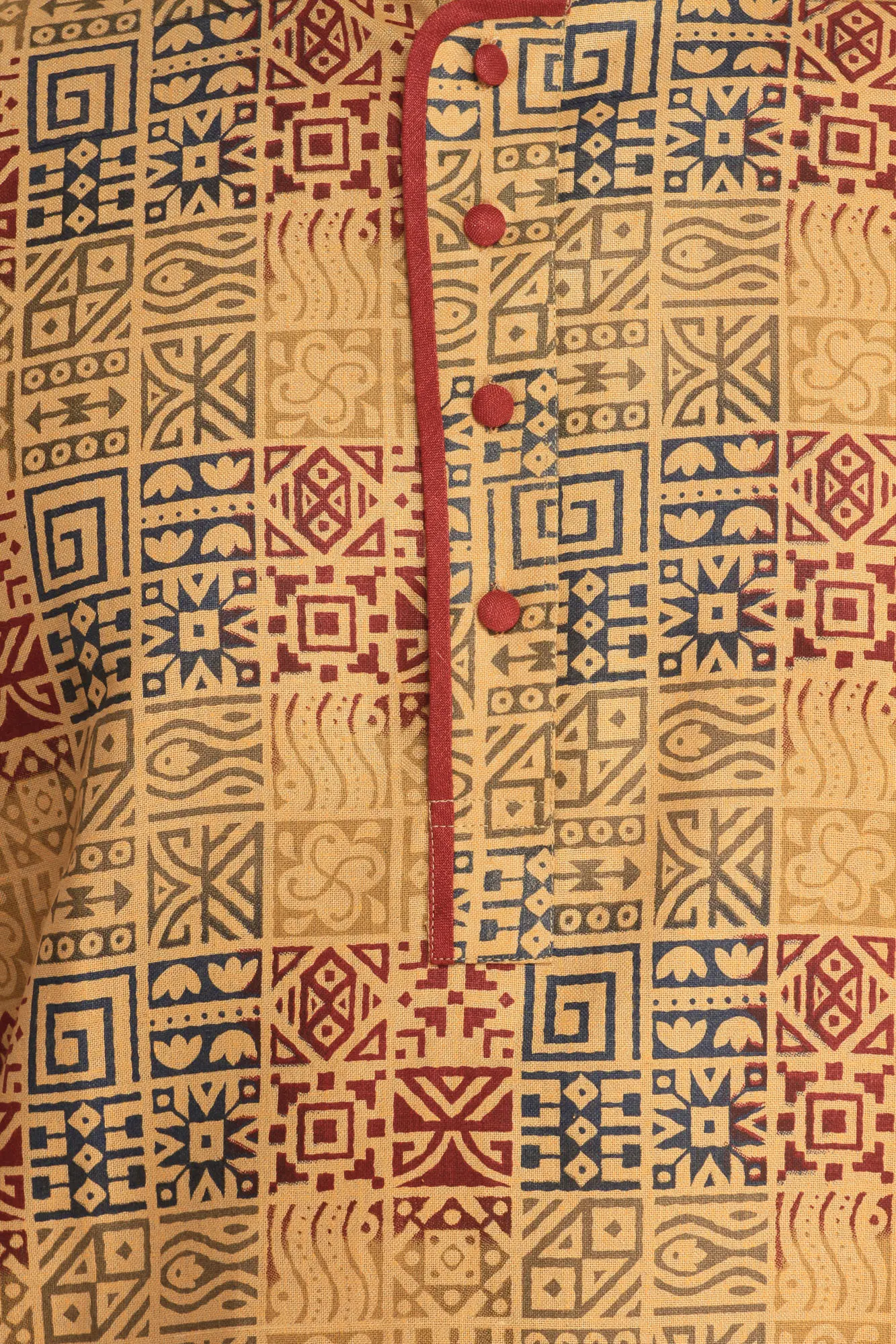 Crafted from pure cotton, this ensemble ensures a breathable and relaxed wearing experience. Its enchanting feature is the “Hieroglyphic Print” (Writing System of Ancient Egypt), adding a touch of artistry to the attire. Perfect for both casual and semi-formal occasions, this outfit strikes a balance between traditional elegance and contemporary flair. The “Kurta” boasts a classic design with a “Mandarin Collar” and “Button-Down Front”, while the Pajama offers a comfortable fit. This set is a tribute to the traditional craftsmanship, making it a cherished addition to any wardrobe.