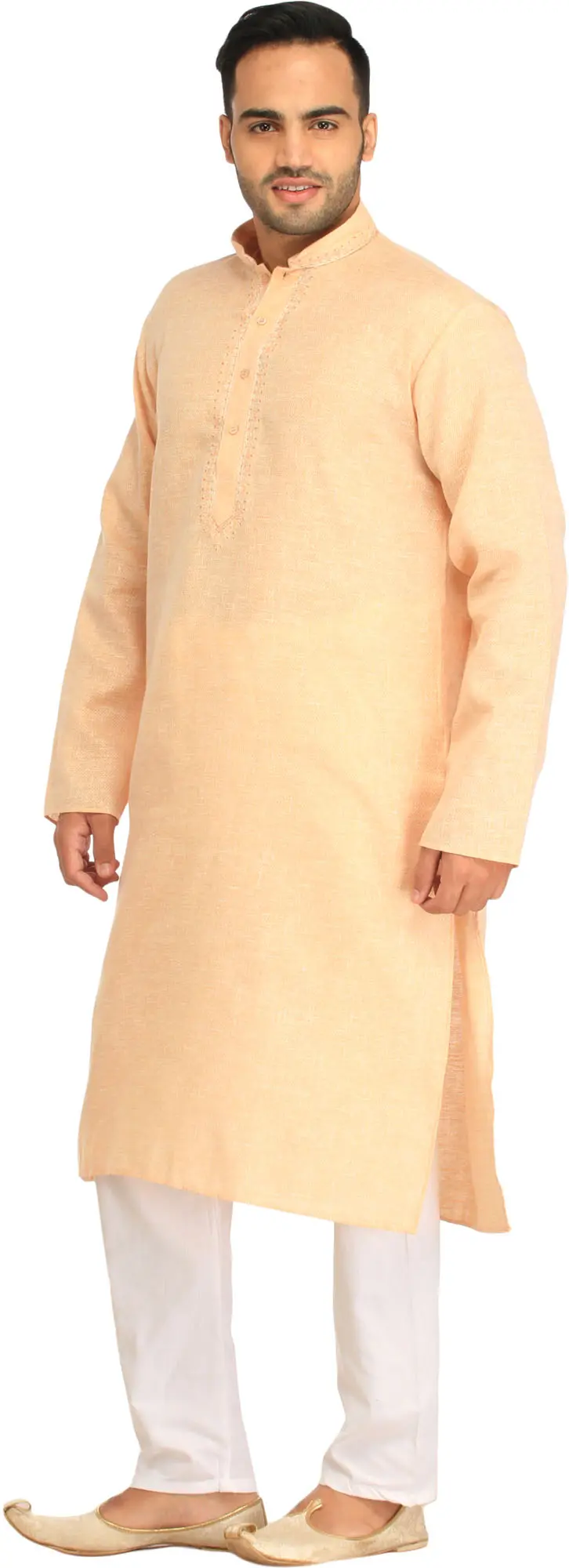 This solid-coloured kurta-pajama from the Exotic India collection is ideal for an everyday casual yet Indian look. Smooth, soft pastels dyed in the purest cottons grown in the subcontinent make for classic summer fashion. Note the characteristic embroidery on the button and the comfort offered by the straight-leg pajamas.