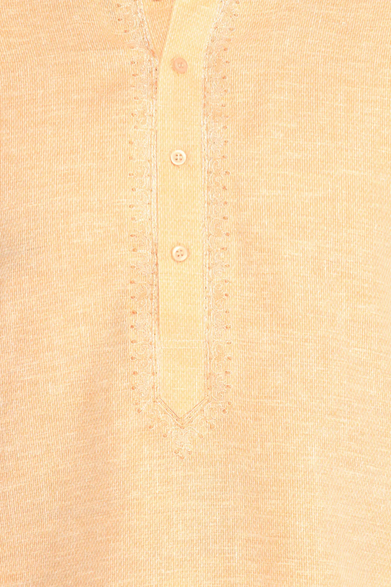 The highlight of this kurta pajama set lies in its refined thread embroidery adorning the neckline. Delicate patterns, meticulously stitched in a complementary shade, add a touch of understated elegance. This thoughtful detail elevates the classic kurta design, transforming it into a piece that is both timeless and stylish. The mandarin collar, a signature feature of kurta pajamas, is enhanced by the intricate embroidery, framing the face with a classic appeal. The front placket features matching buttons, maintaining the outfit's clean and sophisticated look.