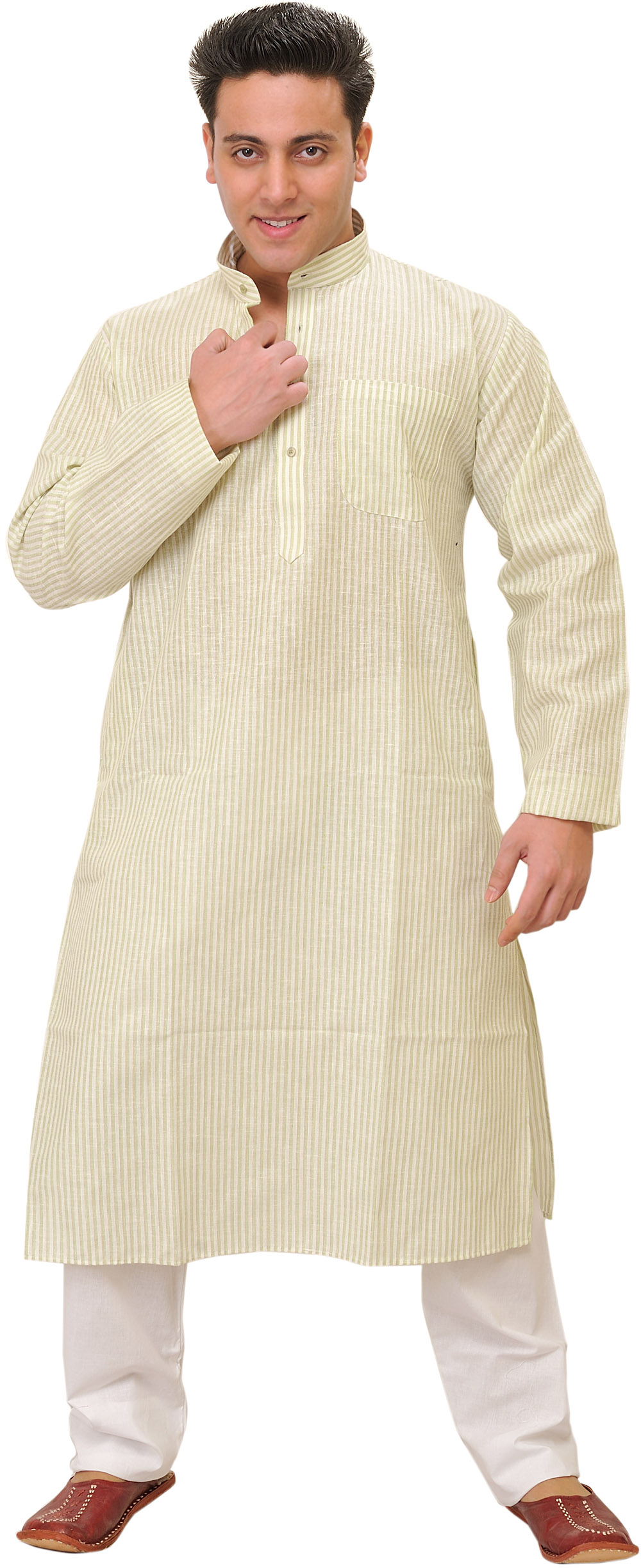 The straight cut style, Chinese collar. Small buttons that highlight the sharp features. The striped pattern, running along the length of the kurta accentuates your style. The kurta extends to below the knees, in a graceful display of one of the most popular traditional weaving styles from the rich heritage of Ethnic Indian Wear.