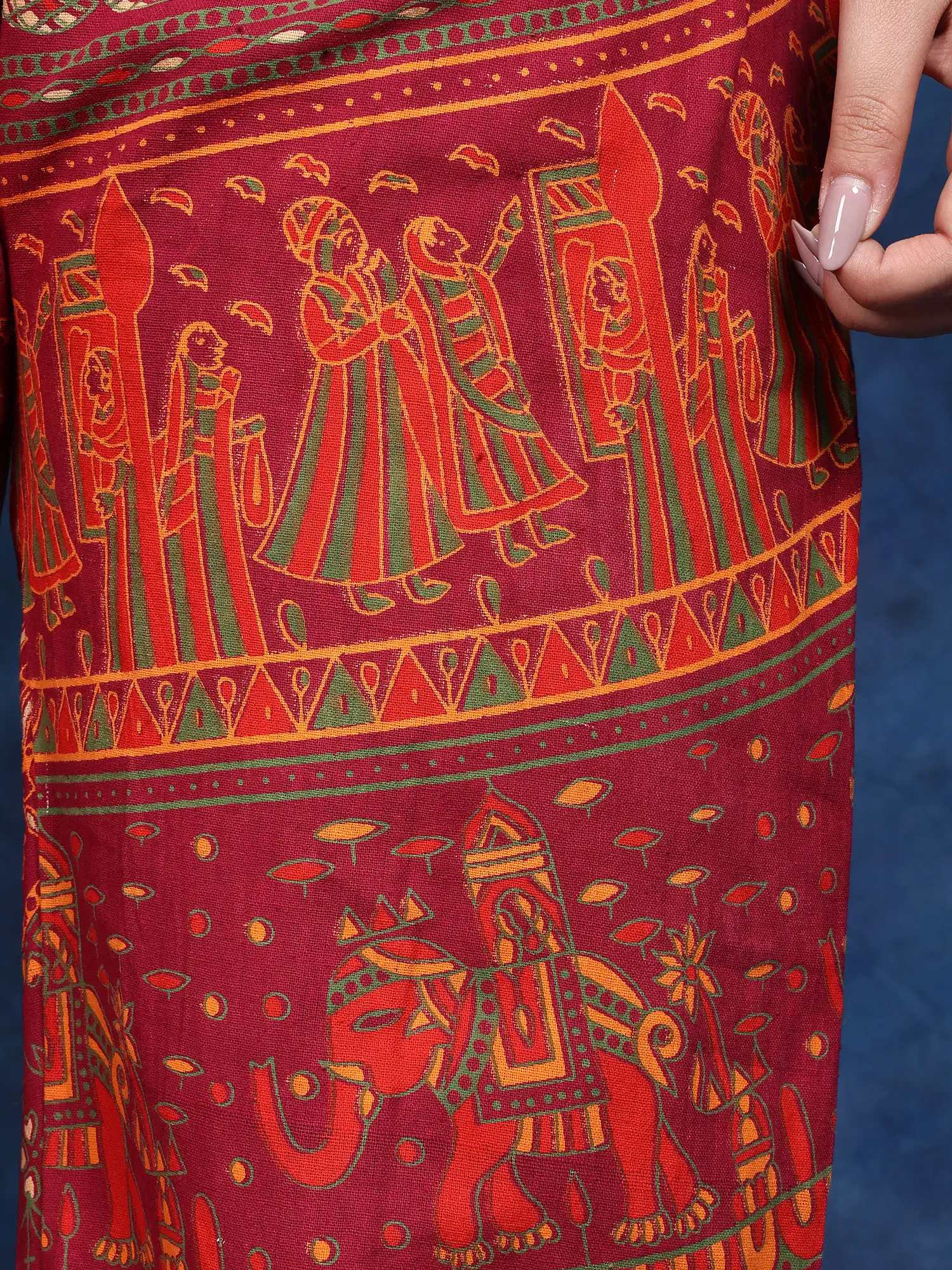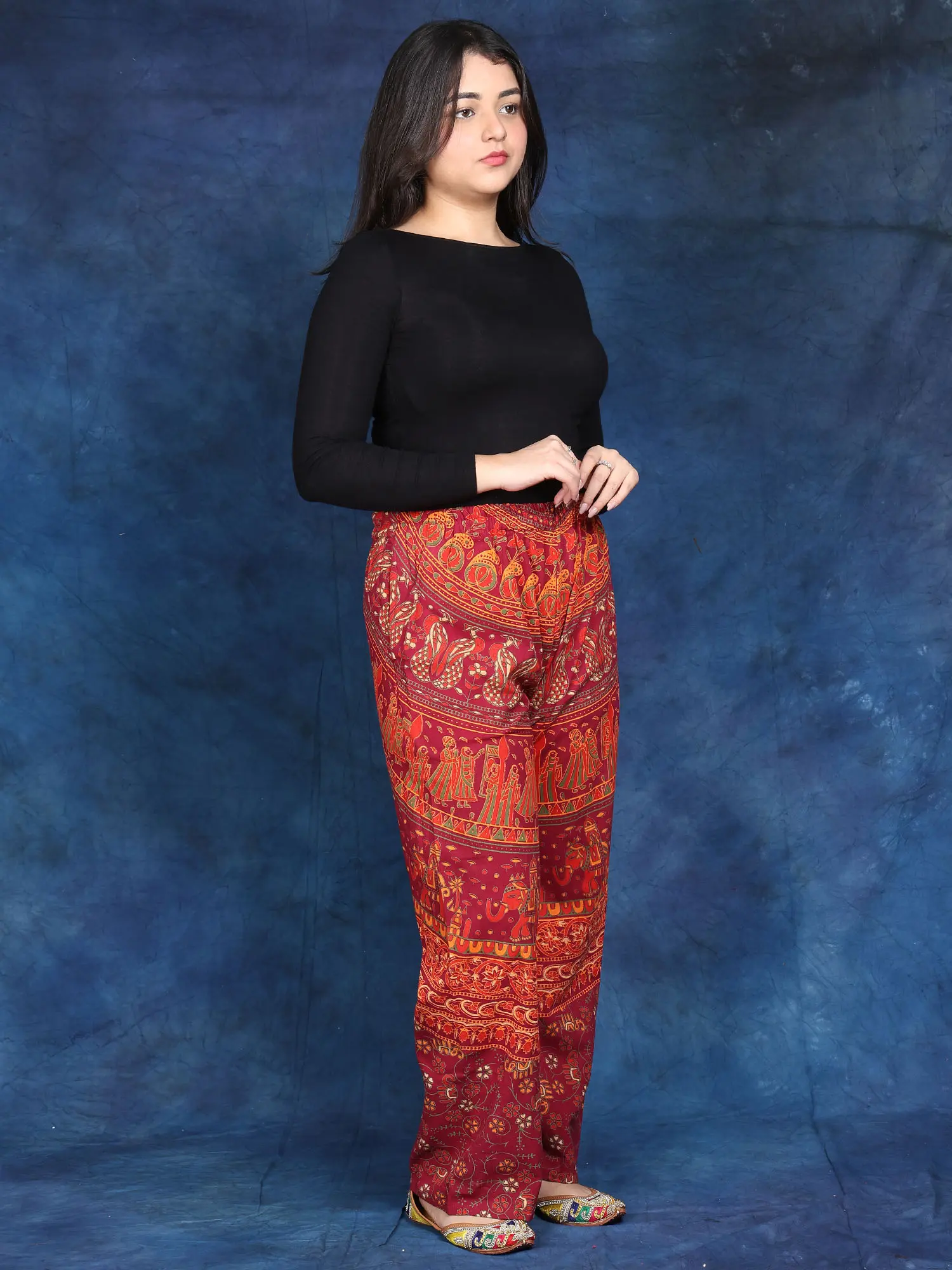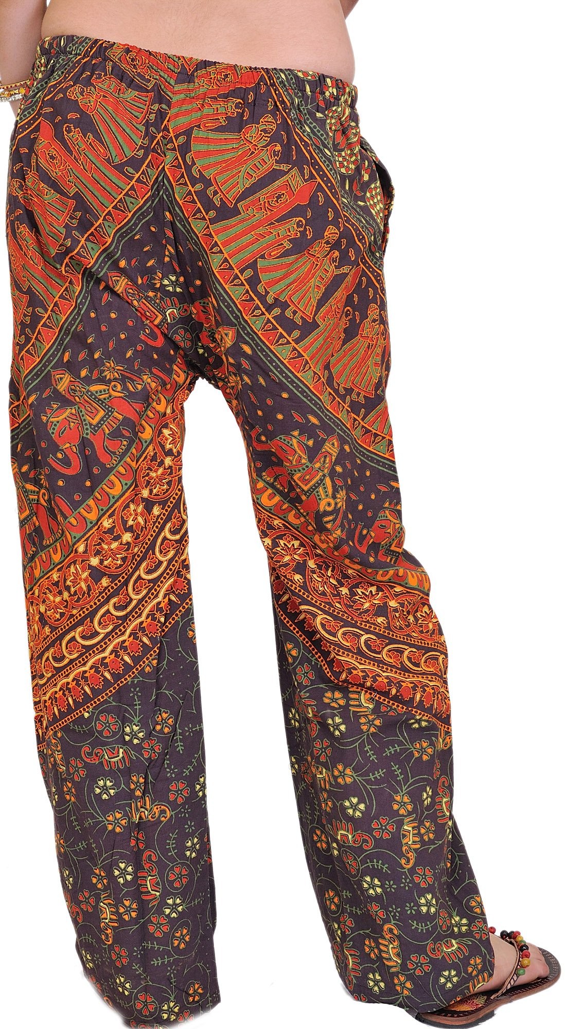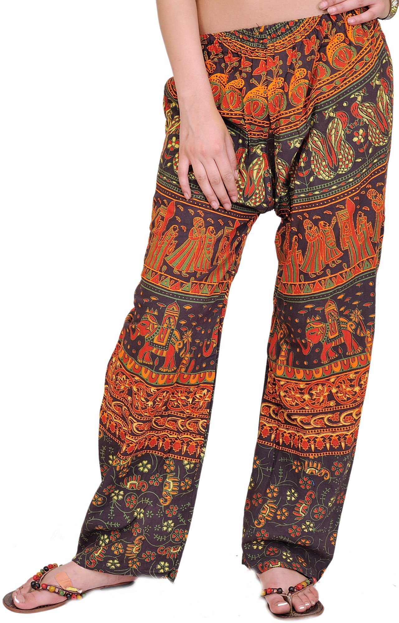 These small Rajasthani towns are famous for their folk art, which finds a way into their fashion in the form of motifs and prints. These trousers from Jodhpur are no exception - note the panel after panel of wedding procession motifs. A richly adorned elephant bears the bridal palanquin on its back, while the groom ushers her away to her new home. Vibrant vines and peacocks with rich, paisley-shaped plumage. Team this with solid-coloured kurtis and shirts to make an unusual fashion statement.