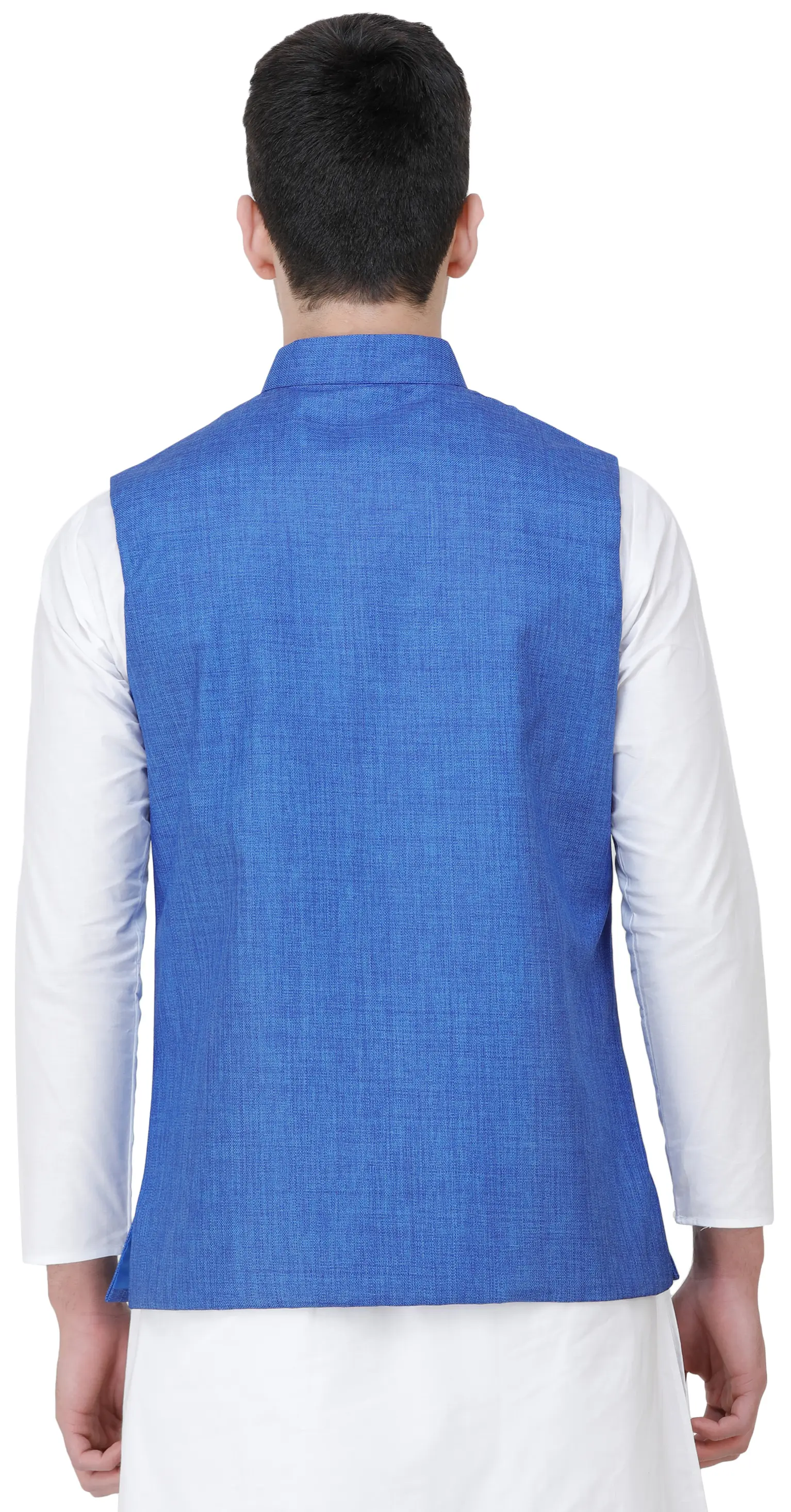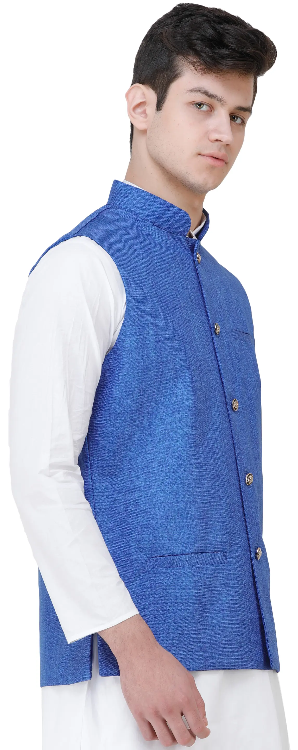 Discover the perfect blend of tradition and contemporary style with this distinguished waistcoat. Designed for the modern man who appreciates classic aesthetics with a touch of casual flair, this piece is an essential addition to any wardrobe. Its rich, vibrant blue hue offers a sophisticated pop of color, making it an ideal companion for a variety of traditional Indian wear. Whether you're attending a wedding, a festive gathering, or simply looking to add an element of refined elegance to your everyday attire, this waistcoat promises to enhance your look with effortless grace.