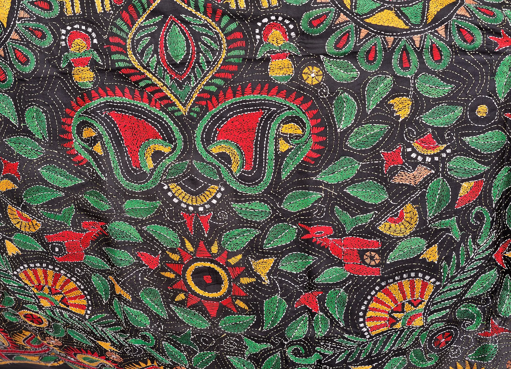 The art of Kantha embroidery, originating from Eastern India, is characterized by its running stitch that creates intricate patterns and images. This dupatta showcases the beauty of this technique, with every stitch meticulously placed by hand. The designs are a delightful fusion of nature-inspired elements and folk motifs, featuring stylized floral blooms, graceful paisley shapes, and charming depictions of elephants and birds. The detailed patterns are rendered in a captivating palette of emerald greens, radiant yellows, and fiery reds, all brought to life against the sophisticated black silk. The running stitch itself is visible, adding a unique texture and artisanal charm to the overall design, highlighting the dedication and patience of the artisan. ––––––––––––––––––––