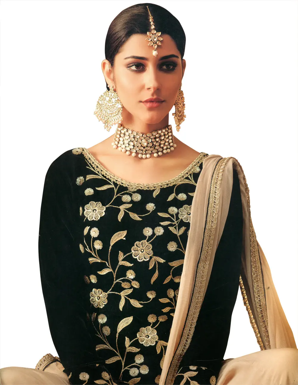 Velvet Sprig Vine Dupatta from Punjab with Zari-Sequins Embroidery and Scalloped Border