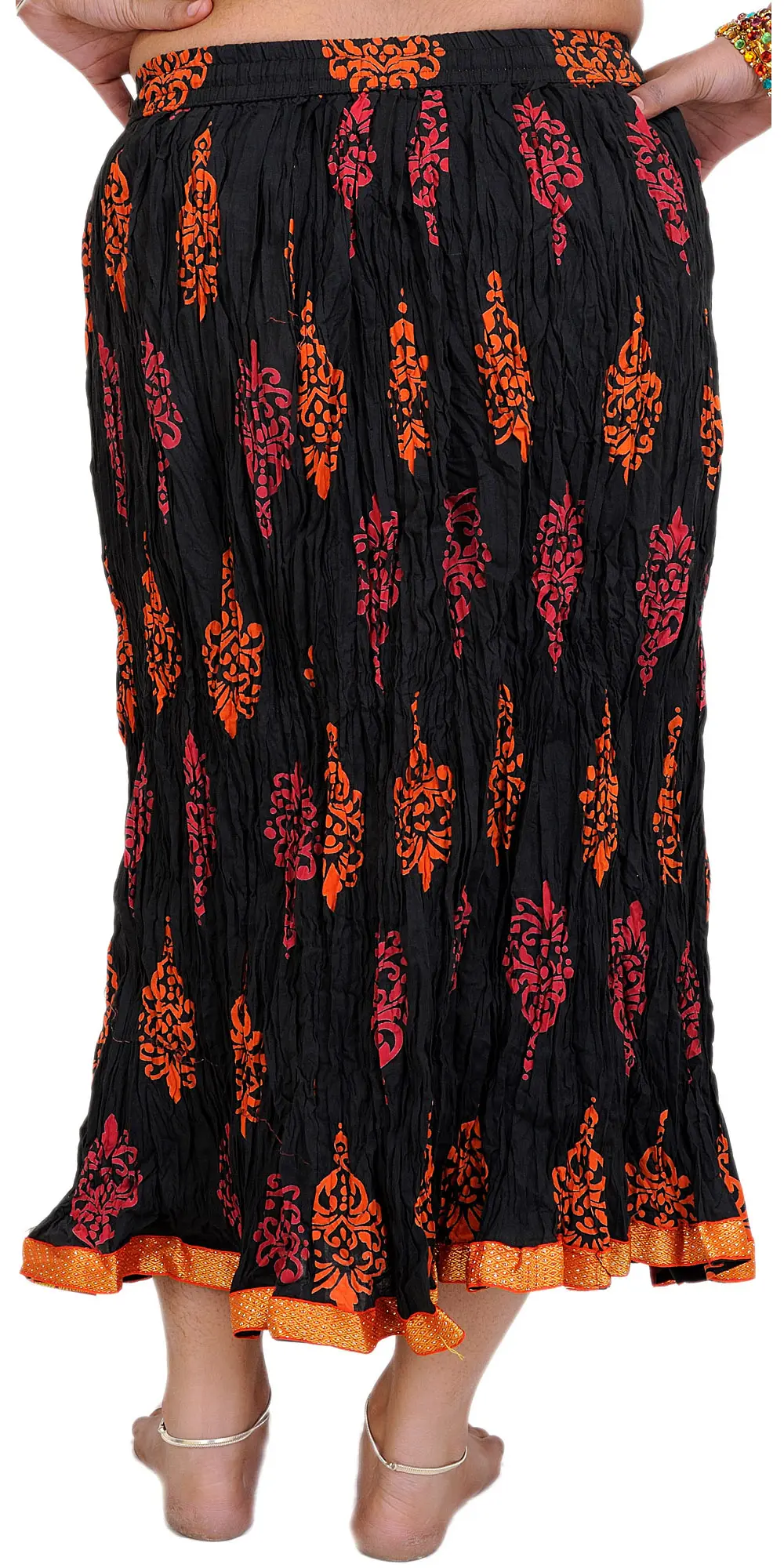 Jet-Black Long Elastic Skirt with Printed Paisleys and Bootis