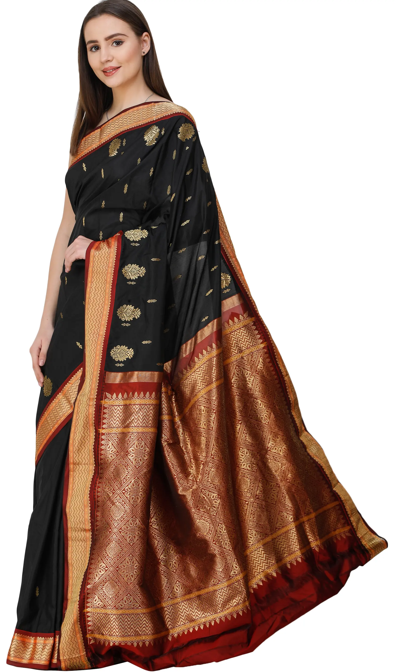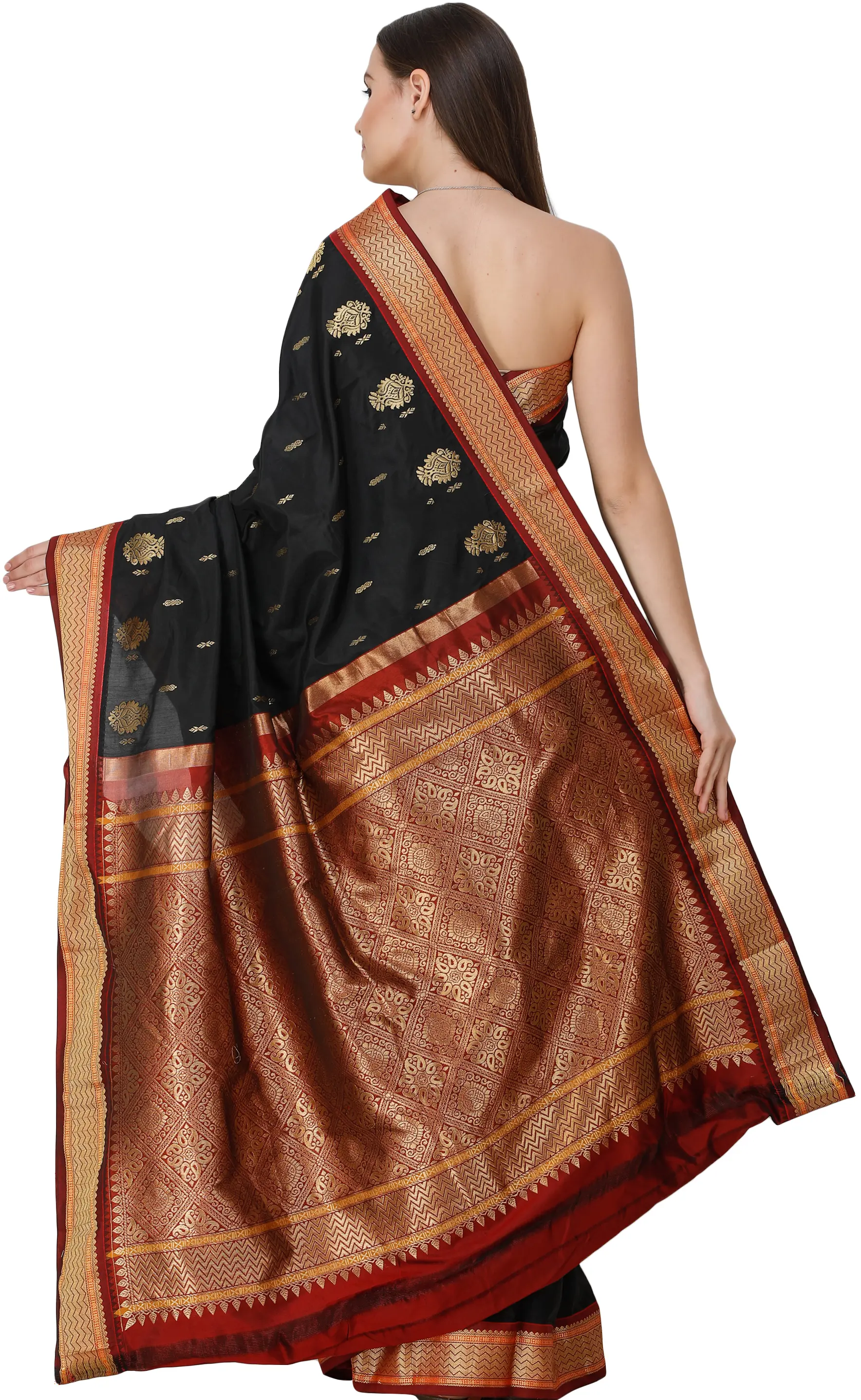 Having originated in the quaint Tamil temple-town named Kanchipuram, Kanjivaram sarees today refer to sarees made using a particular weave applied on homegrown mulberry silk. Indeed they are the most sumptuous of Southern silks - an essential in the vibrant South Indian trousseau - of which the saree you see on this page is proof enough. It is a solid black number, an elegant pick for those post-wedding evening gatherings.