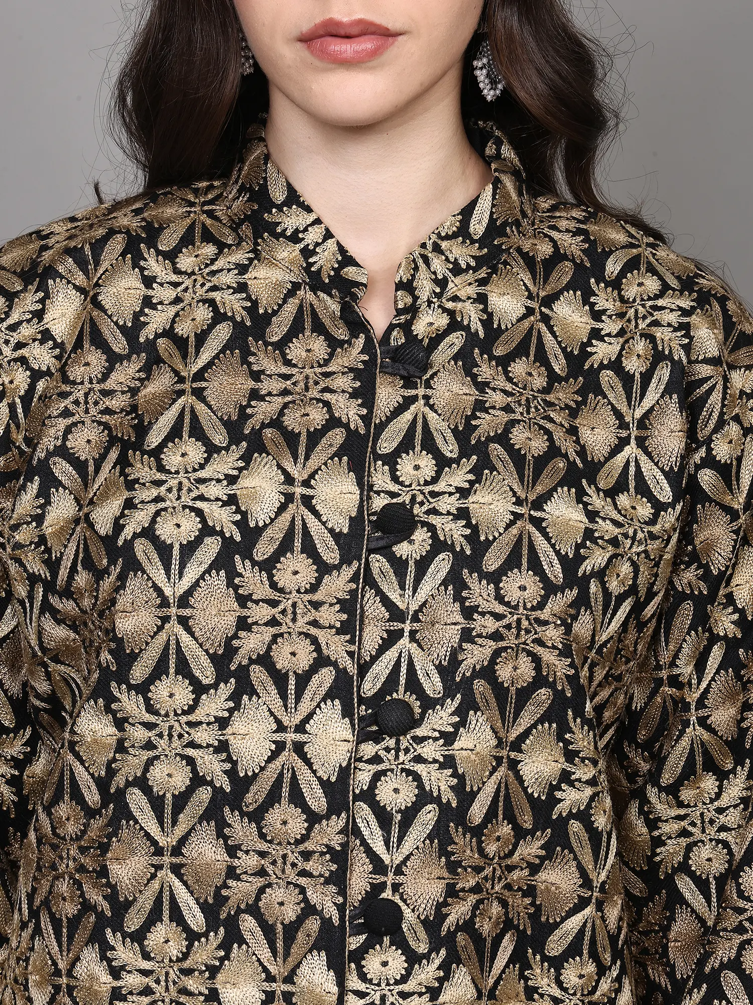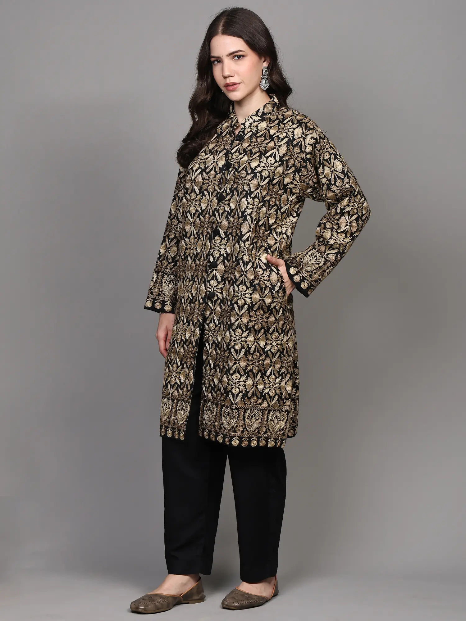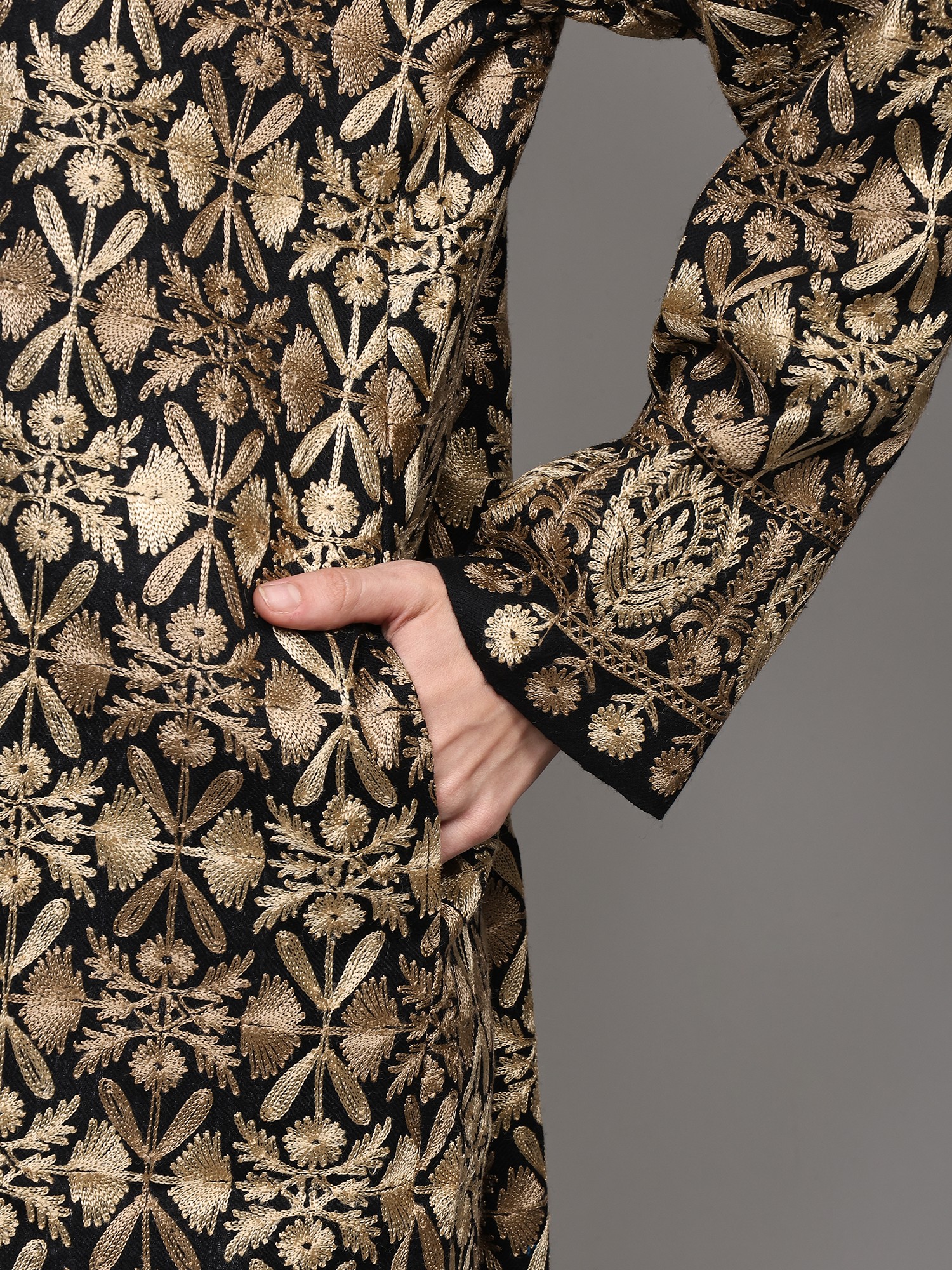 Wool Long Jacket with All-Over Aari Embroidered Paisleys Butta and Side Pockets