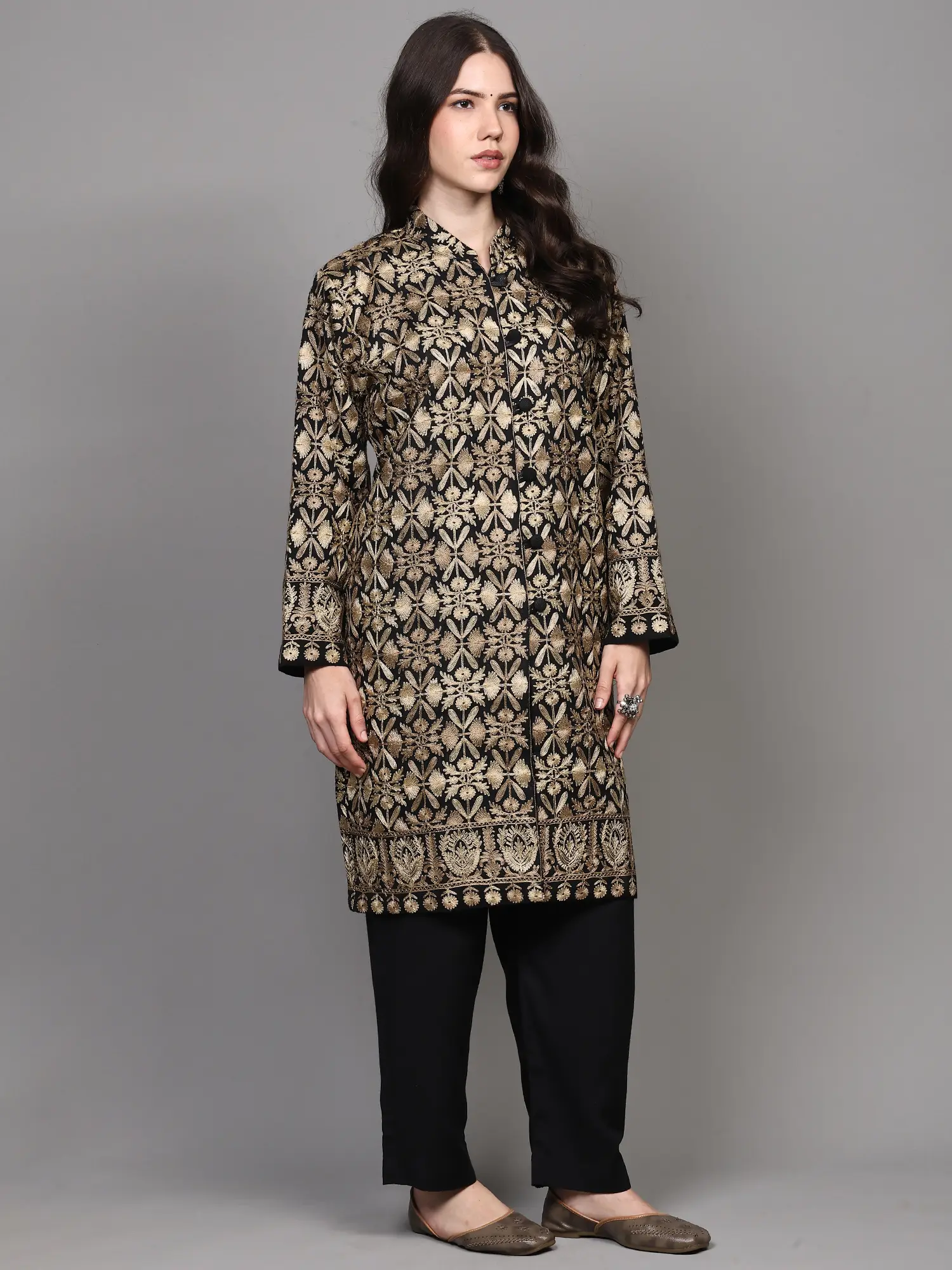 Woolen Charcoal Black with White Detailed Aari Embroidered Long Jacket from Kashmir