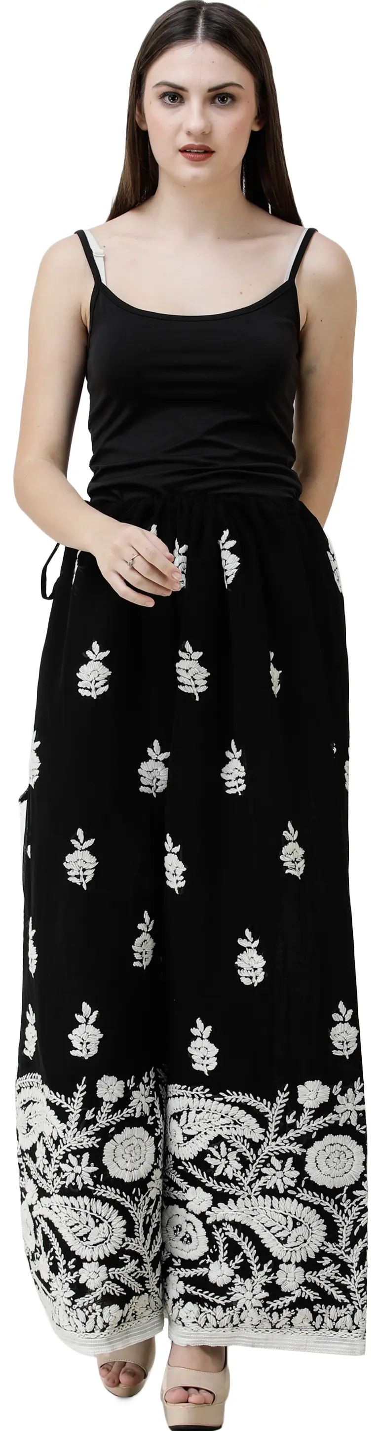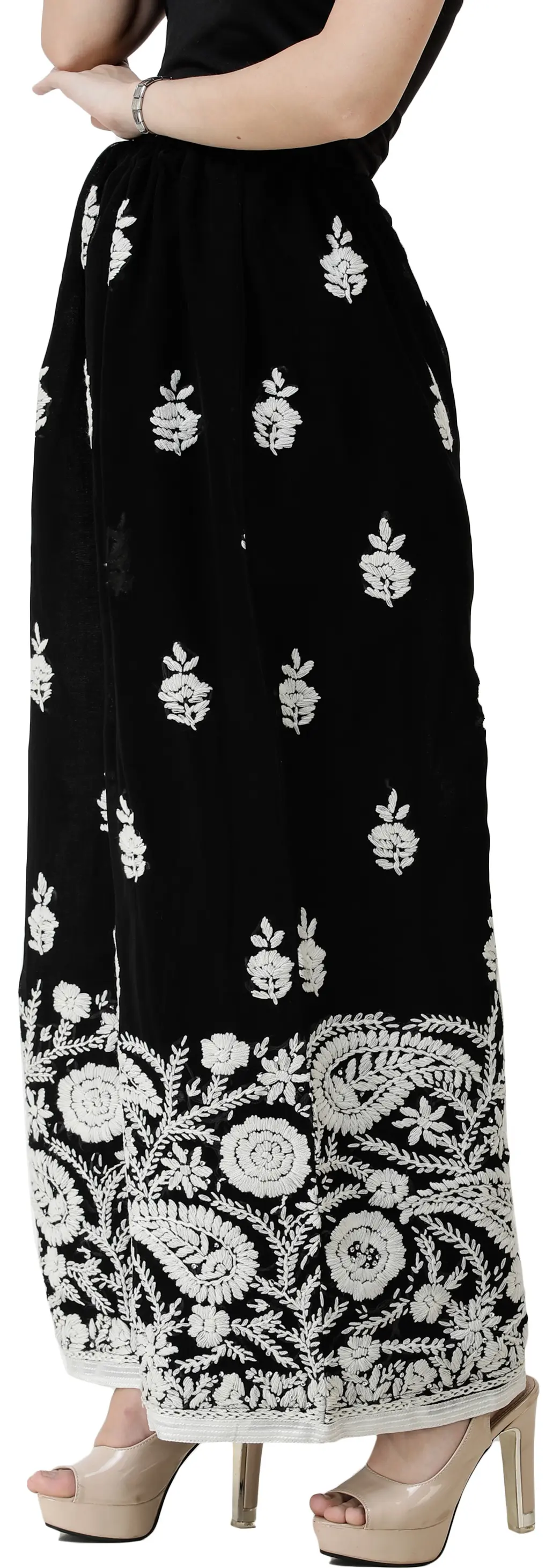 Step into a world of refined style with these exquisite palazzo trousers, a captivating blend of traditional craftsmanship and modern silhouettes. Crafted from a luxurious georgette fabric, these trousers offer a graceful drape and a light, airy feel, perfect for any occasion. The deep, sophisticated caviar-black hue serves as a dramatic canvas for the intricate, artisanal embroidery that adorns them.