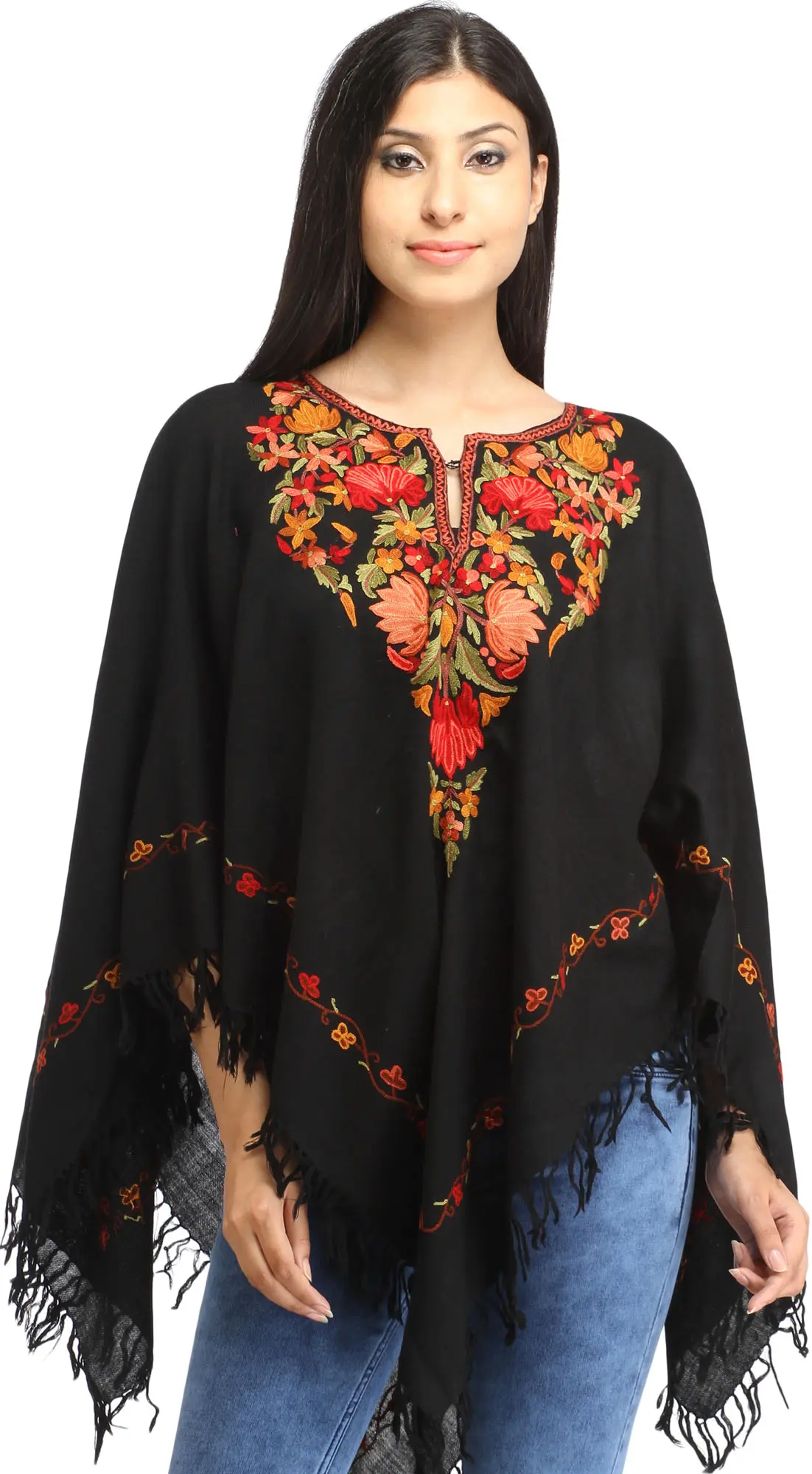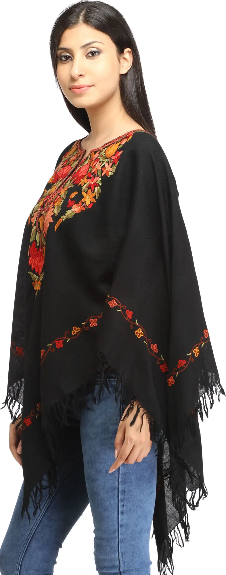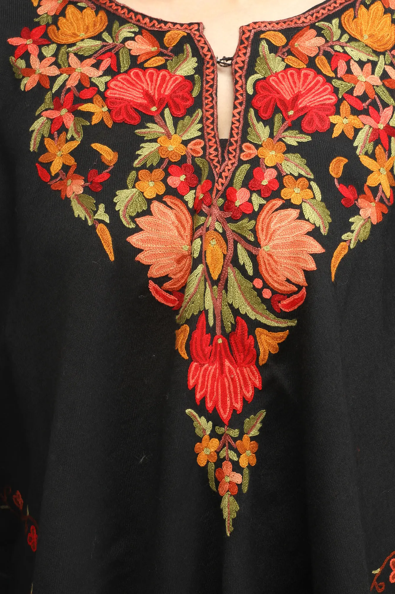 Poncho from Kashmir with Aari Hand-Embroidered Paisley And Flower Pattern on Neck