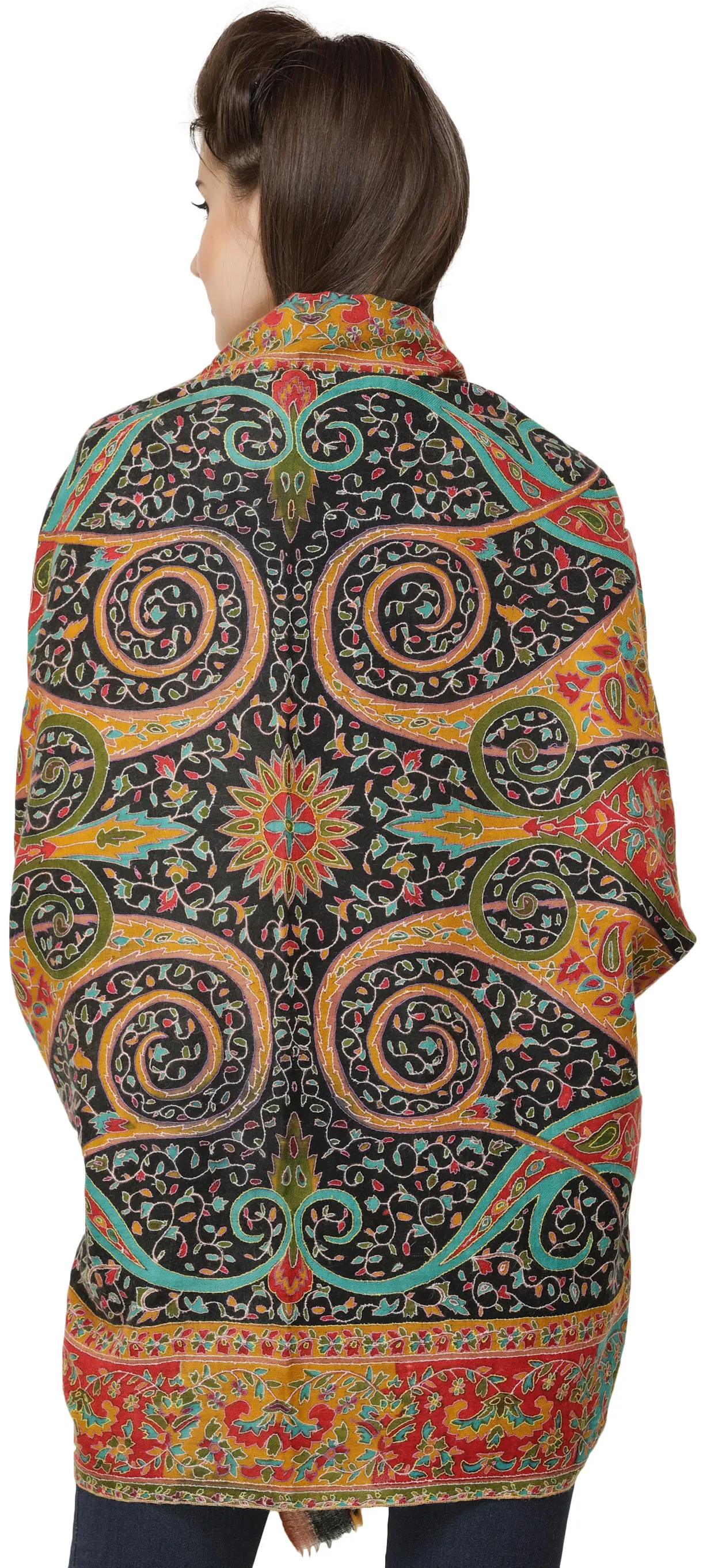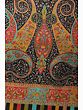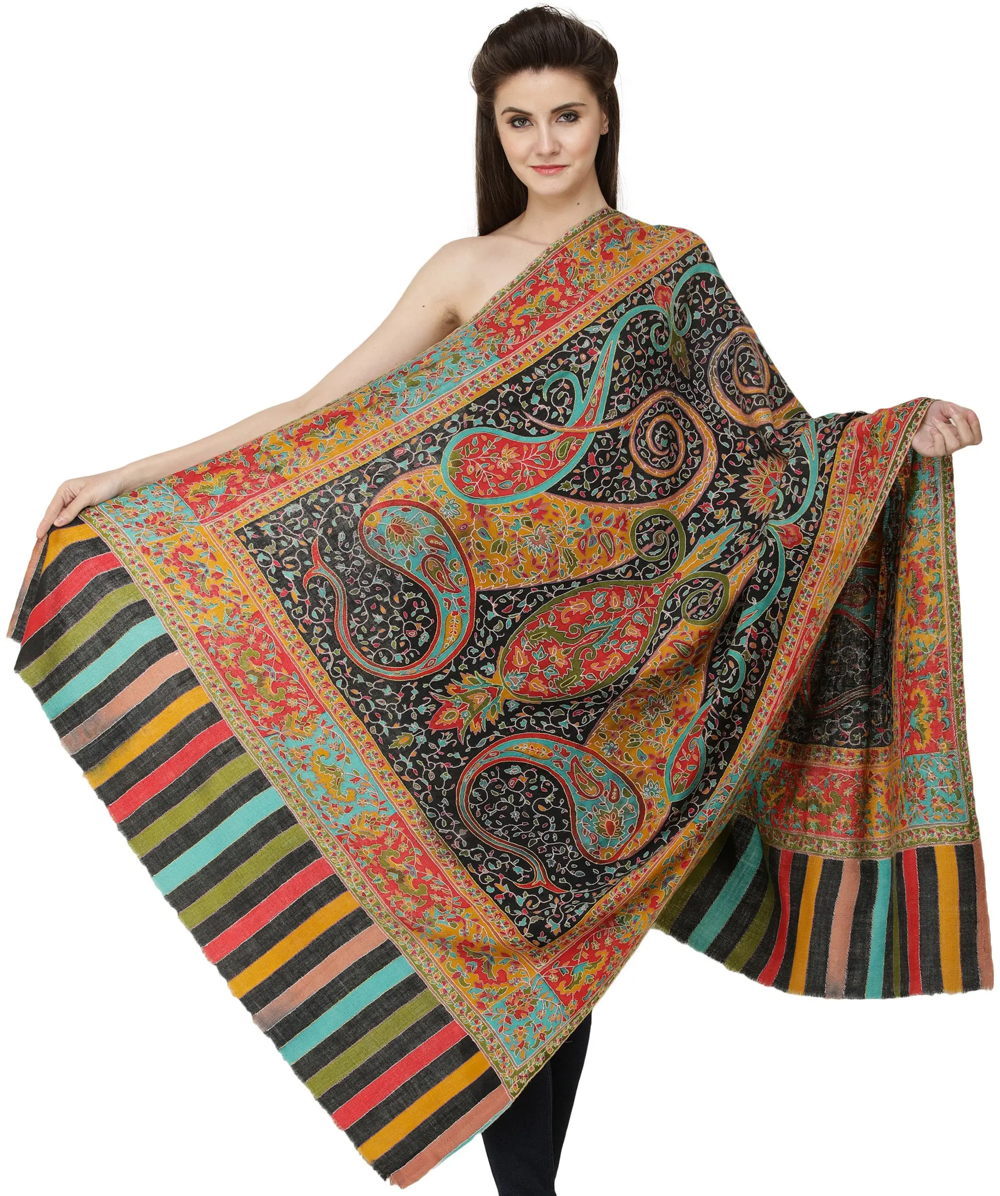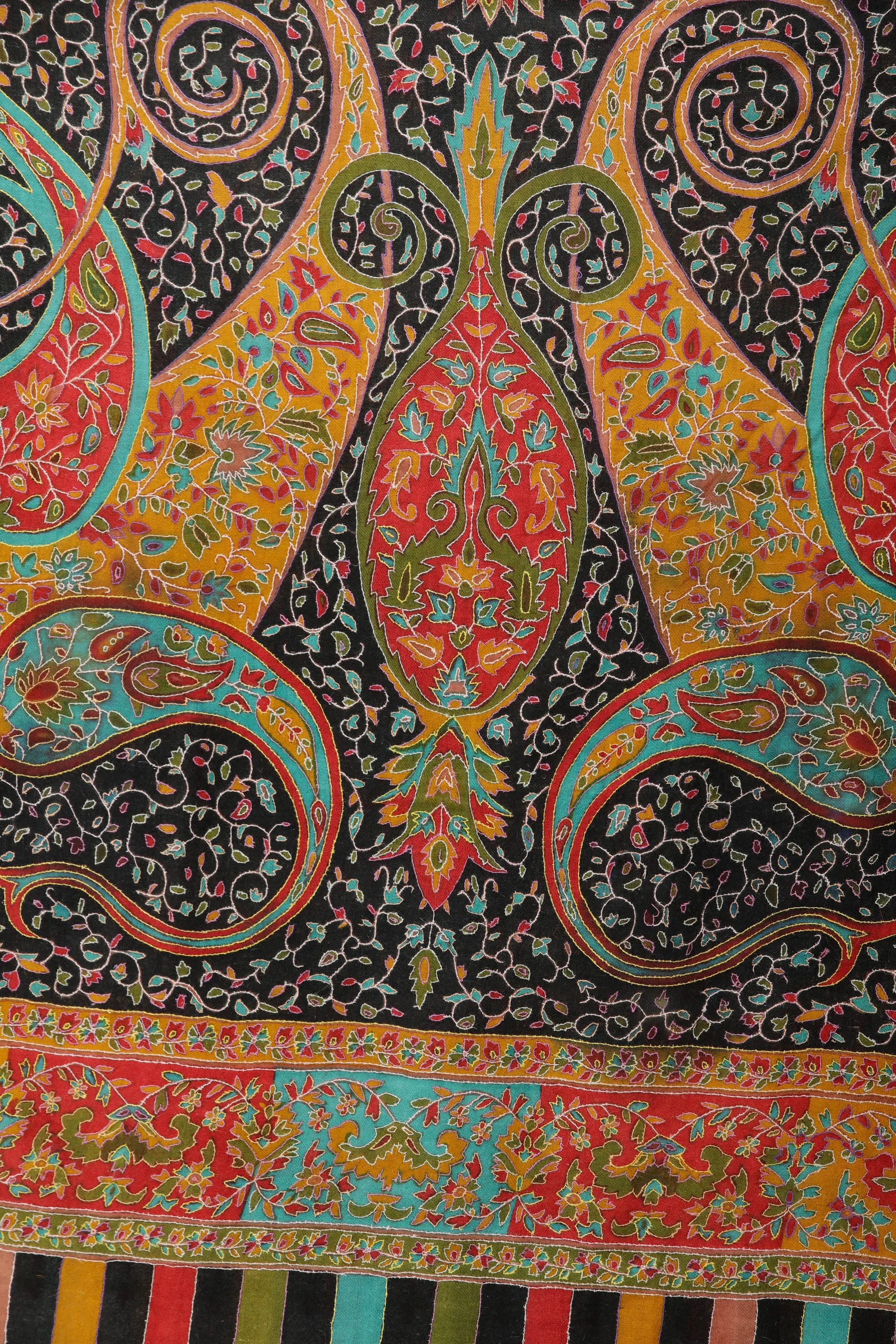The luxury and price of this one shawl could be understood once you consider that an average male of the endemic Hyrcus goat species, which roams eye-wateringly high Himalayan altitudes, yields annually just enough moult for a fraction of a scarf. Add to that the fact that it takes great degrees of skill, labour, and time to turn it into fabric, dye it, and embroider it to produce what you see on this page. The abundance of floral motifs, highly characteristic of kalamkari art, has been done against non-uniform pastel-coloured panels. Note how the same colours have been put into the stripes along the edges.