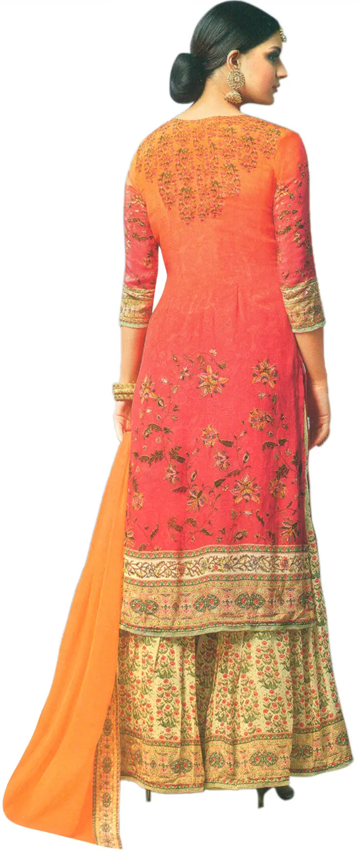 Summer-Melon Flared-Palazzo Salwar Kameez Suit with Zari-Woven Florals and Motifs