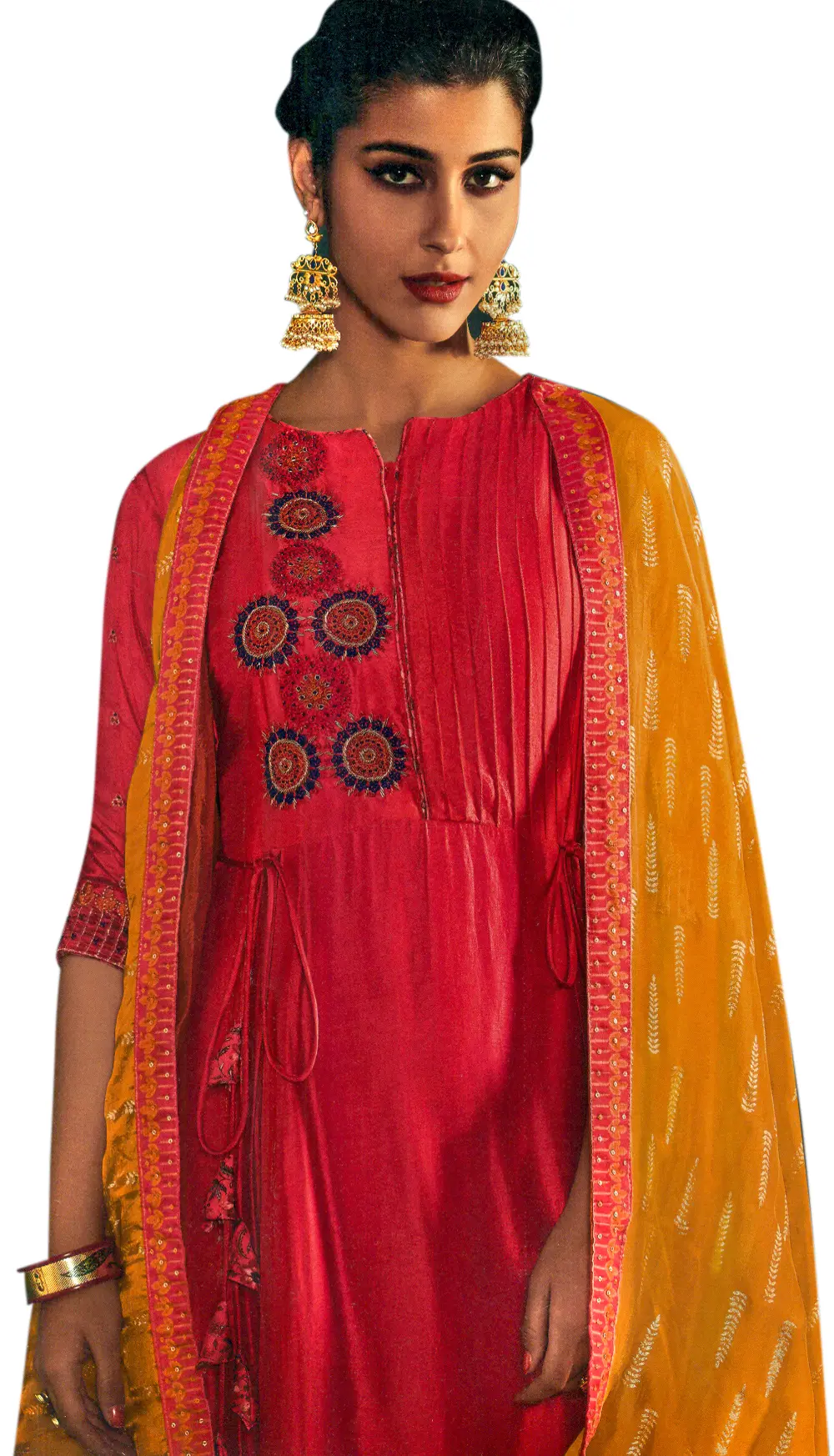 An A-line floor length suit captures the heart of a woman by its elegant fall and perfect fit, such as the one shown here in a vibrant cayenne color with a deep yellow dupatta forming a perfect combination in the wardrobe of a newly wed. The most alluring feature is the ease at which it falls, forming smooth pleats, starting from the waist and continues till feet; upper half is pleated and cut to give a body fir with three-forth sleeves.