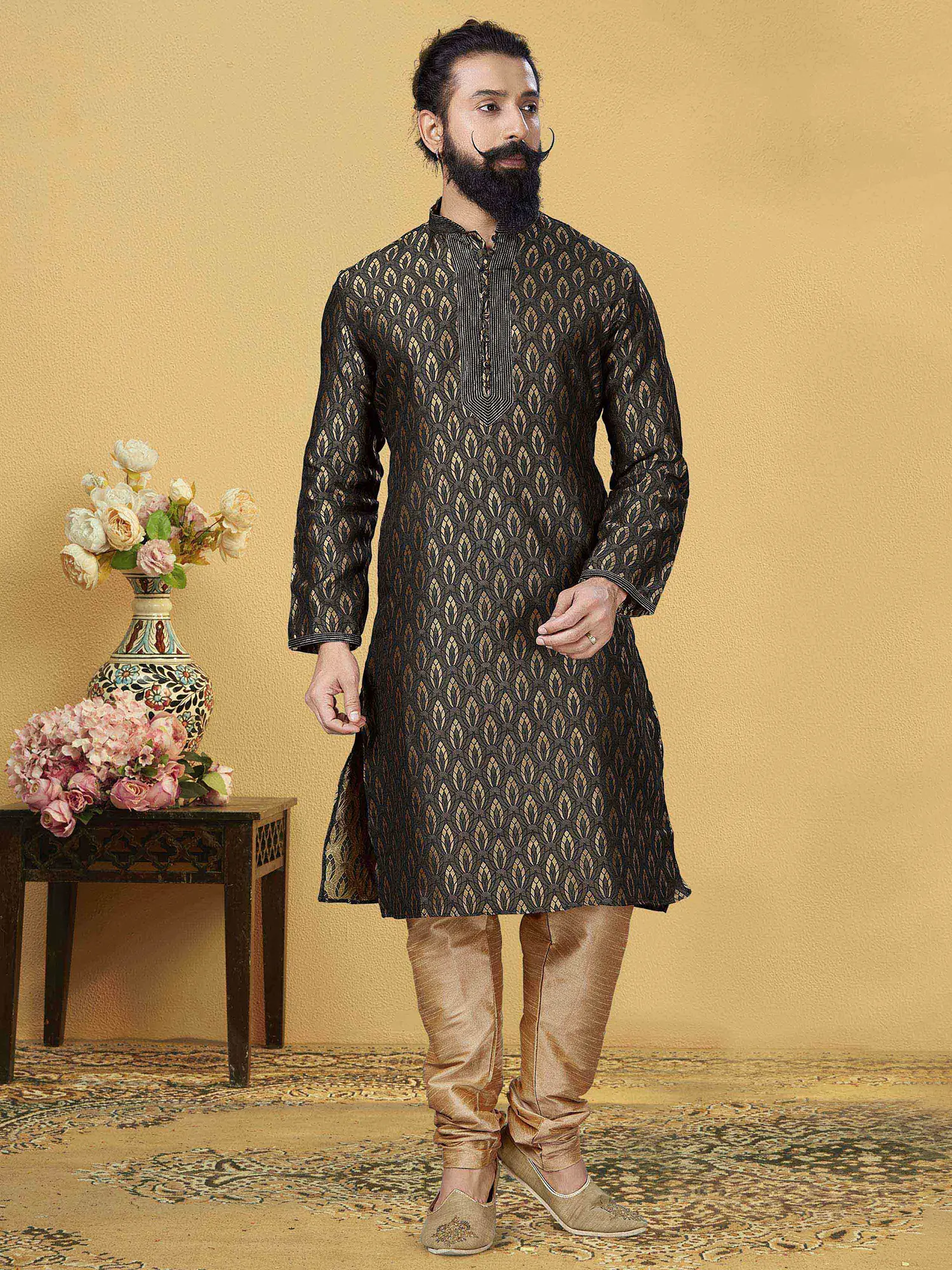 This Cedar Brown Traditional Kurta Pajama Set in Jacquard Silk with Tassels Stole is a fine set of apparel that has been created to assist men in achieving the best look for their special day. The combination of Cedar Brown with Black combination brings out the best of the two regal colors and infuses it with the set. The stole with tassels adds a flair side to the serious attire and makes it more approachable.