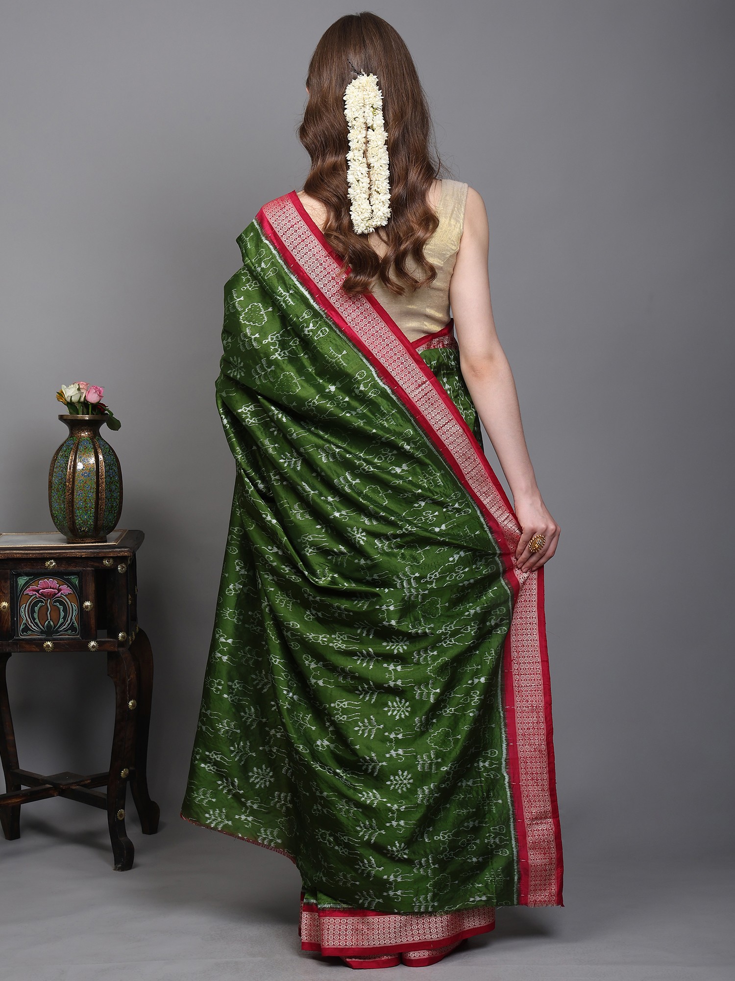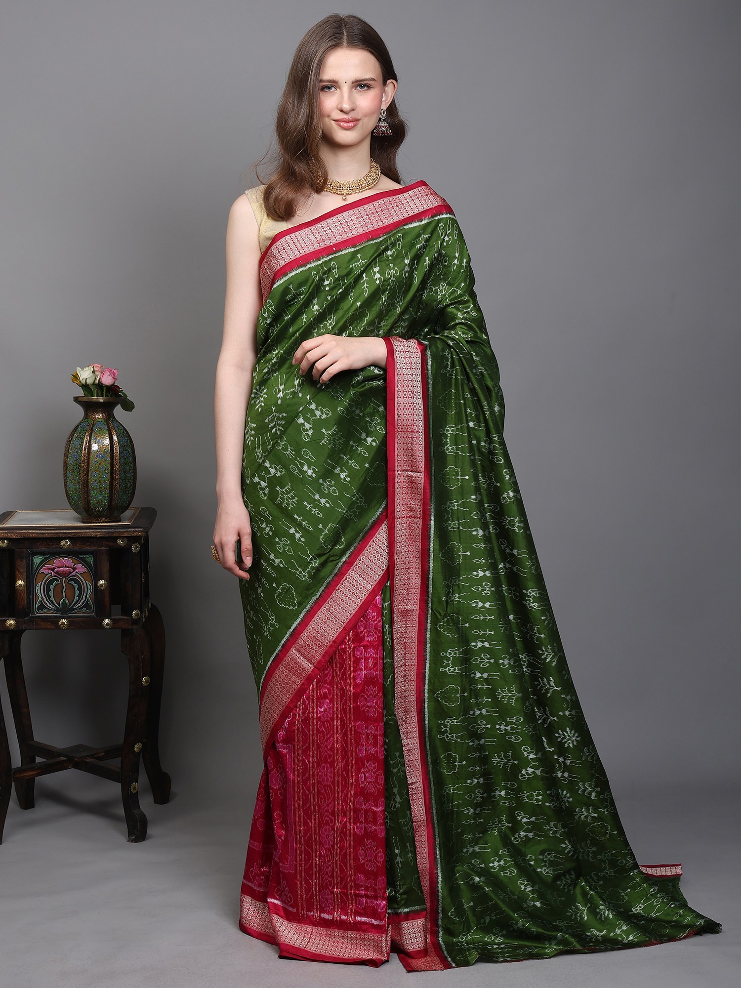 Cedar-Green Pure Silk Ikat Handloom Saree from Sambalpur with Woven Warli Art Motifs