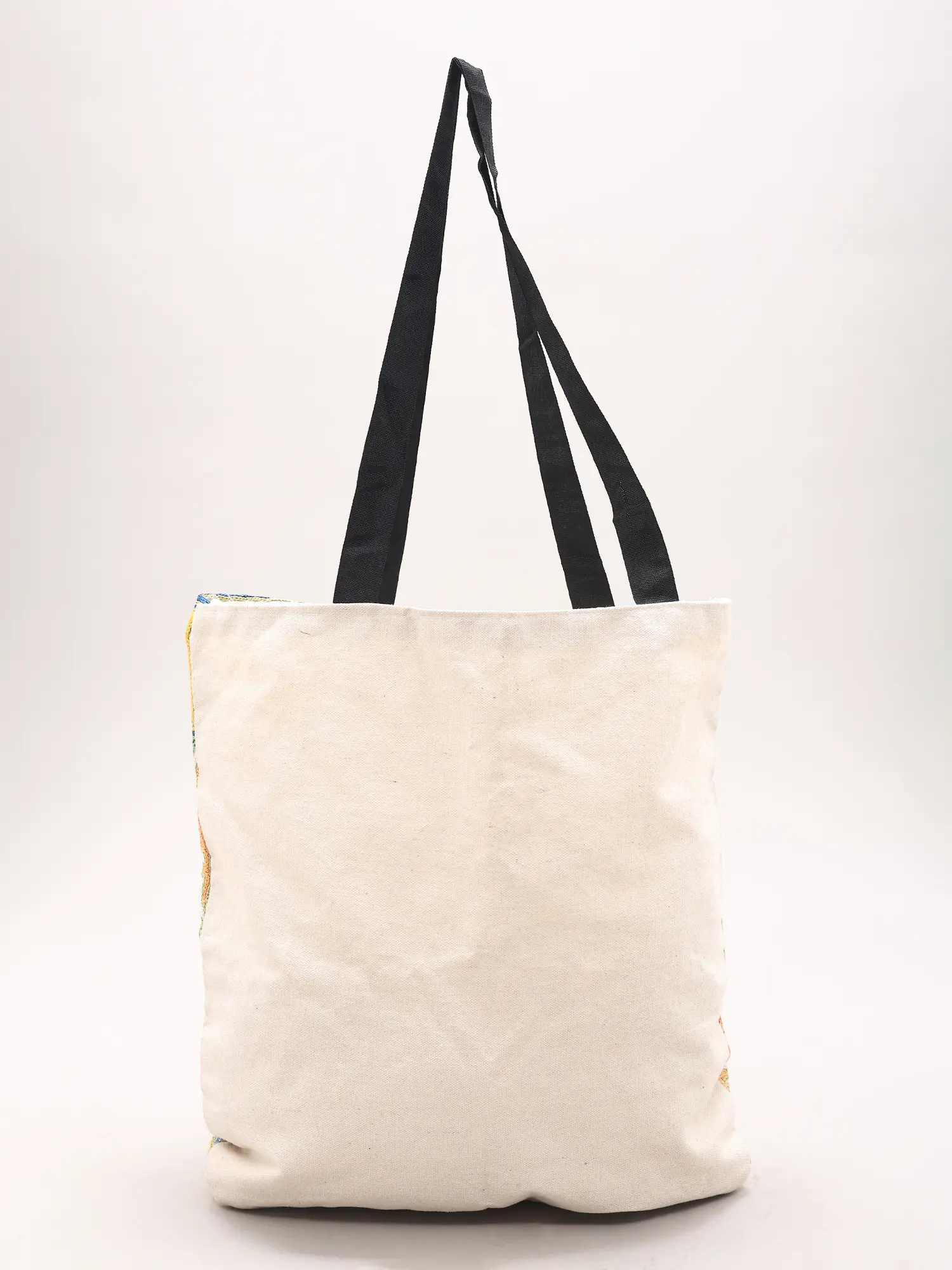 Sturdy black cotton handles ensure comfortable carrying.