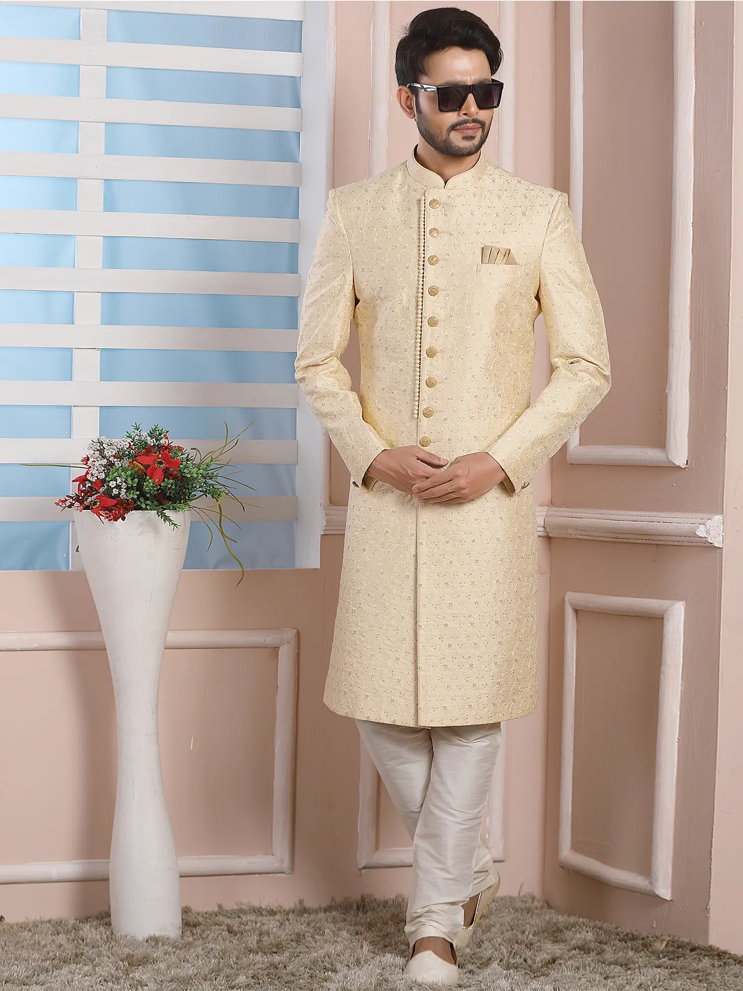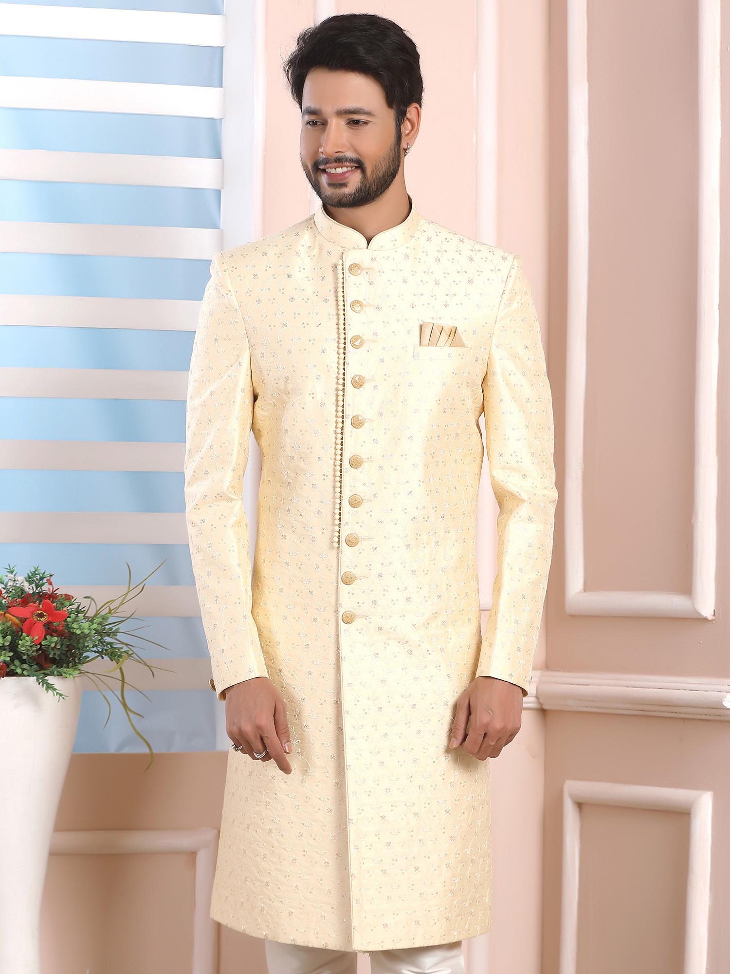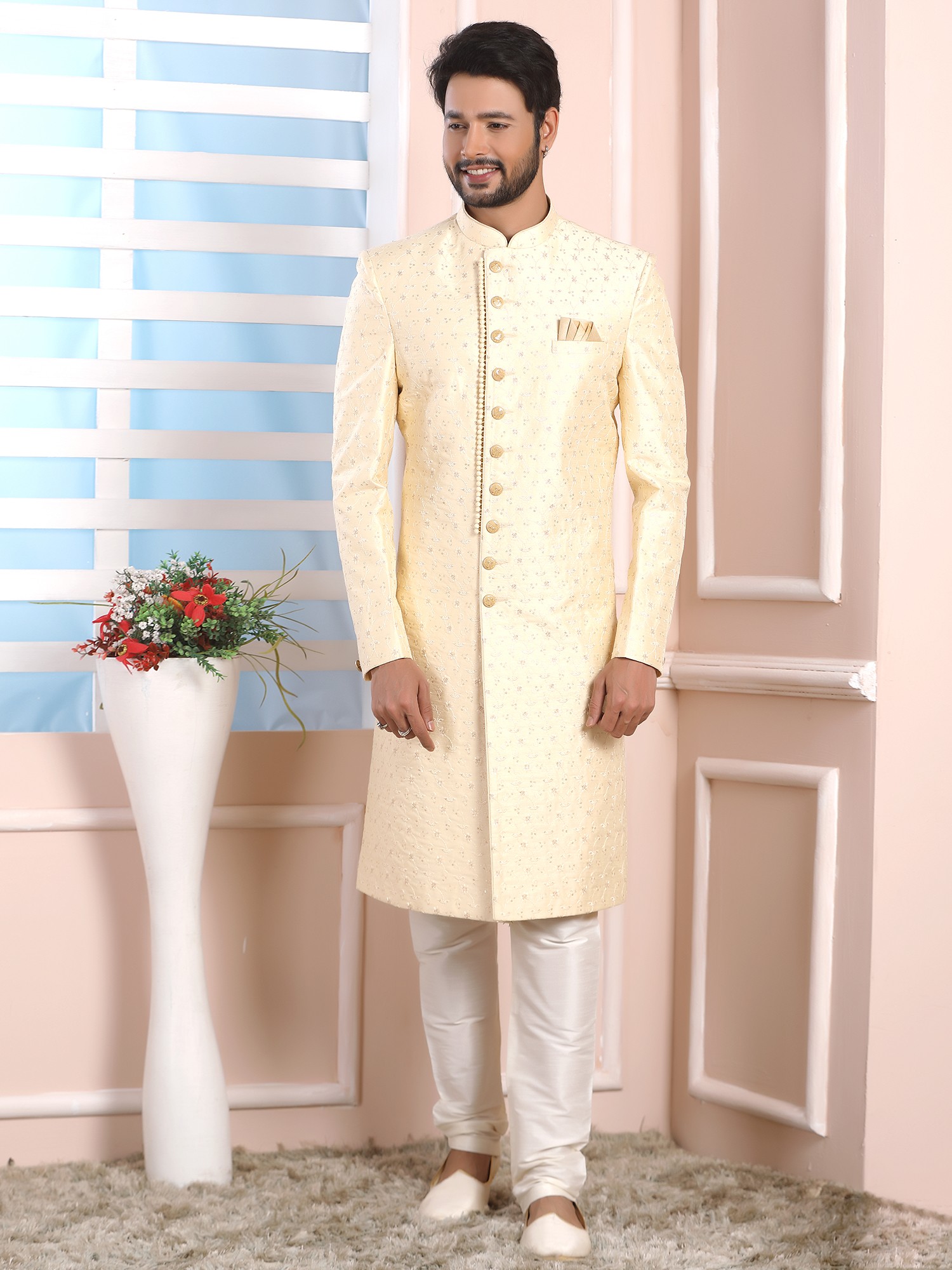 Elegant Jacquard Silk Indo Western Sherwani With Luxe Dupion Art Silk Aligarhi Pant For Wedding Sangeet Glam
