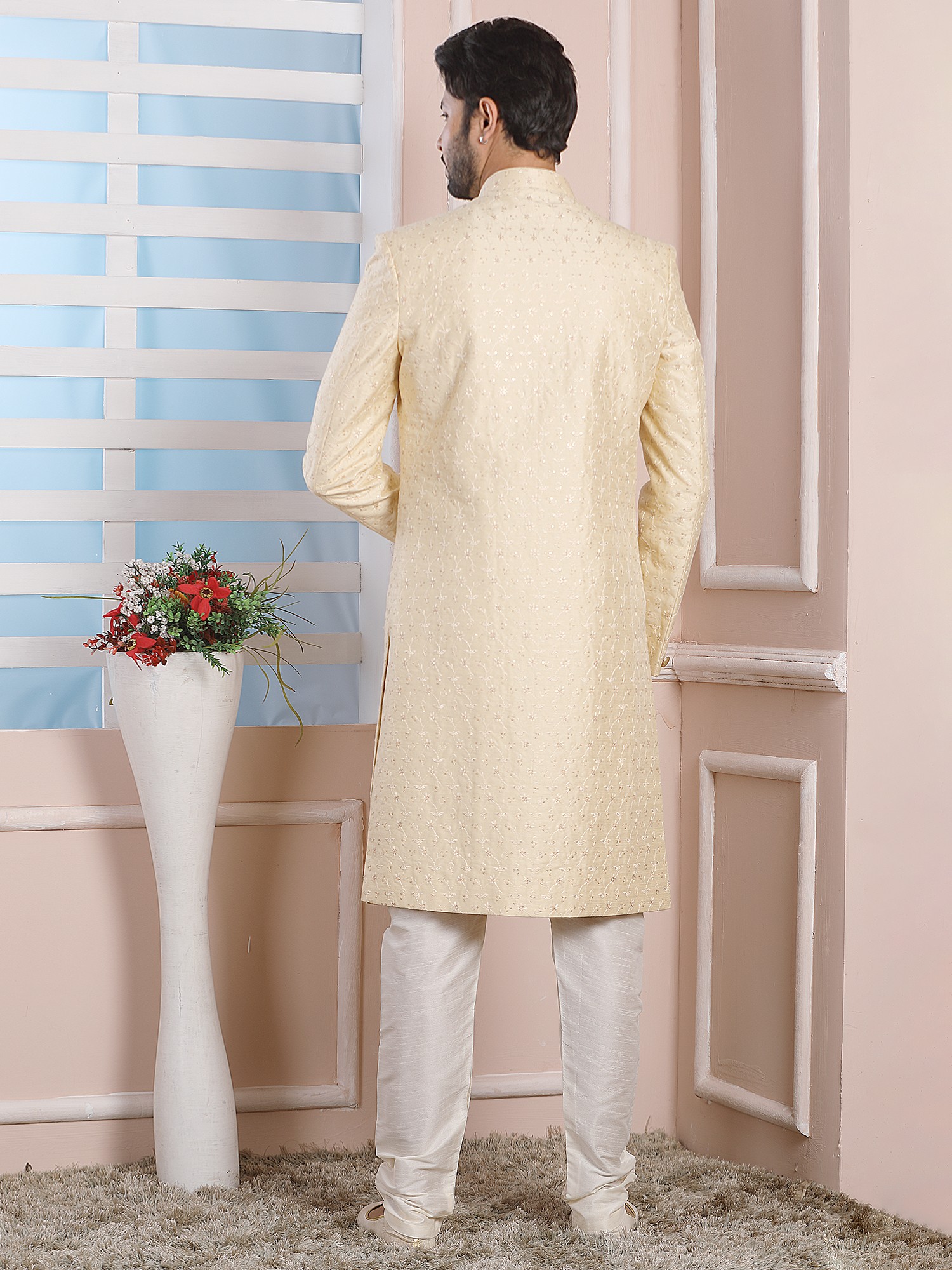 Imported Jacquard Silk Indo Western Sherwani With Dupion Art Silk Aligarhi Pant For Wedding Groom Men
