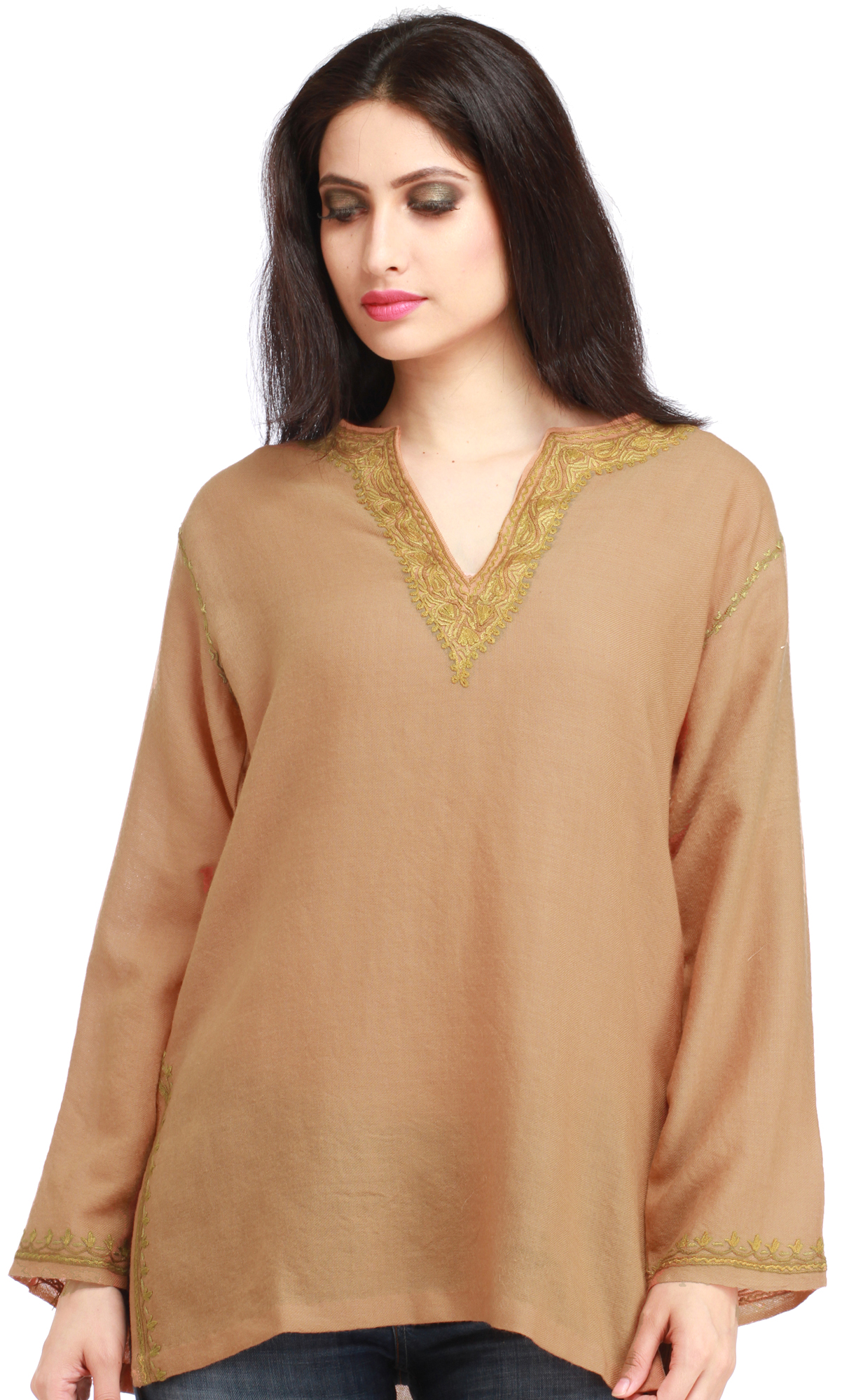 Banana-Crepe Pure Wool Short Kurti with Aari Embroidered Flowers from Kahsmir