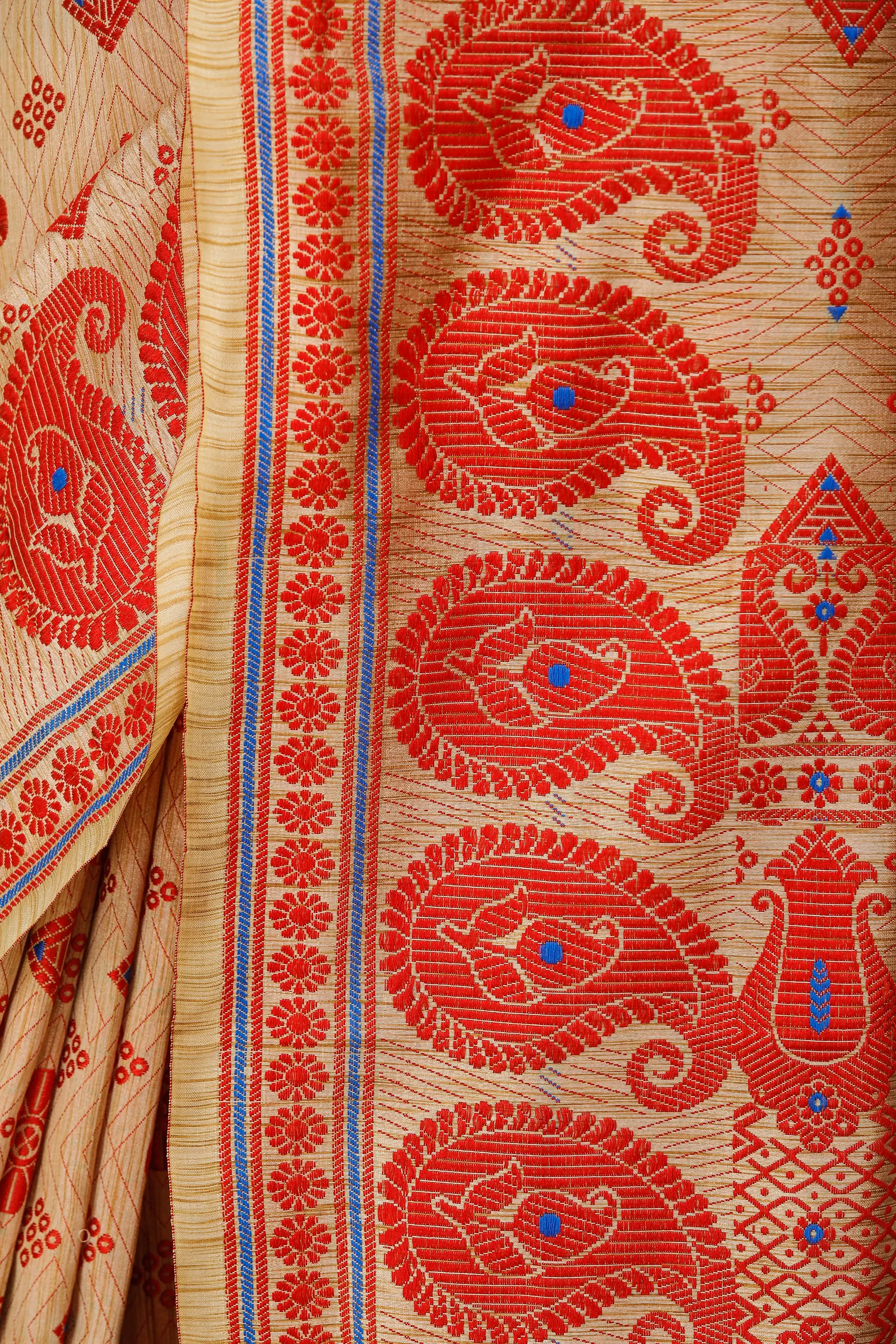 Beige Saree from Assam with Auspicious Woven Bootis and Florals on Border