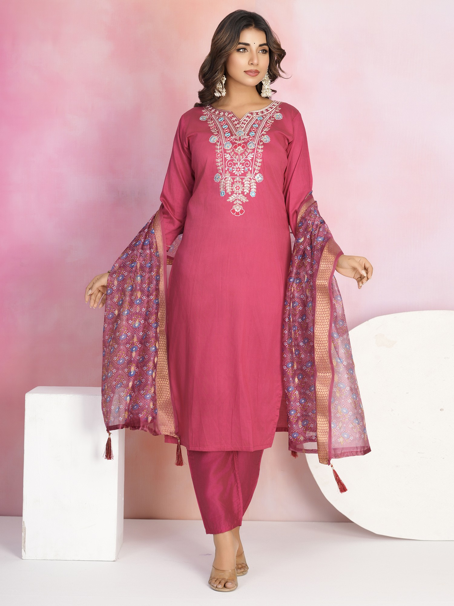 Elegant Floral Embroidery Chanderi Festive Wear Kurta Set With Attractive Printed Organza Dupatta