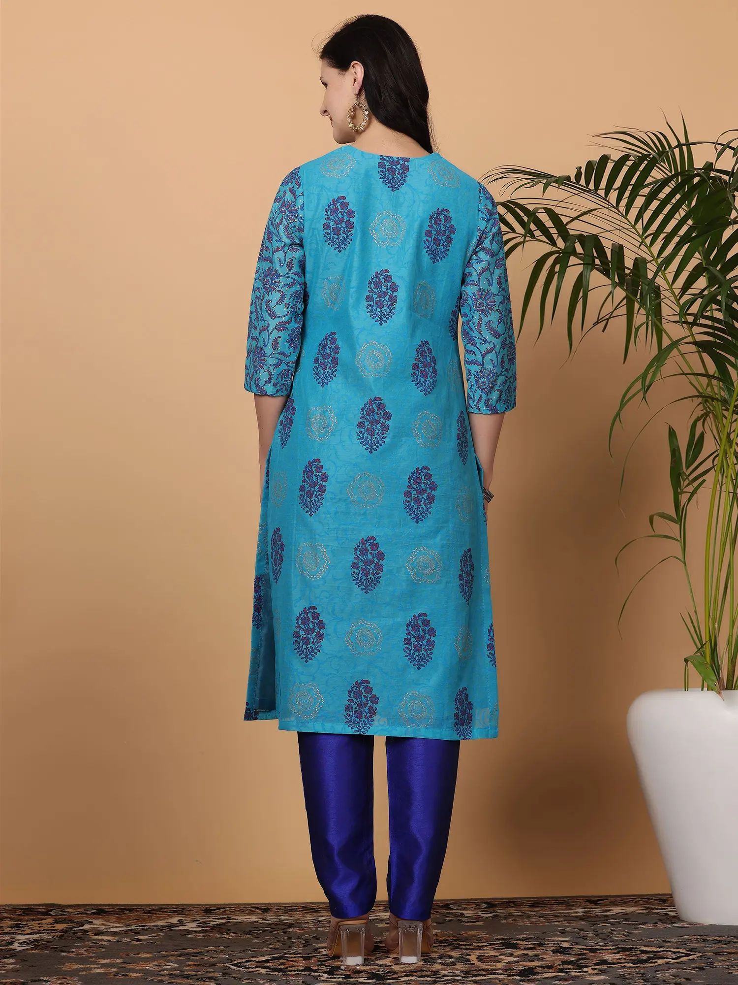 The kurta itself is a masterpiece of understated elegance. Its silhouette is designed for comfort and style, with a flattering neckline and three-quarter sleeves that add a touch of sophistication. The interplay of the floral prints and delicate golden accents creates a visually stunning effect, ensuring you stand out in any gathering. Complementing the kurta are the richly hued silk pants. Their smooth texture and vibrant royal blue color provide a beautiful contrast to the kurta, creating a harmonious and balanced look. The luxurious feel of the silk fabric ensures both comfort and a polished finish, making these pants perfect for extended wear.
