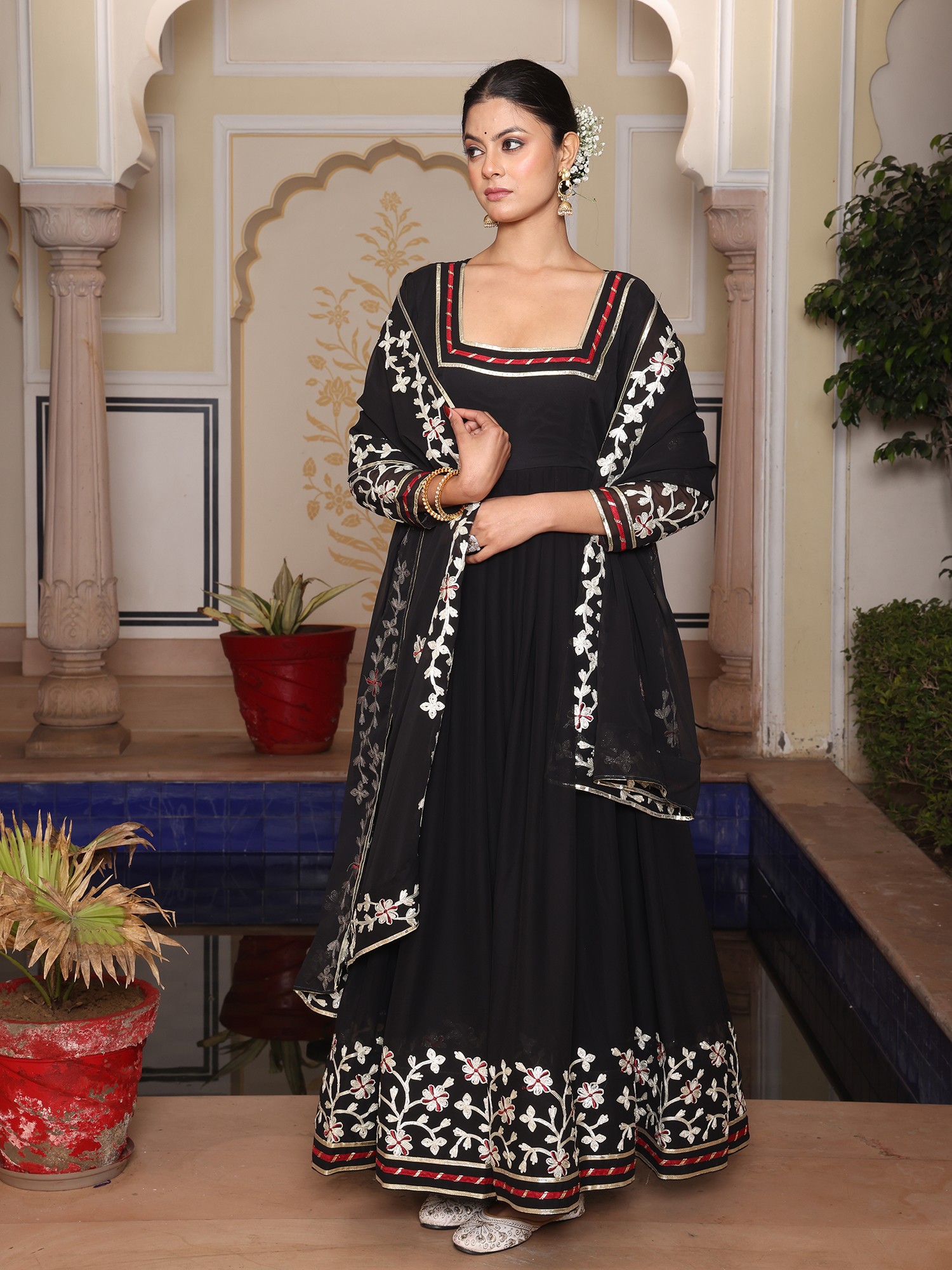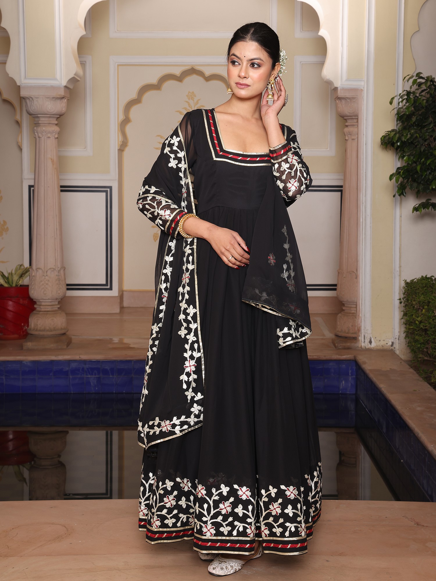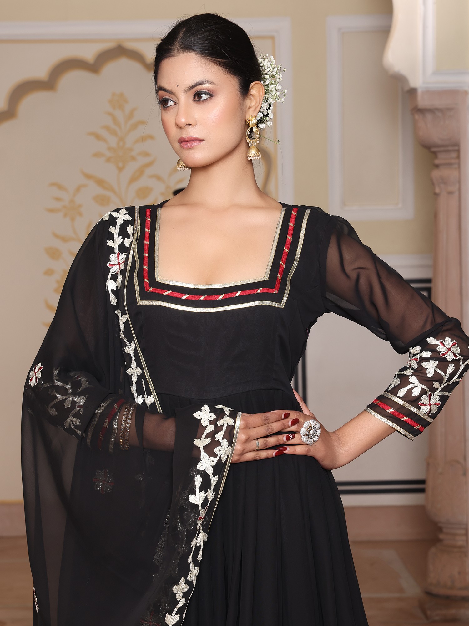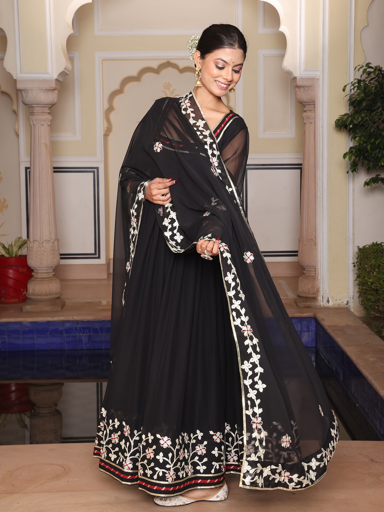Charming Georgette Anarkali Suit With Dupatta And Crepe Bottom Highlighted By Elegant Ribbon Work Embroidery