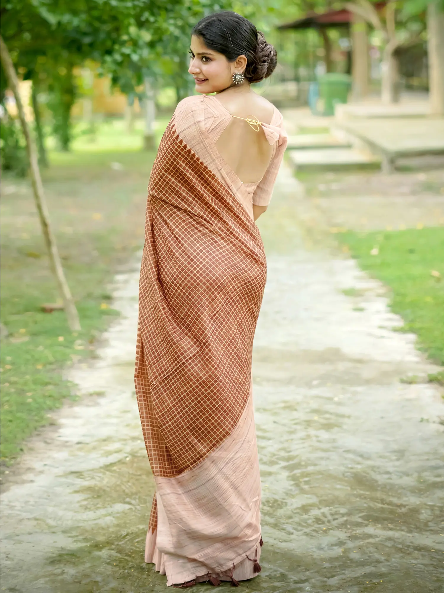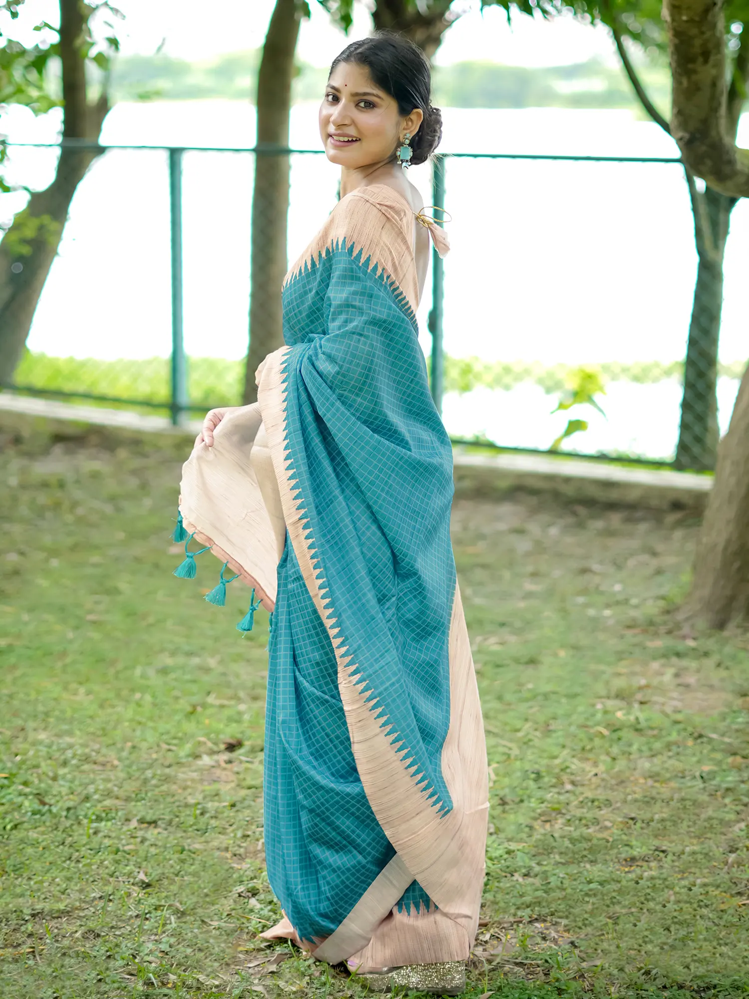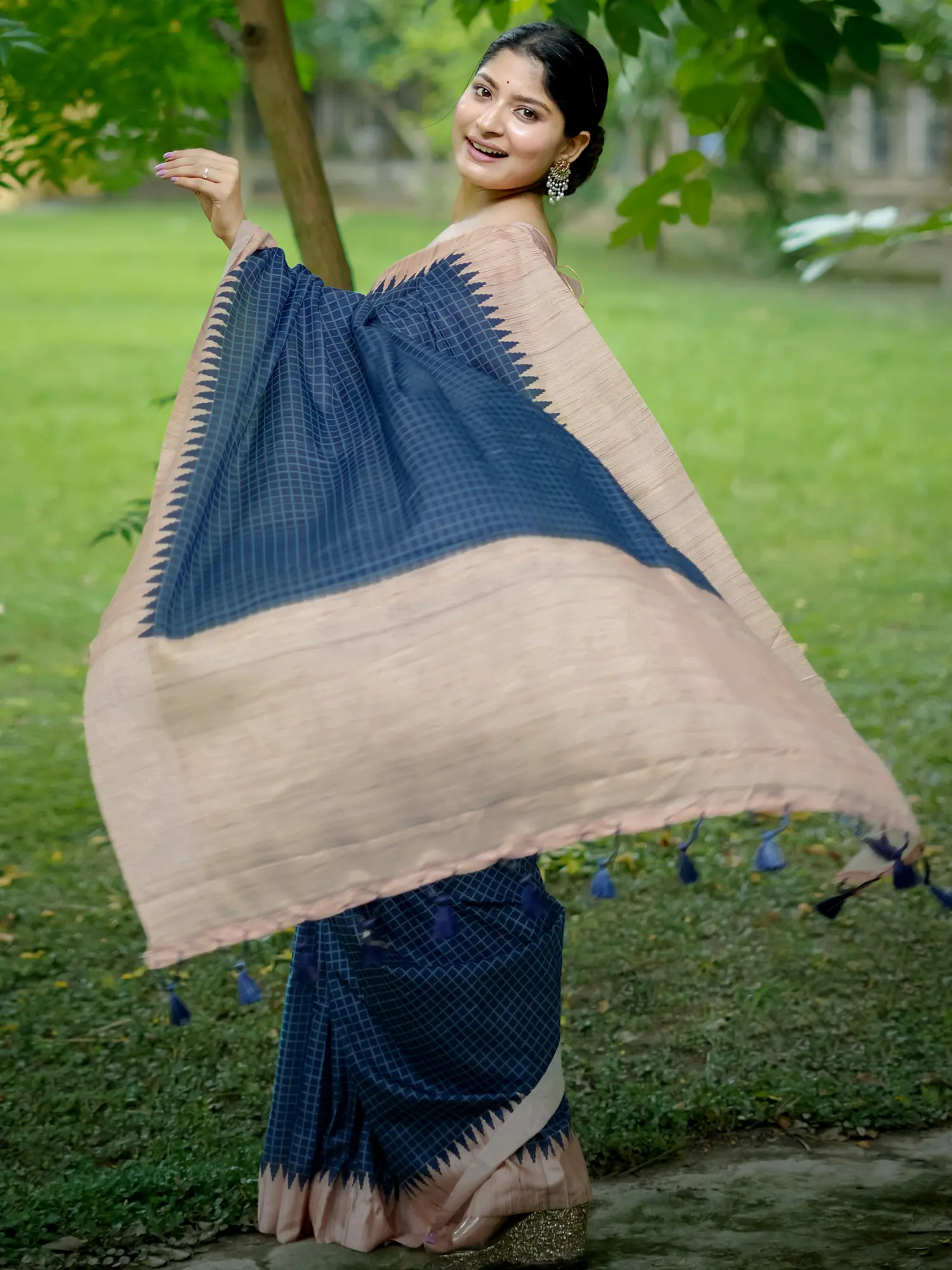 The body of the saree features an all-over check pattern, adding a touch of contemporary flair to the traditional design. The careful arrangement of the checks creates a visually appealing texture that catches the light beautifully. This captivating pattern enhances the overall depth and dimension of the saree. The border is adorned with a temple design, adding a touch of classic Indian artistry. The intricate detailing of the temple border elevates the saree, making it perfect for festive occasions. The pallu is enhanced with delicate tassels, adding a playful and feminine touch. These tassels sway gracefully with every movement, creating a captivating effect.