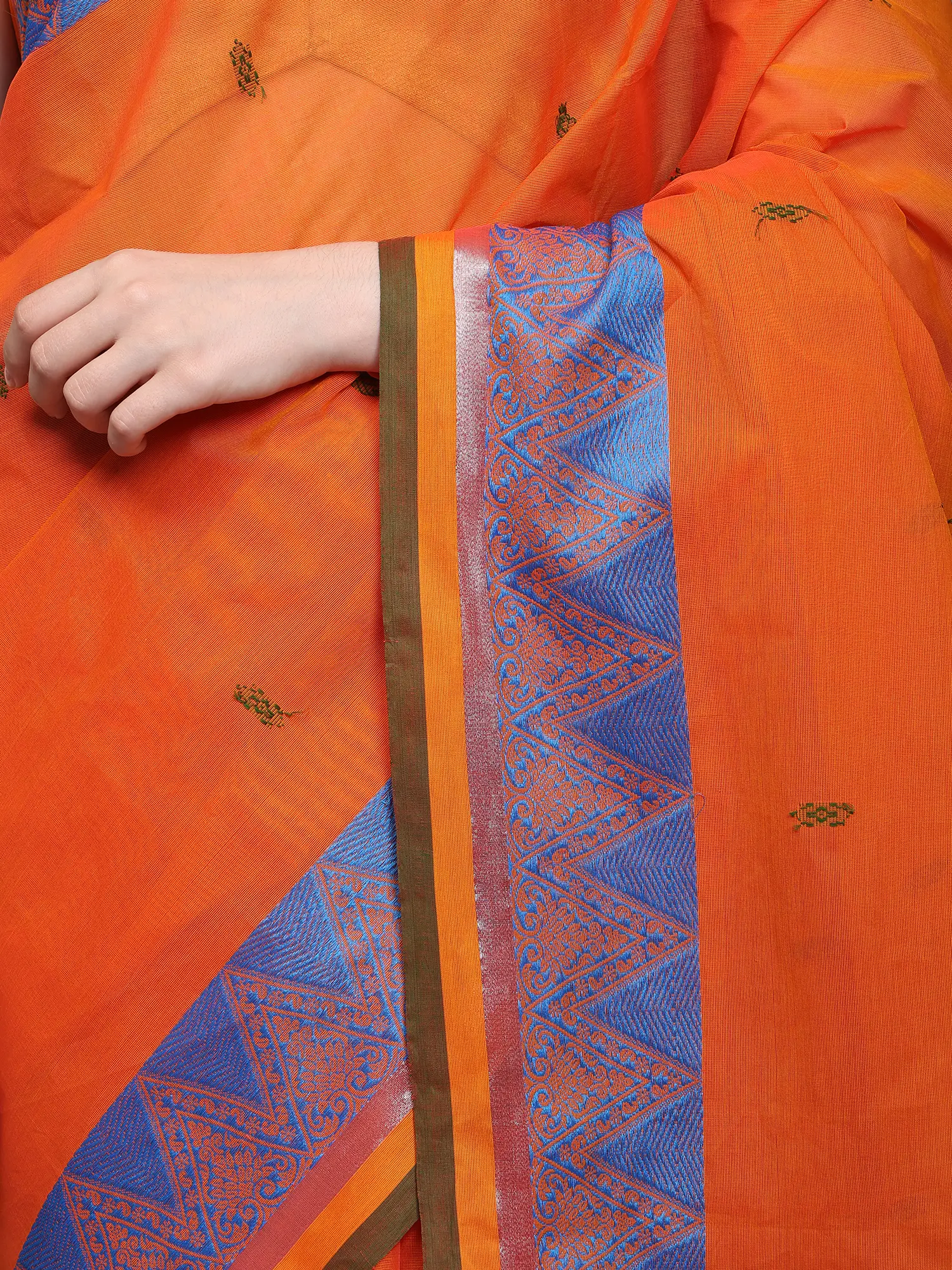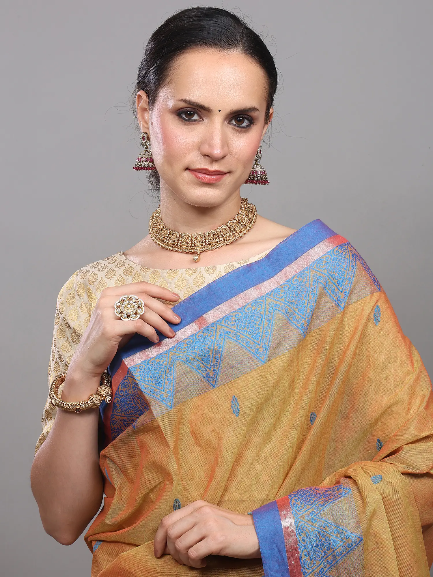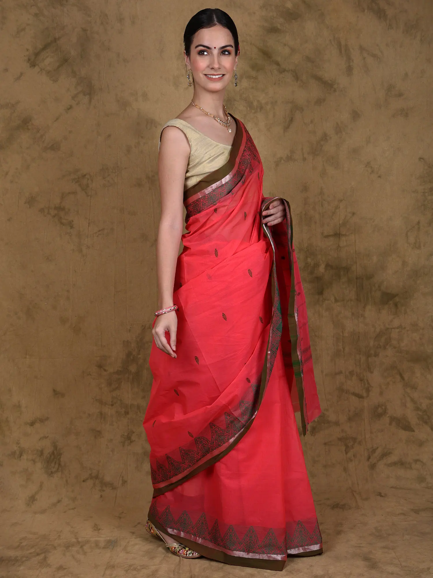 Burnt-Brick Pure Cotton Buddha with Fauna-Flora Printed Kalamkari Saree and Zari Border