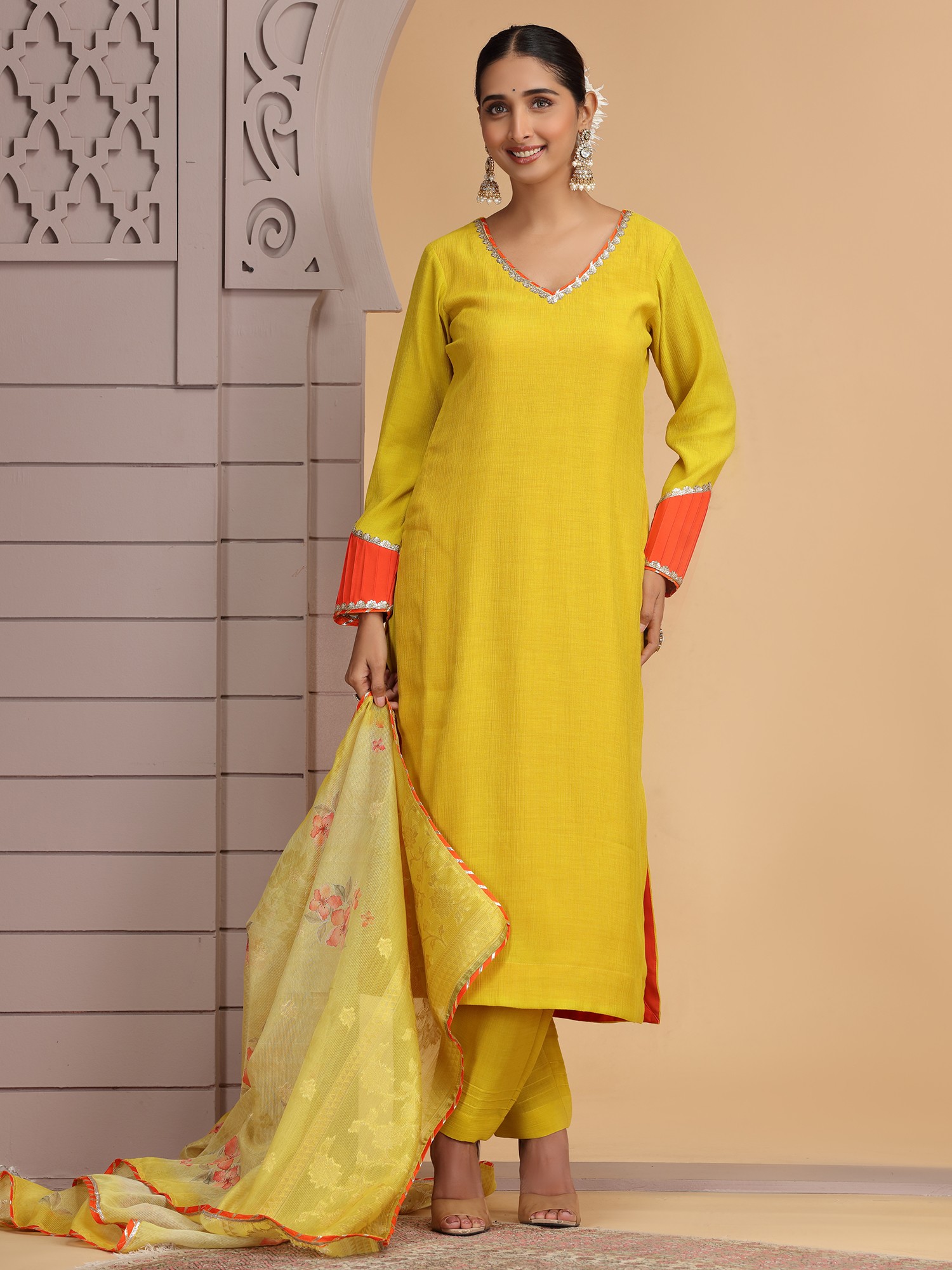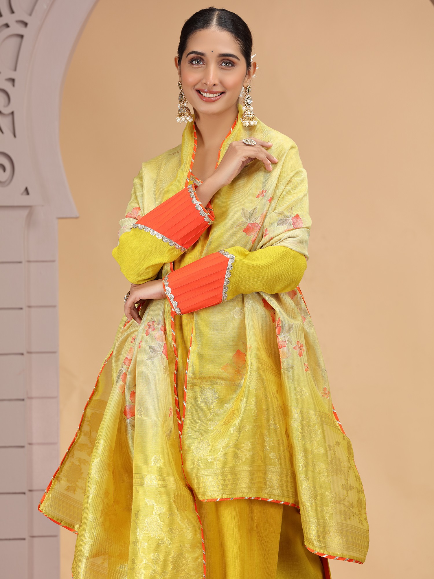 The flowing silhouette of the chiffon salwar suit is designed for both comfort and elegance, providing a flattering and graceful outline. Its vibrant yellow hue is complemented by subtle, tasteful embellishments along the neckline and the edges of the dupatta, hinting at careful attention to detail. The Chanderi jacquard dupatta features a delicate floral motif interspersed with traditional woven patterns, creating a symphony of textures and colors that draw the eye.