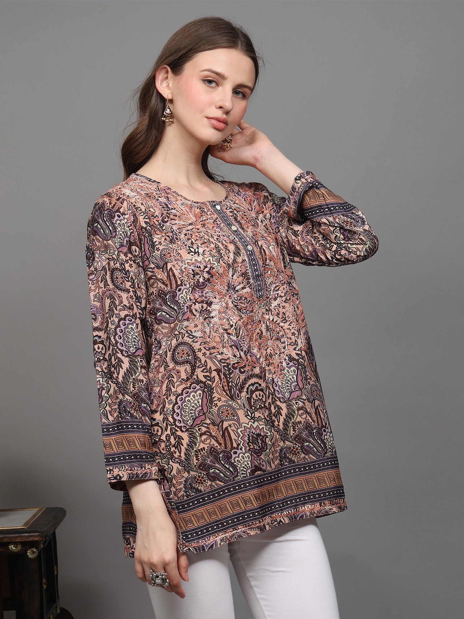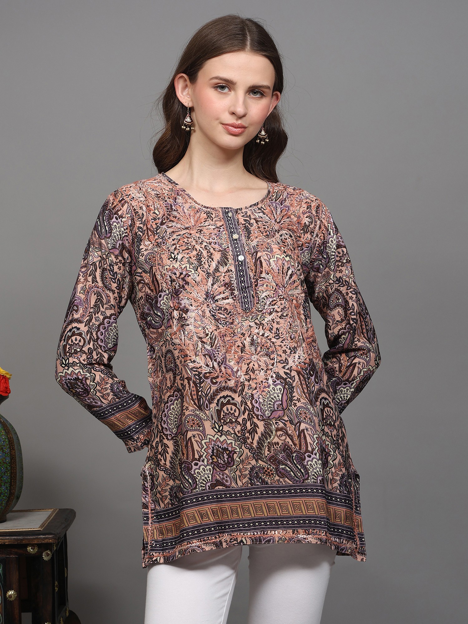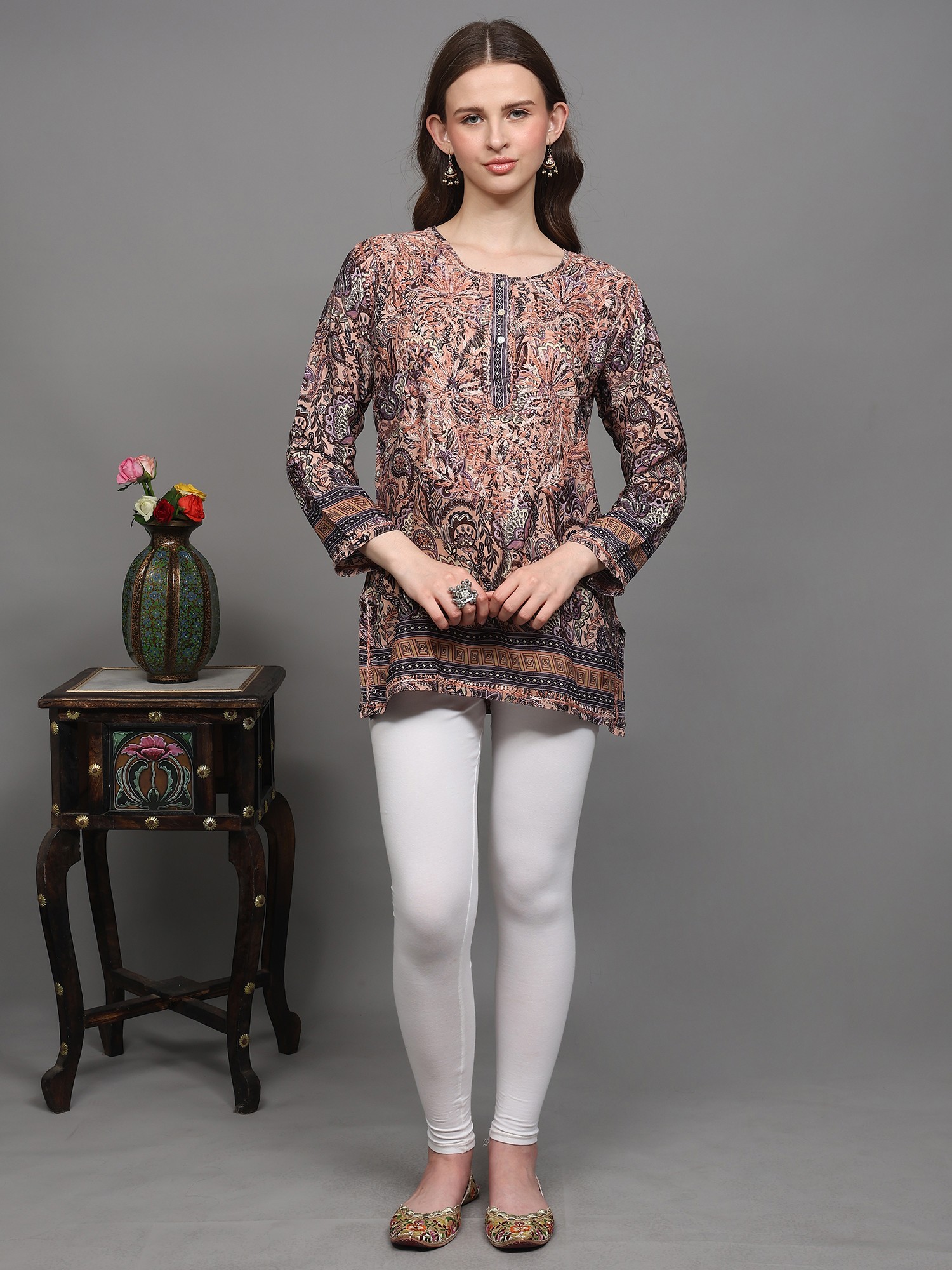 Multicolor Printed Flowers Short Kurti with Embroidery on Neck
