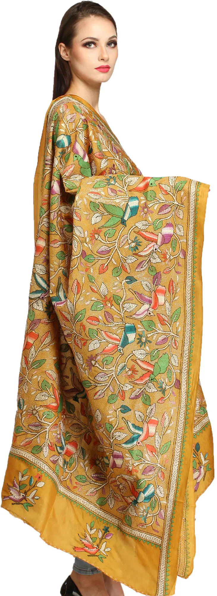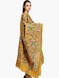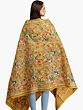Immerse yourself in the exquisite craftsmanship of this pure silk dupatta, a masterpiece of traditional Kantha embroidery originating from the vibrant cultural hub of Kolkata. This stunning stole is more than just an accessory; it's a wearable piece of art, a testament to generations of skill passed down through families of artisans. The base is a rich, inviting shade of Chinese yellow, a color that exudes warmth and elegance, reminiscent of the golden hues of a sun-drenched afternoon.