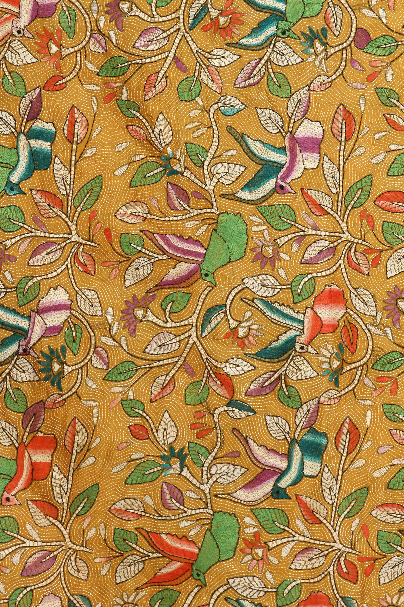The true magic of this dupatta lies in its densely embroidered surface. A breathtaking tableau of birds nestled amongst flourishing foliage unfolds before your eyes. Each bird, meticulously stitched with vibrant threads, appears captured mid-flight or perched gracefully on delicate branches. The natural motifs are rendered with incredible detail, from the intricate veining of leaves to the subtle curves of petals. Hues of emerald green, fiery orange, soft purple, and touches of crimson dance across the silk, creating a lively and harmonious composition. The Kantha stitch, characterized by its running stitch that creates a subtle texture and depth, brings the entire design to life, giving it a unique, hand-crafted feel. The border is framed by a delicate line of green and white embroidery, a subtle yet elegant accent that enhances the overall beauty of the piece.