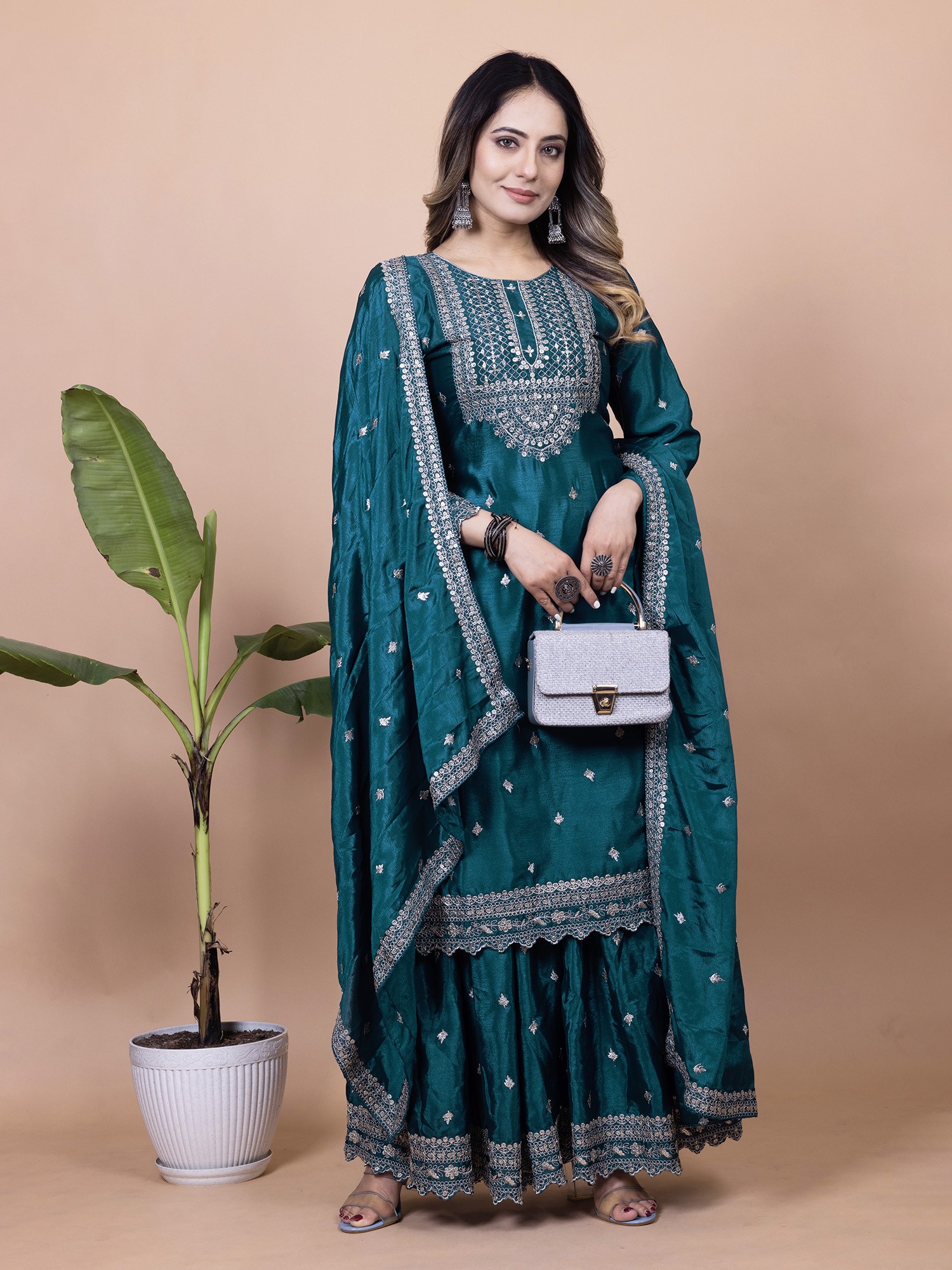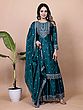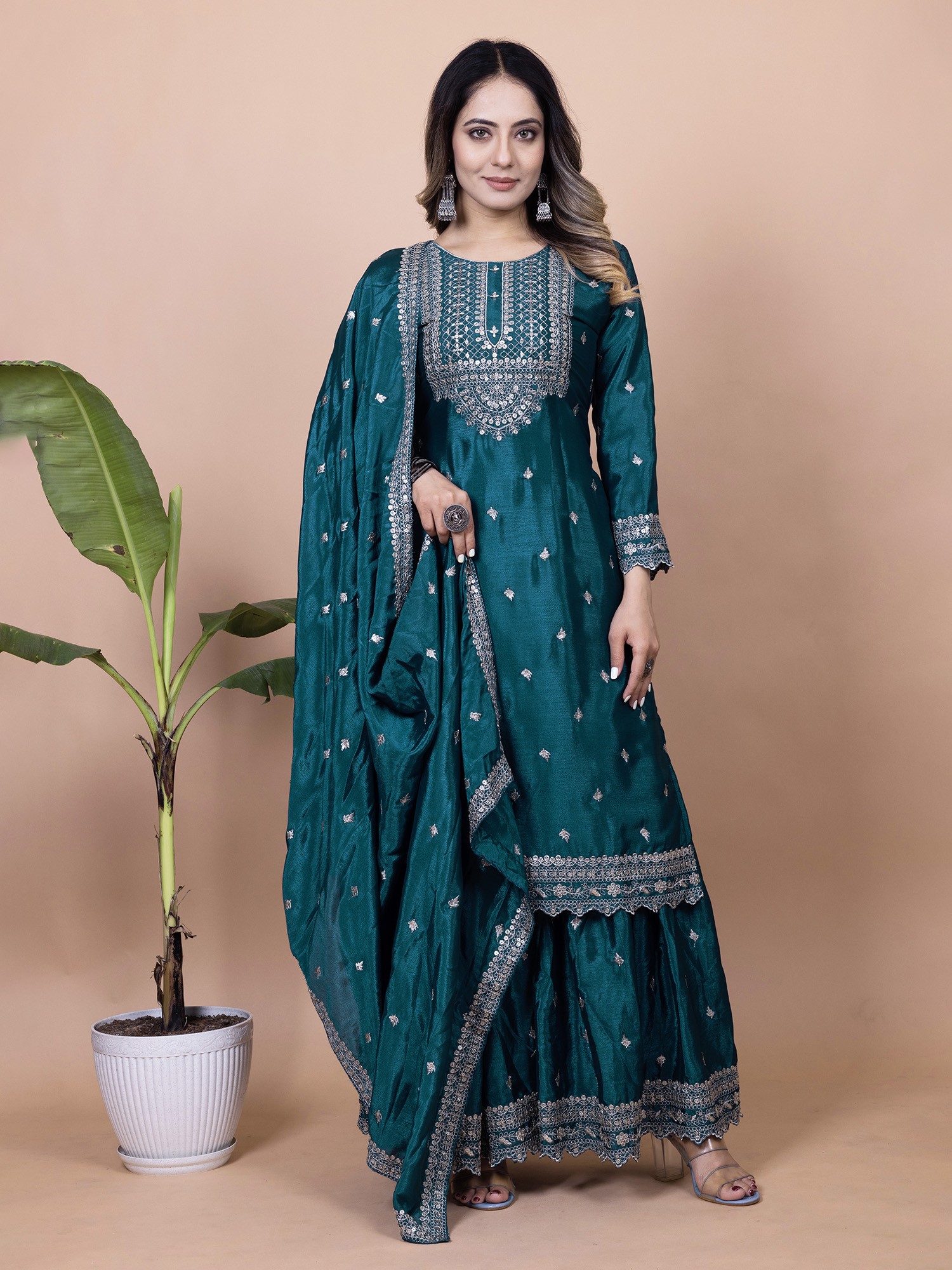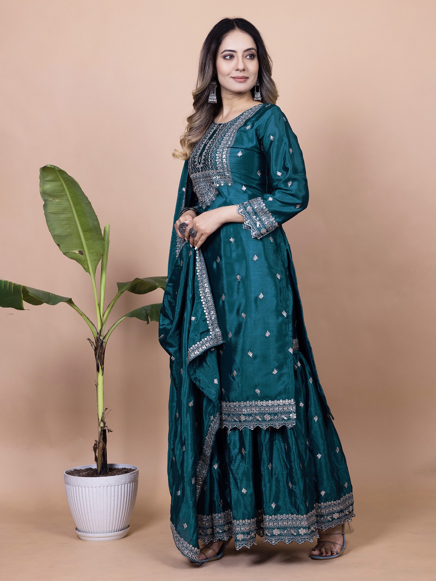 Chinon Thread Embroidery And Sequins Work Festive Wear Palazzo Suit With Matching Dupatta