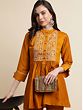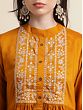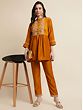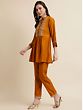 With the soft feel of chinon this embroidered co-ord set perfectly balances ethnic elements in a modern style. The top has a neat, buttoned collar with intricate and contrasting embroidery work, creating ornate floral details inspired by traditional Indian clothes. The pants are a beautifully tailored match for the top, with a hint of embroidery on the edge.