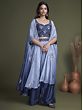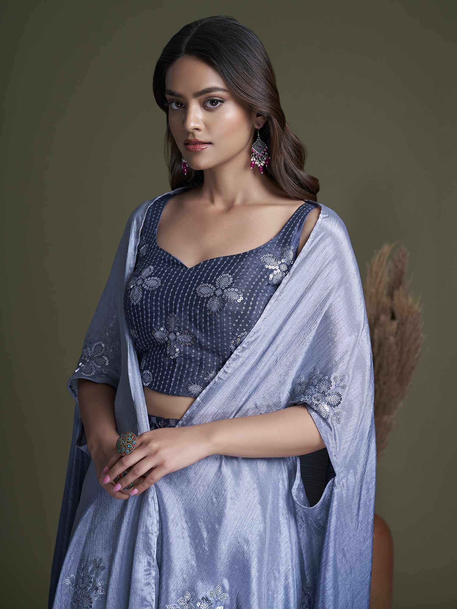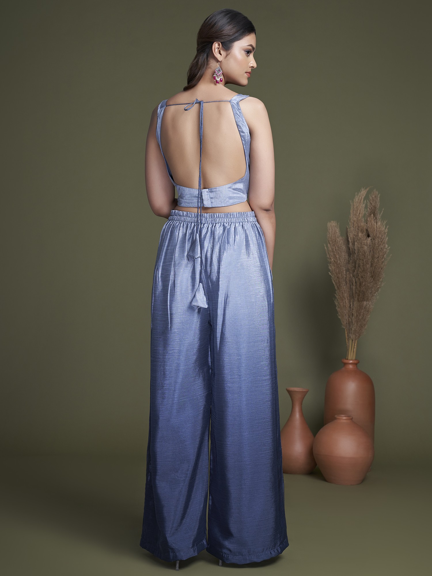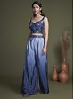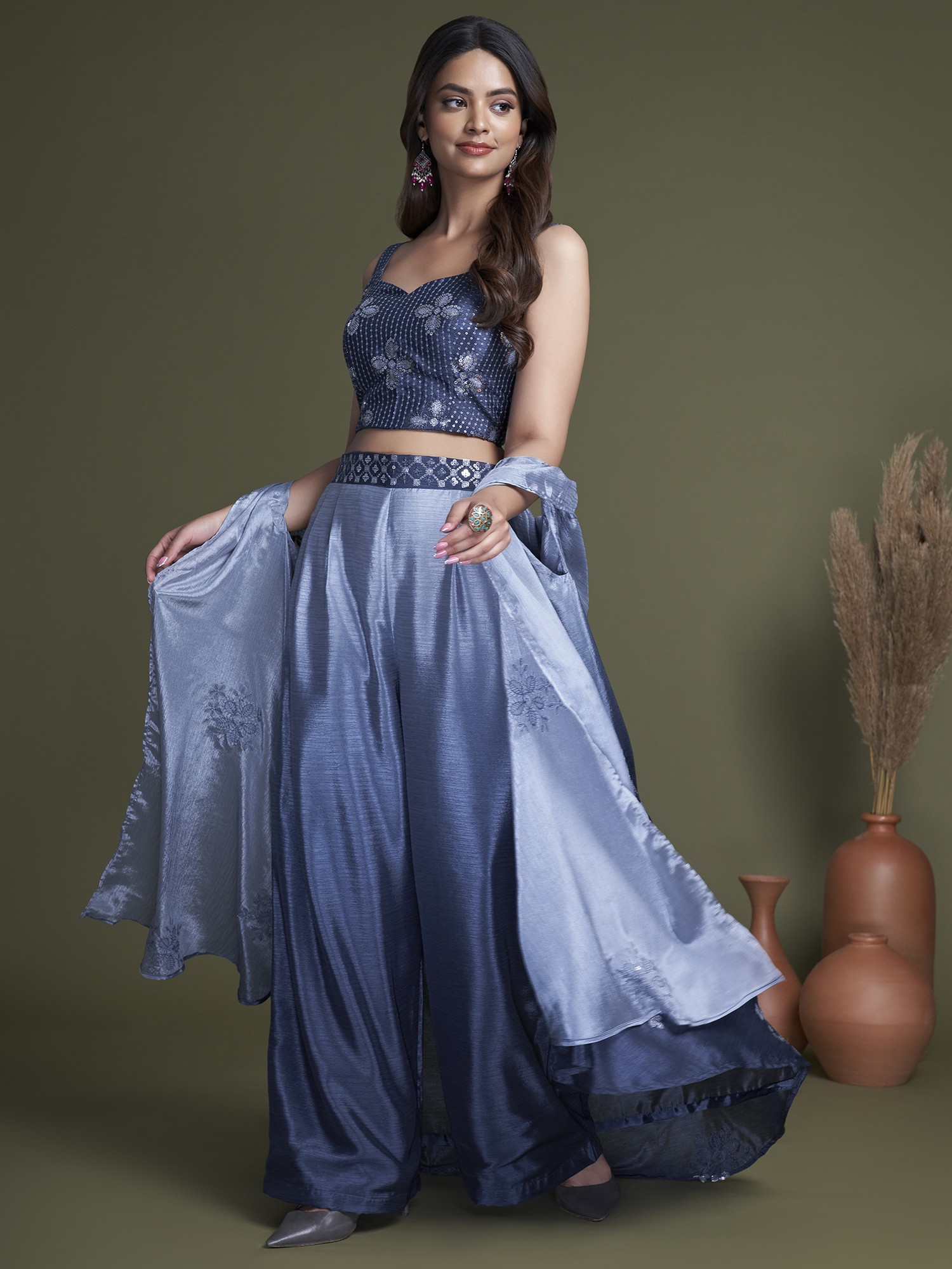 The Chinon Ombre Palazzo Crop-Top Suit with a Floral Motif Embroidered Jacket creates a modern style statement by playing with light and dark tones of the same color. This ensemble is a masterpiece of traditional Indian wear elevated to the next level. Classic sequins and eye-catching embroidery adorn the suit, adding a touch of understated elegance. The ombre effect in the palazzo pants and crop top adds depth, while the floral motif on the jacket enhances the overall allure. Ideal for those seeking a stylish fusion of contemporary and traditional, this outfit is a striking choice for any special occasion.