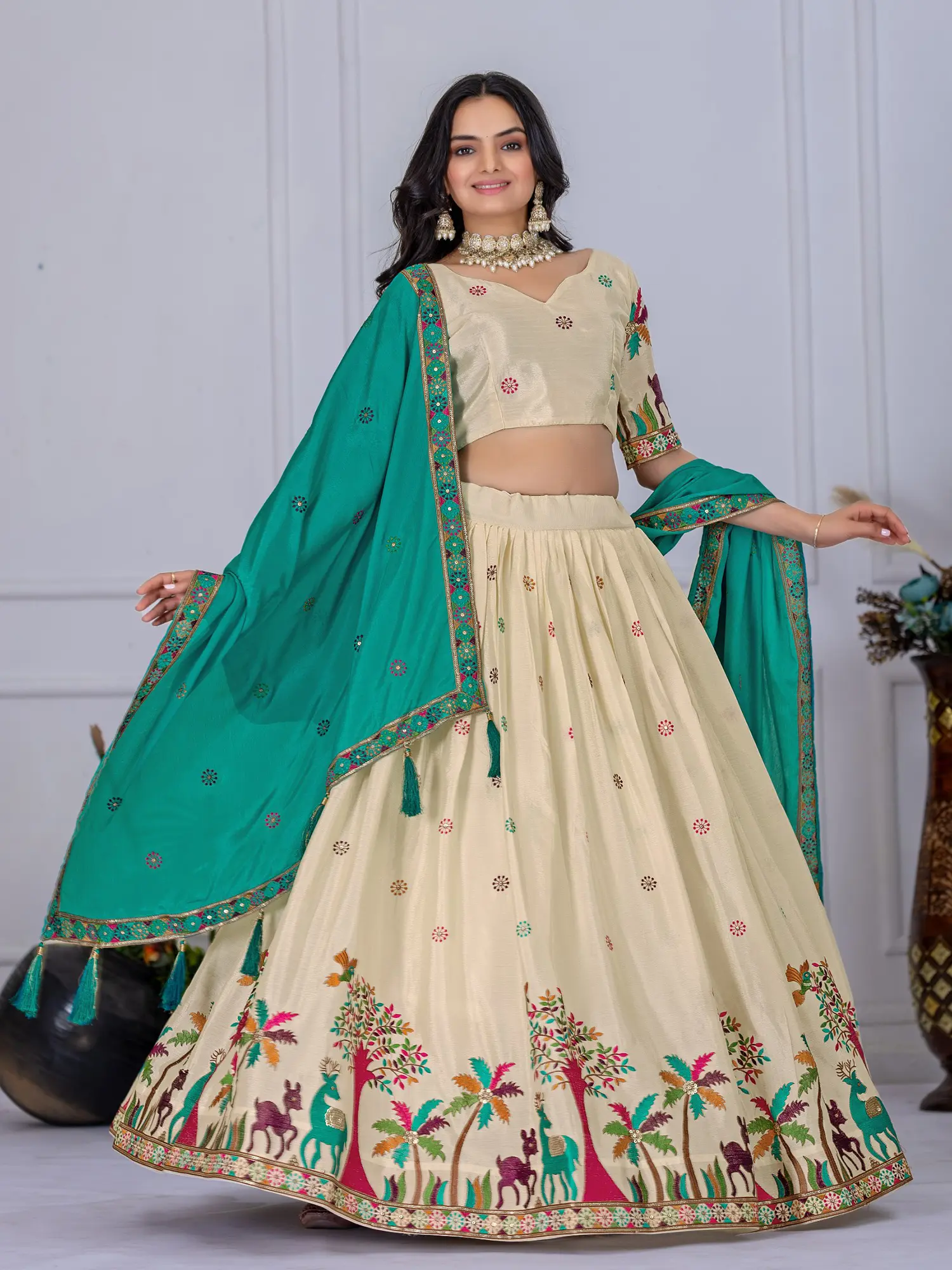Teal Taffeta Silk Beautiful Floral Zari Embroidery Lehenga Choli with Beige Sheer Dupatta