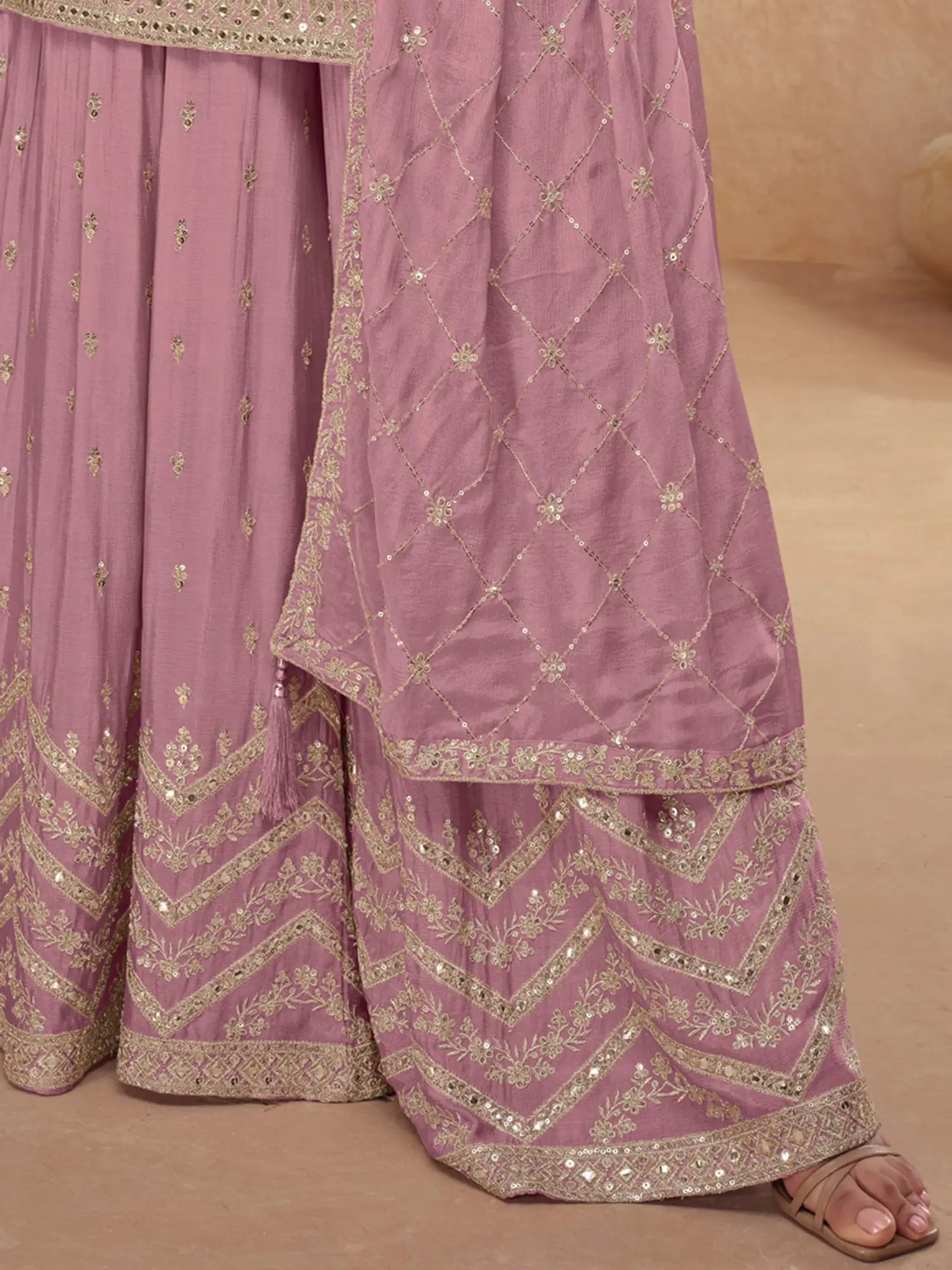 Crafted from Chinon fabric, this palazzo suit drapes beautifully and feels soft against the skin. The intricate thread embroidery showcases exceptional artistry, with delicate patterns that catch the light. Sparkling sequins are strategically placed to enhance the design and add a touch of celebratory shimmer. The coordinating dupatta completes the ensemble, featuring matching embroidery and sequins that tie the look together harmoniously.
