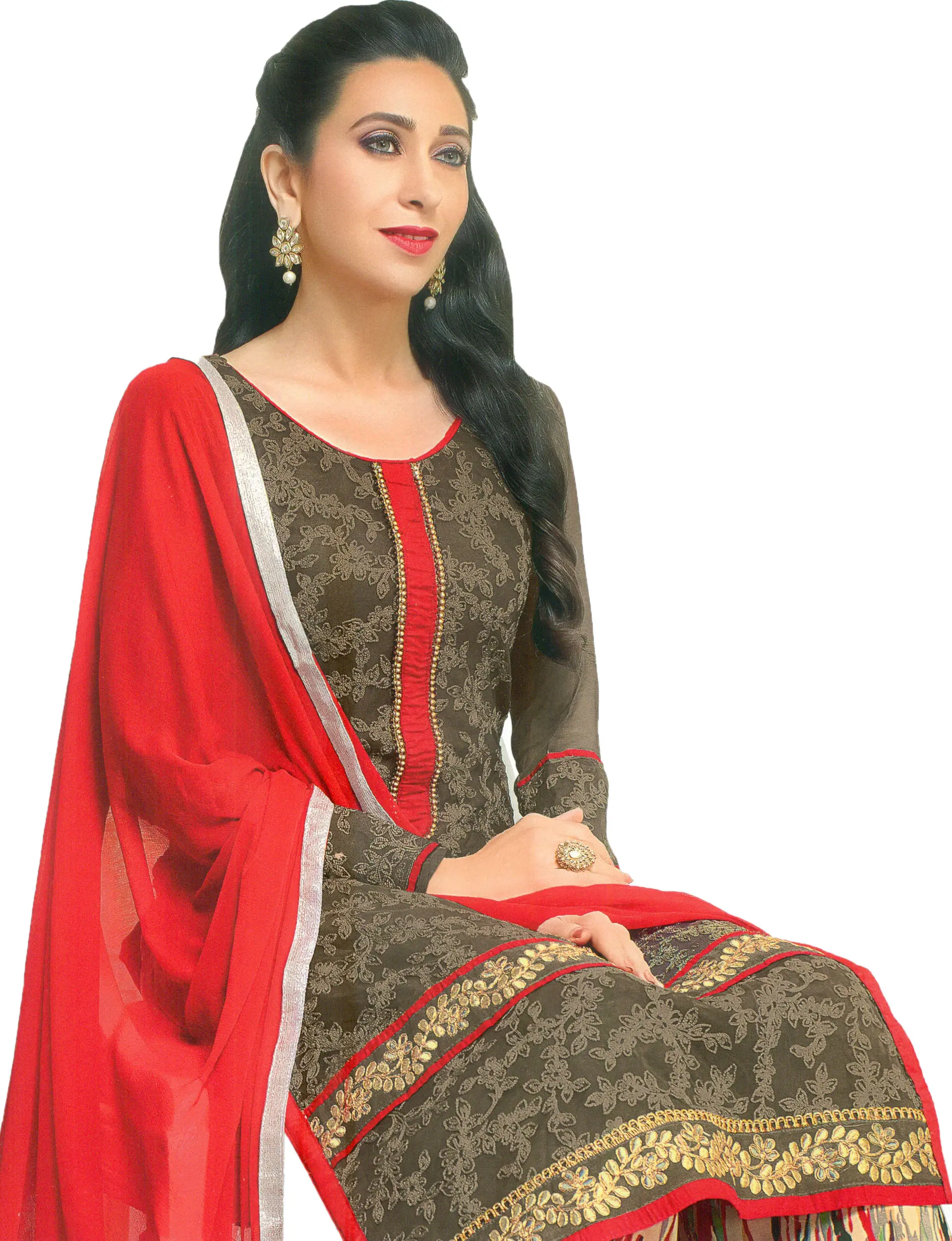 The true artistry of this outfit lies in its detailed embellishments. Delicate floral motifs, rendered in a subtle yet striking tone, are meticulously hand-embroidered across the georgette fabric, creating a rich tapestry of texture and visual interest. These floral patterns are further enhanced by the gentle sparkle of tiny beads, strategically placed to catch the light and add a touch of subtle glamour. The neckline features a striking contrast with a vibrant red panel, framed by delicate beadwork, drawing attention to your face. The sleeves and the hem of the kameez are also beautifully finished with coordinated embroidery and red piping, adding a cohesive and polished look to the entire garment. A broad band of ornate golden embroidery, featuring swirling leaf patterns and delicate bead accents, encircles the hemline, offering a luxurious finish.