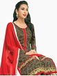 Complementing the richly embroidered kameez are the stylish trousers. These trousers feature a contemporary cut and are adorned with a vibrant, abstract print in shades of red, green, and white, offering a bold yet harmonious contrast to the darker tones of the kameez. The ensemble is completed with a flowing duppata in a vivid shade of red. The duppata is edged with a subtle silver trim, adding a hint of shimmer and a refined touch. This thoughtfully curated combination ensures a complete and elegant look, ready to make a statement. This trouser-salwar kameez suit is more than just an outfit; it's a testament to fine craftsmanship and timeless style. Whether you're attending a festive gathering, a family wedding, or simply wish to elevate your everyday wardrobe with a touch of elegance, this ensemble is sure to turn heads and earn you compliments. Embrace the blend of traditional artistry and modern design, and feel confident and beautiful every time you wear it.