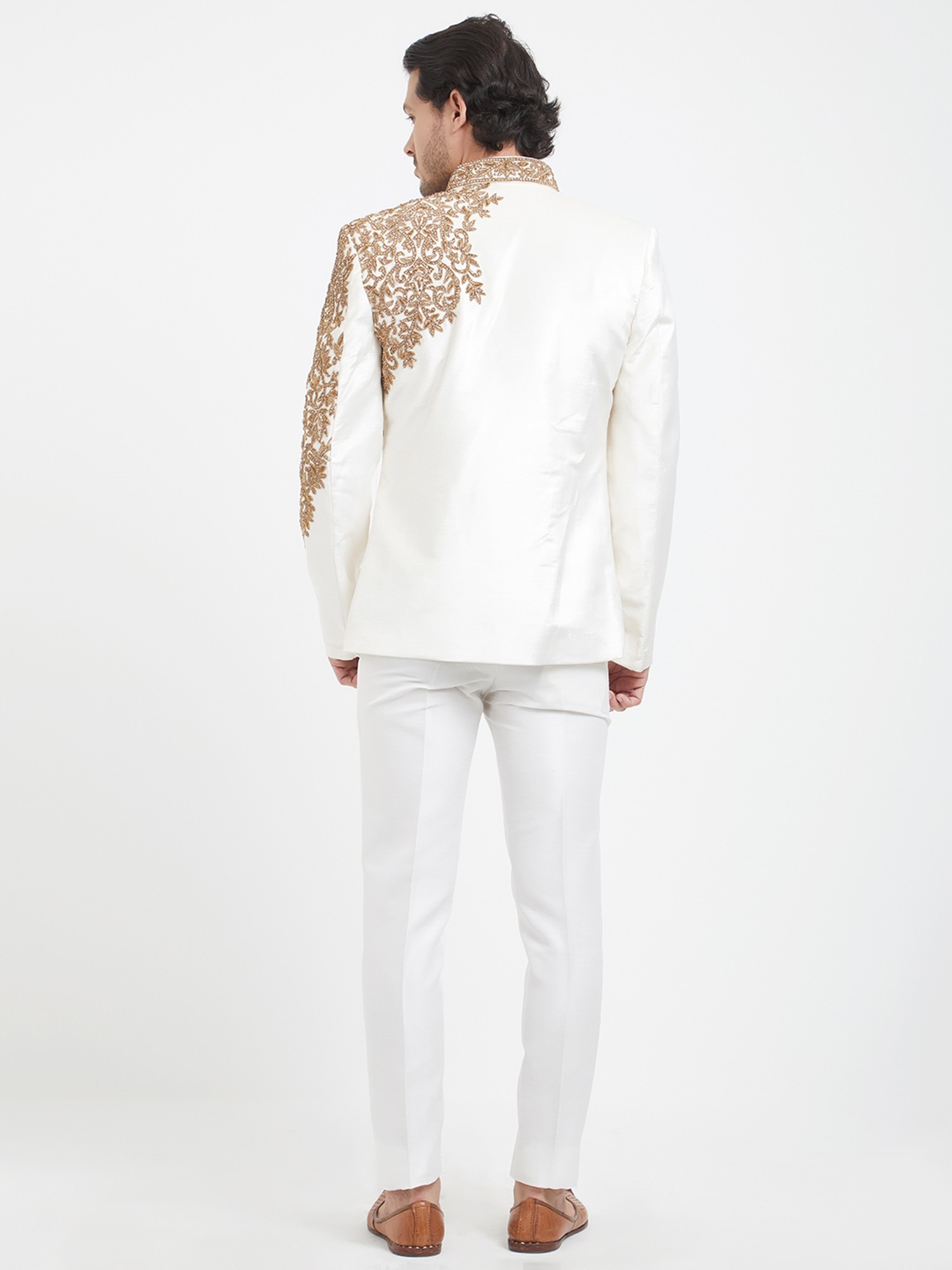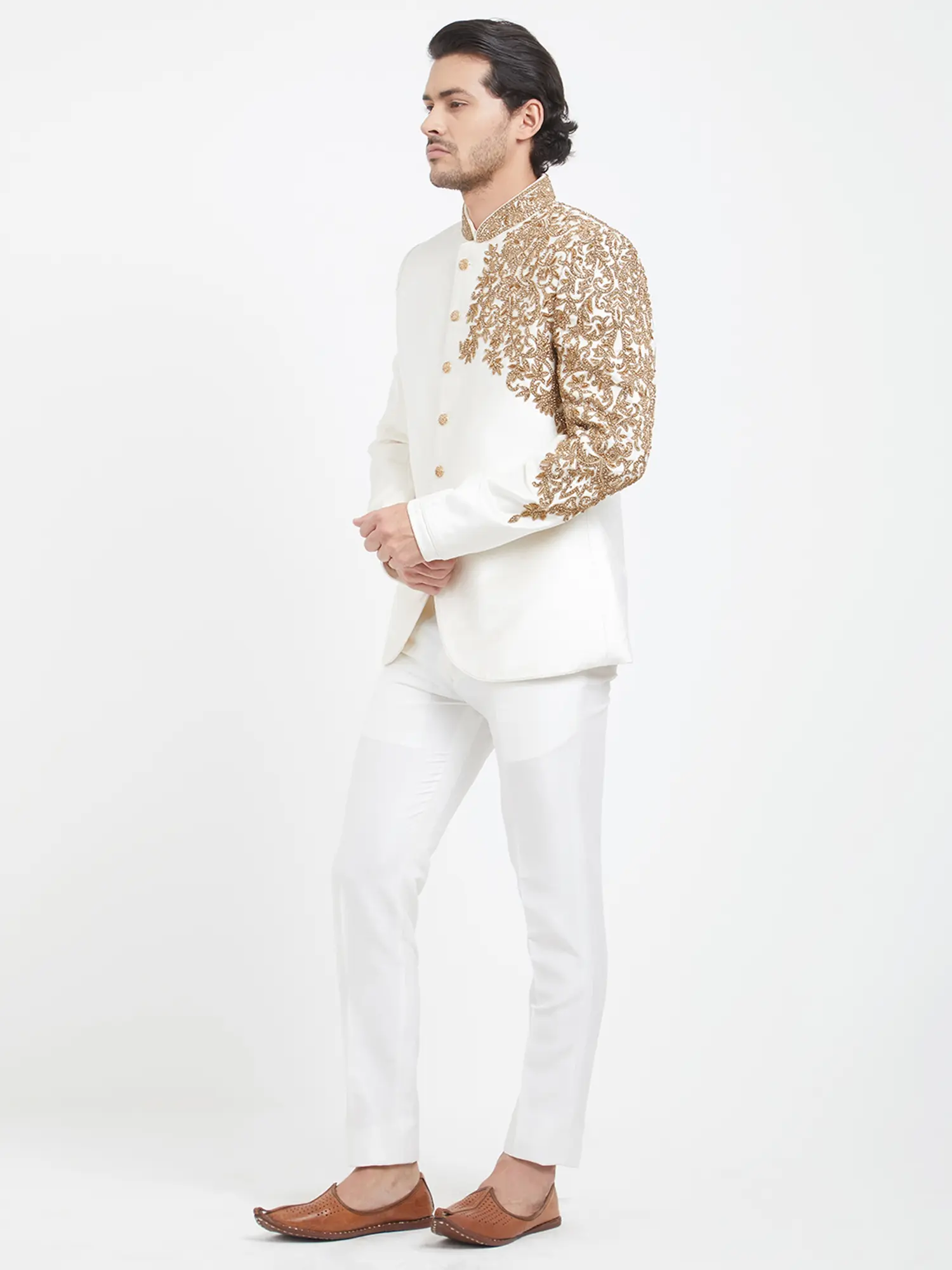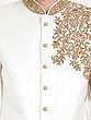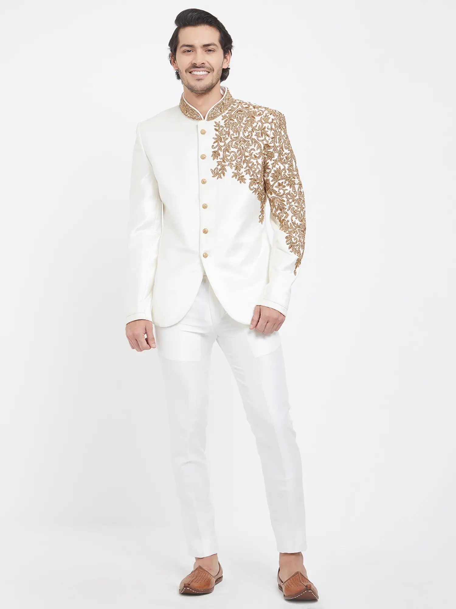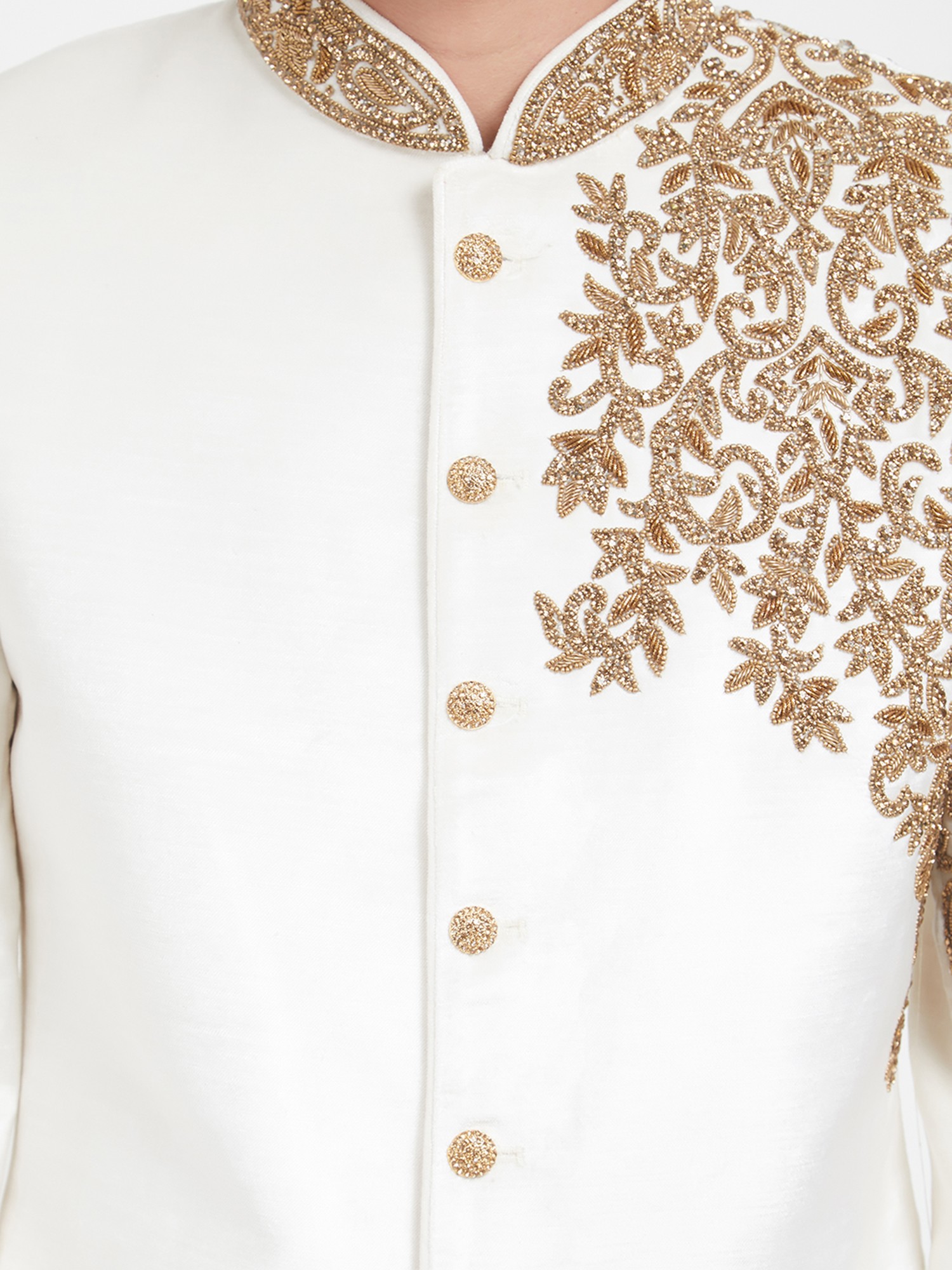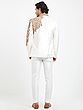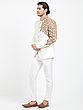 Admire the lustrous finish of the art silk, which catches the light with subtle sophistication. The detailed embroidery, rendered in a rich gold hue, forms an intricate floral motif, creating a striking visual contrast against the pristine white. The clean lines and classic bandhgala silhouette are complemented by lustrous, coordinating buttons, ensuring a polished and impeccable look.