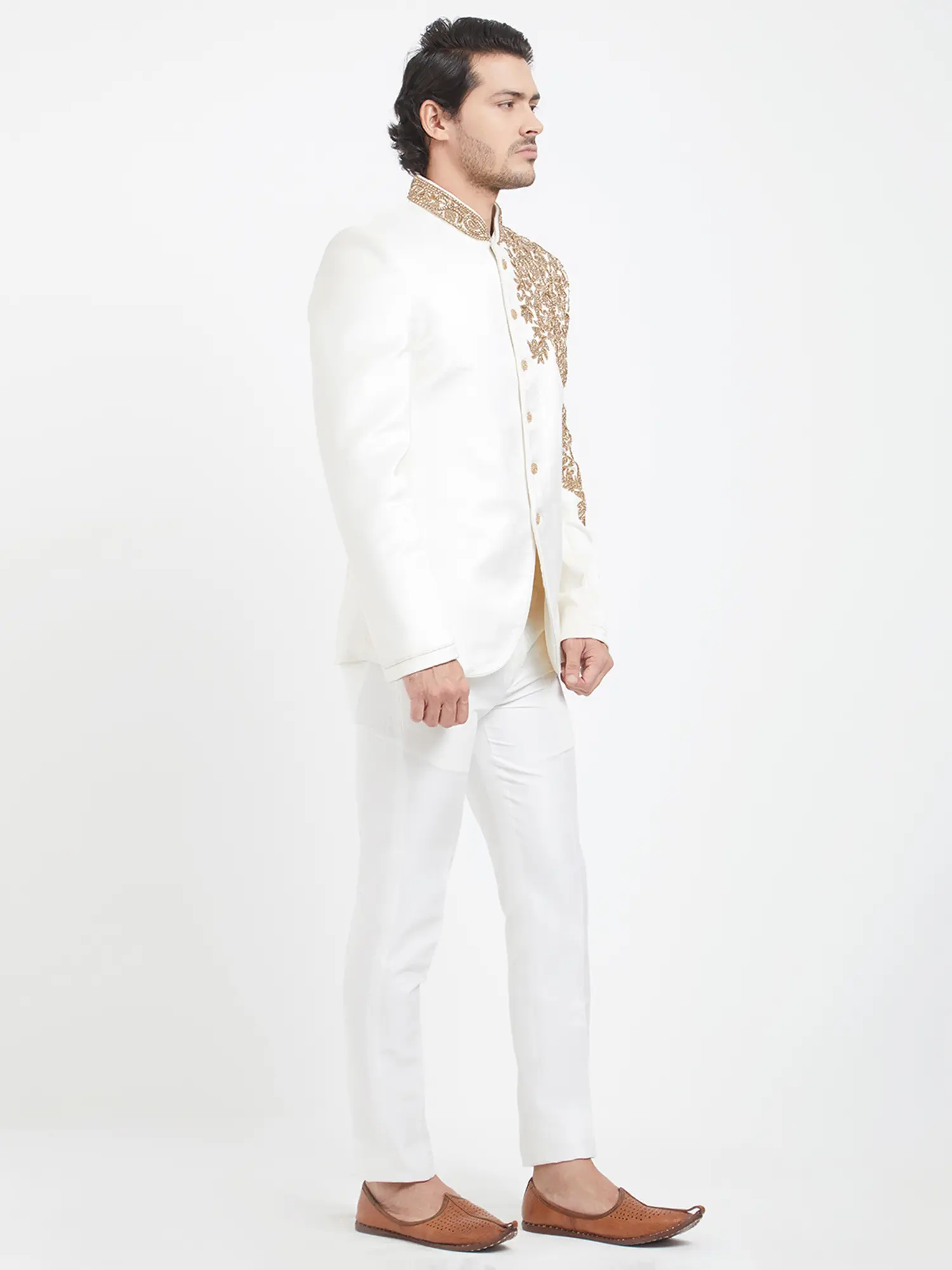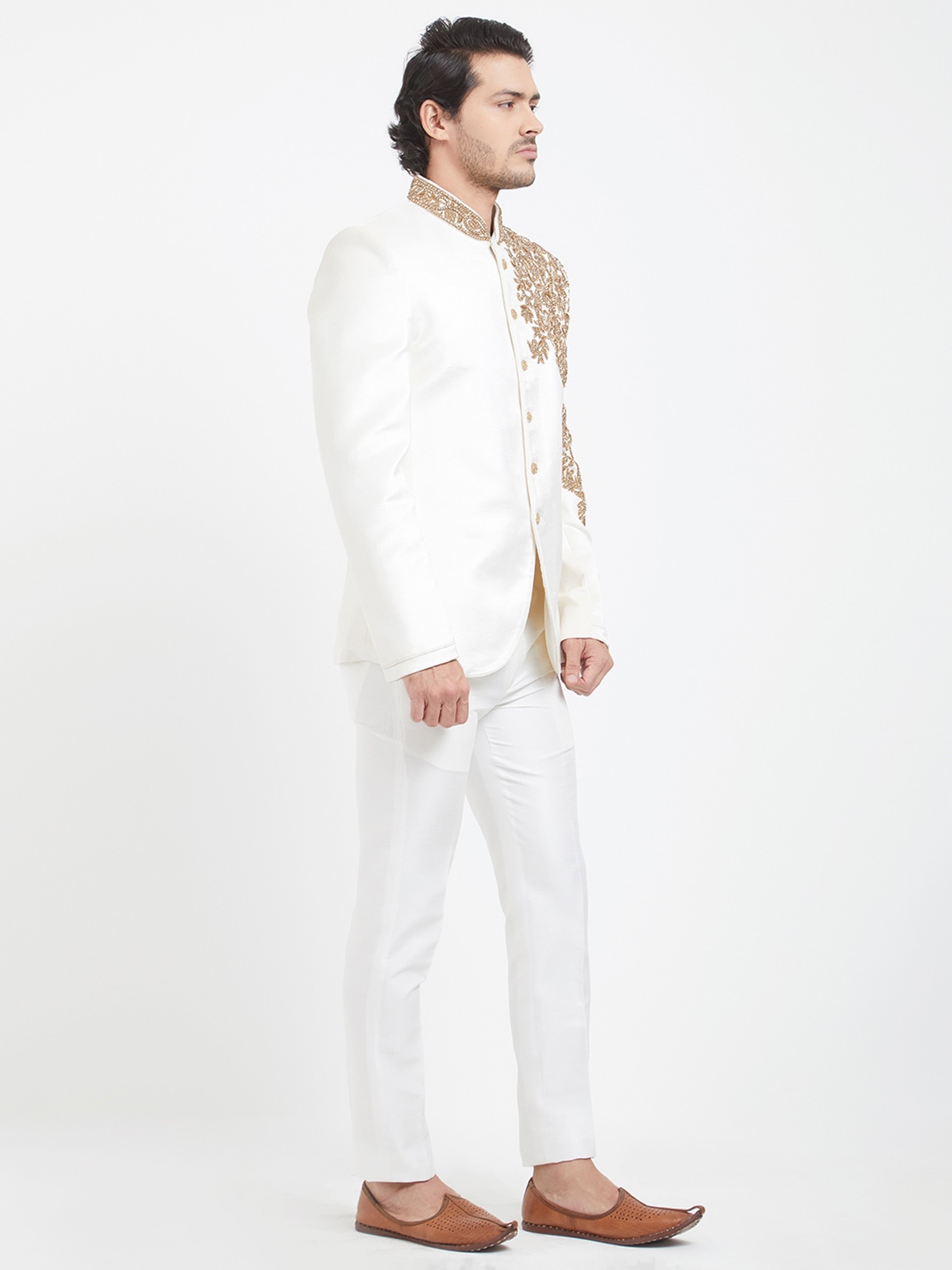 Picture yourself in this ensemble at lavish weddings, sophisticated receptions, or any significant cultural event. It’s ideal for making a statement as a distinguished guest or the groom himself. Paired with complementary footwear and minimal accessories, you will present a vision of understated grandeur.