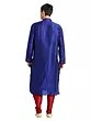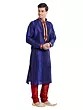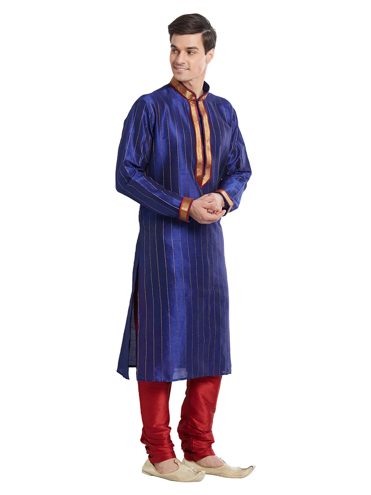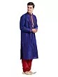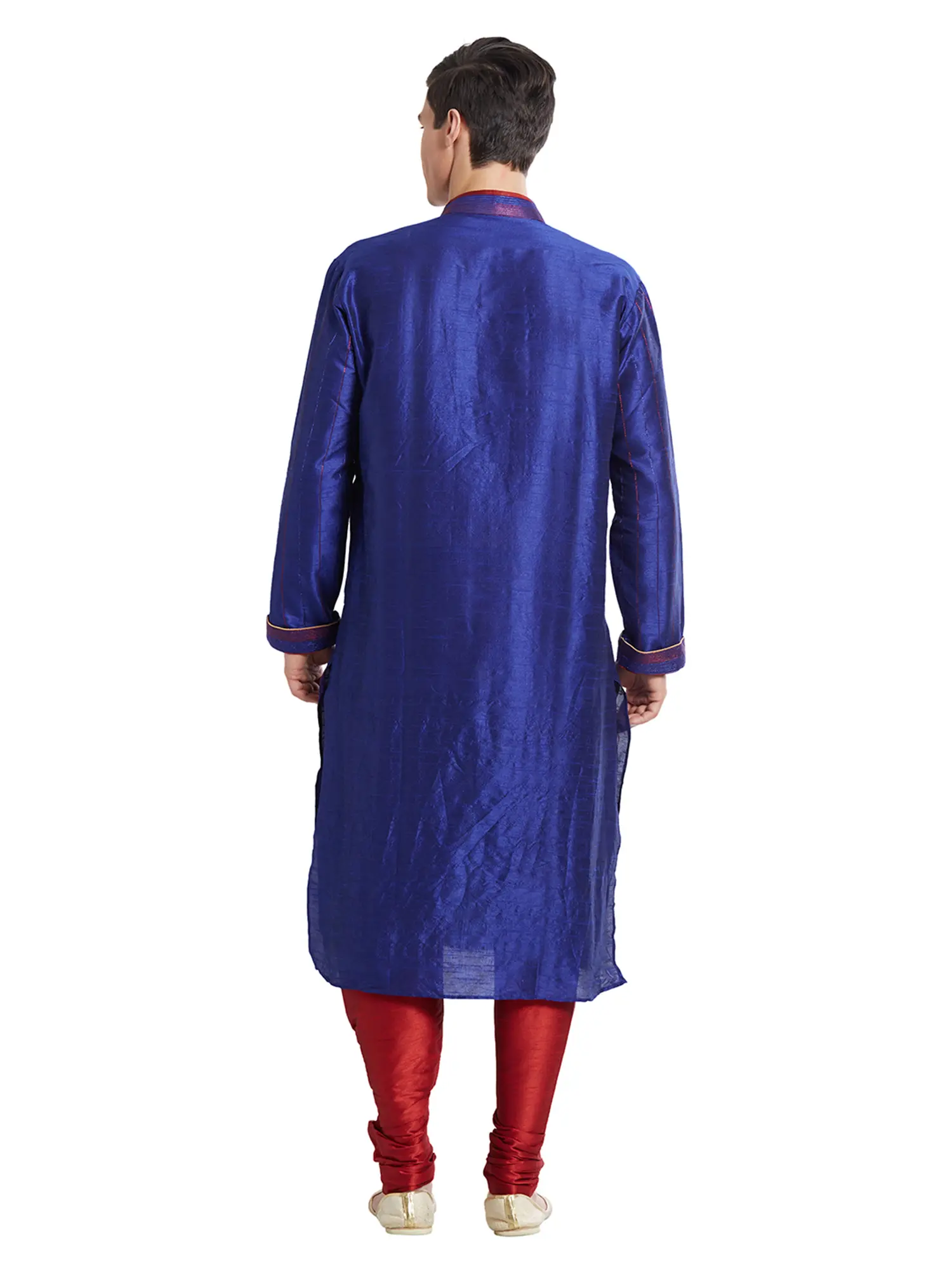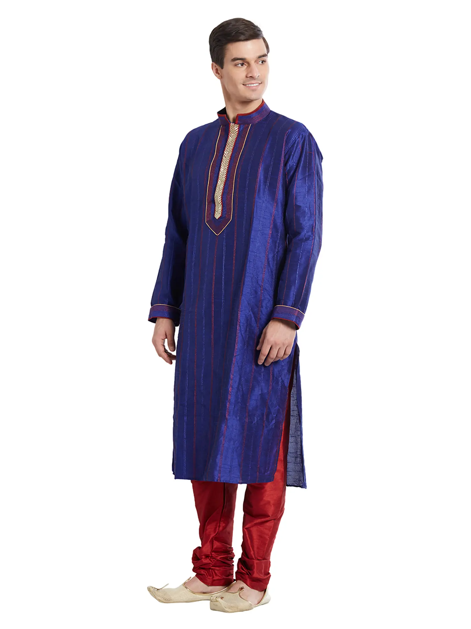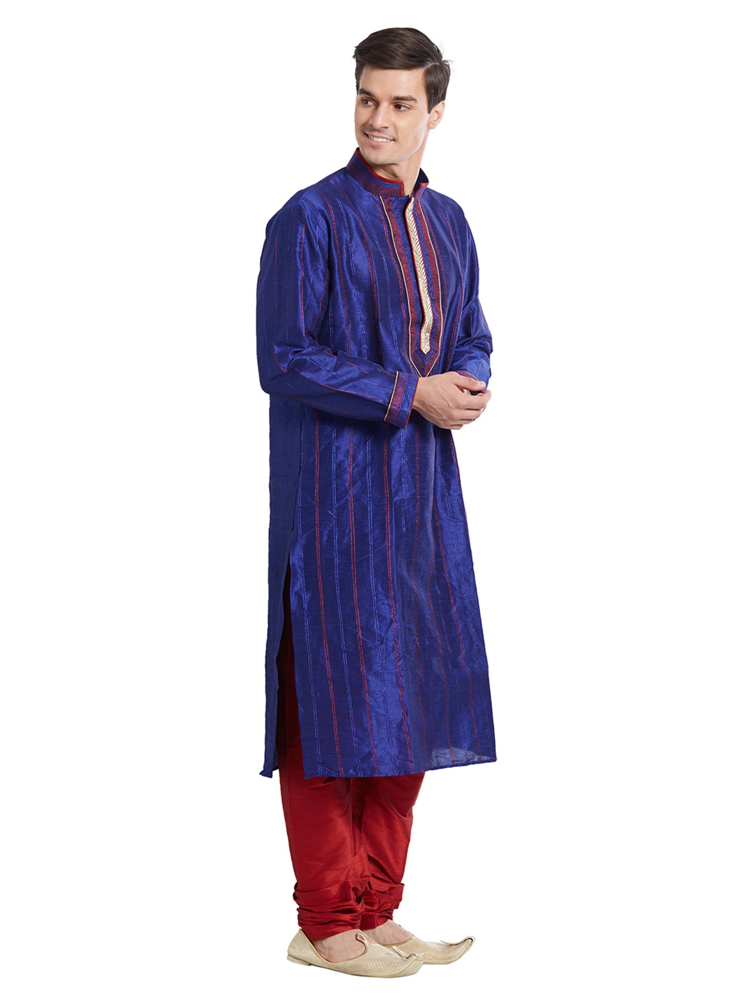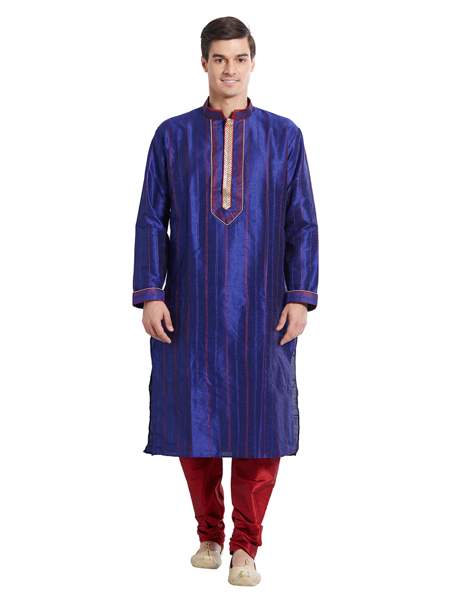 Discover the exquisite touch of art silk, meticulously chosen for its lustrous sheen and graceful drape. Each garment is a testament to precision craftsmanship, featuring fine stitching that speaks to an unwavering dedication to quality. The subtle, vertical red stripes woven into the rich blue fabric add a dynamic visual interest, enhancing its luxurious appeal.
