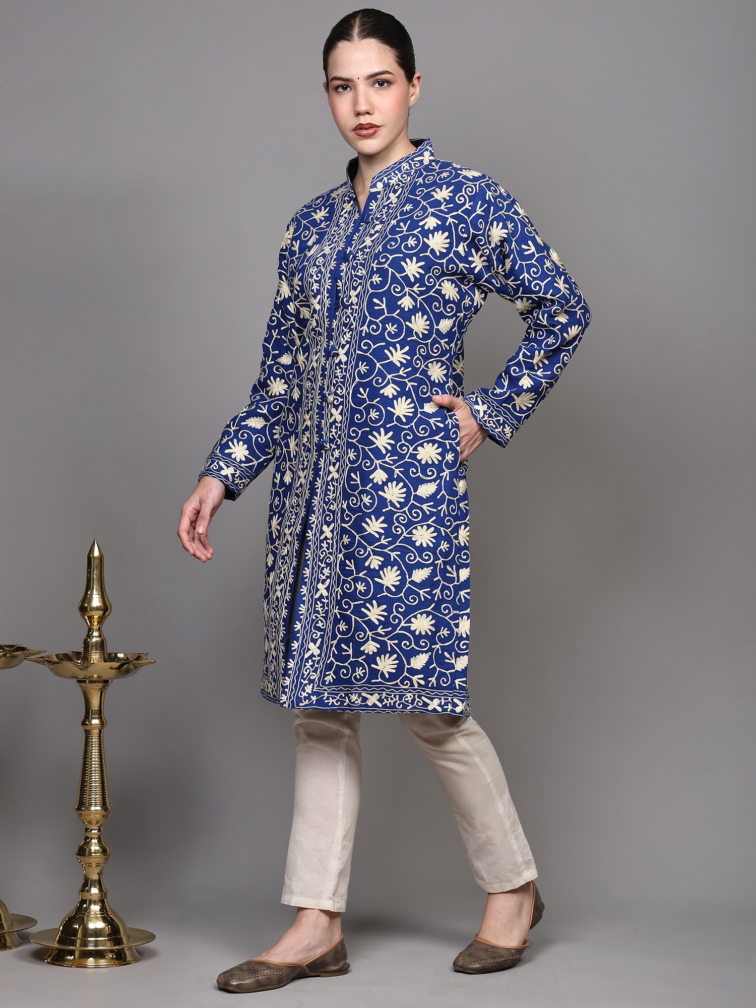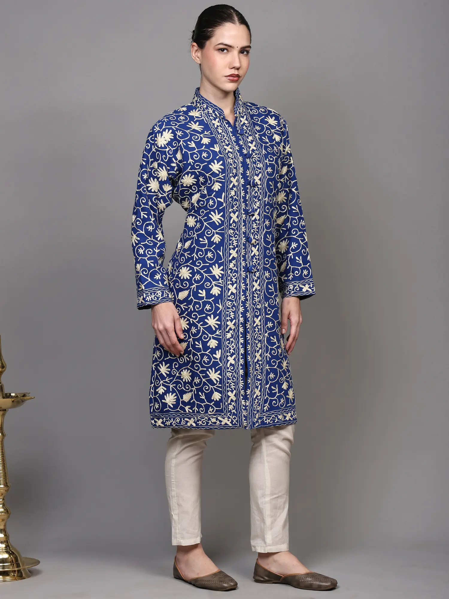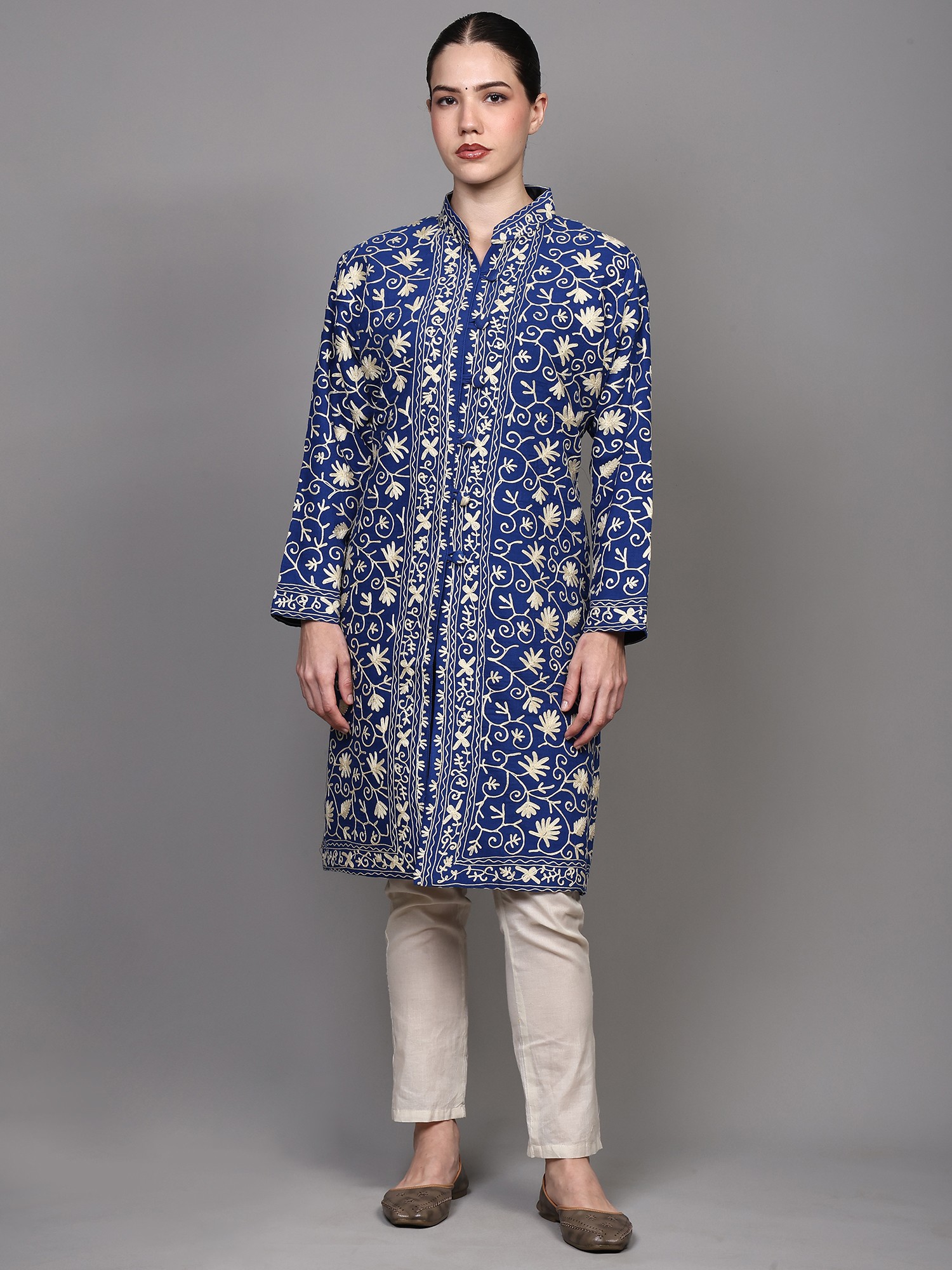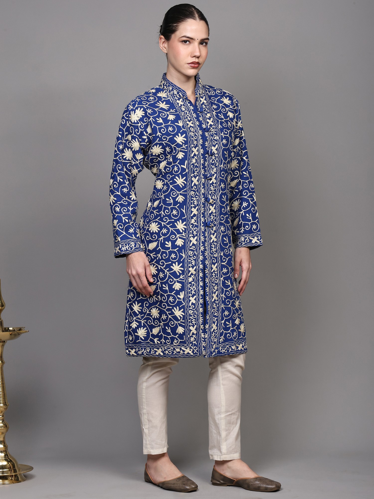 Discover a garment that transcends seasons and trends, a piece designed to be cherished for its artistry and comfort. This long jacket is a testament to the enduring beauty of traditional craftsmanship, meticulously brought to life with a stunning Aari embroidery that adorns its rich, classic blue woolen fabric. The intricate "leaves jaal" design, rendered in a contrasting creamy hue, creates a captivating visual tapestry that speaks of heritage and refined taste.