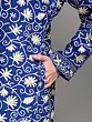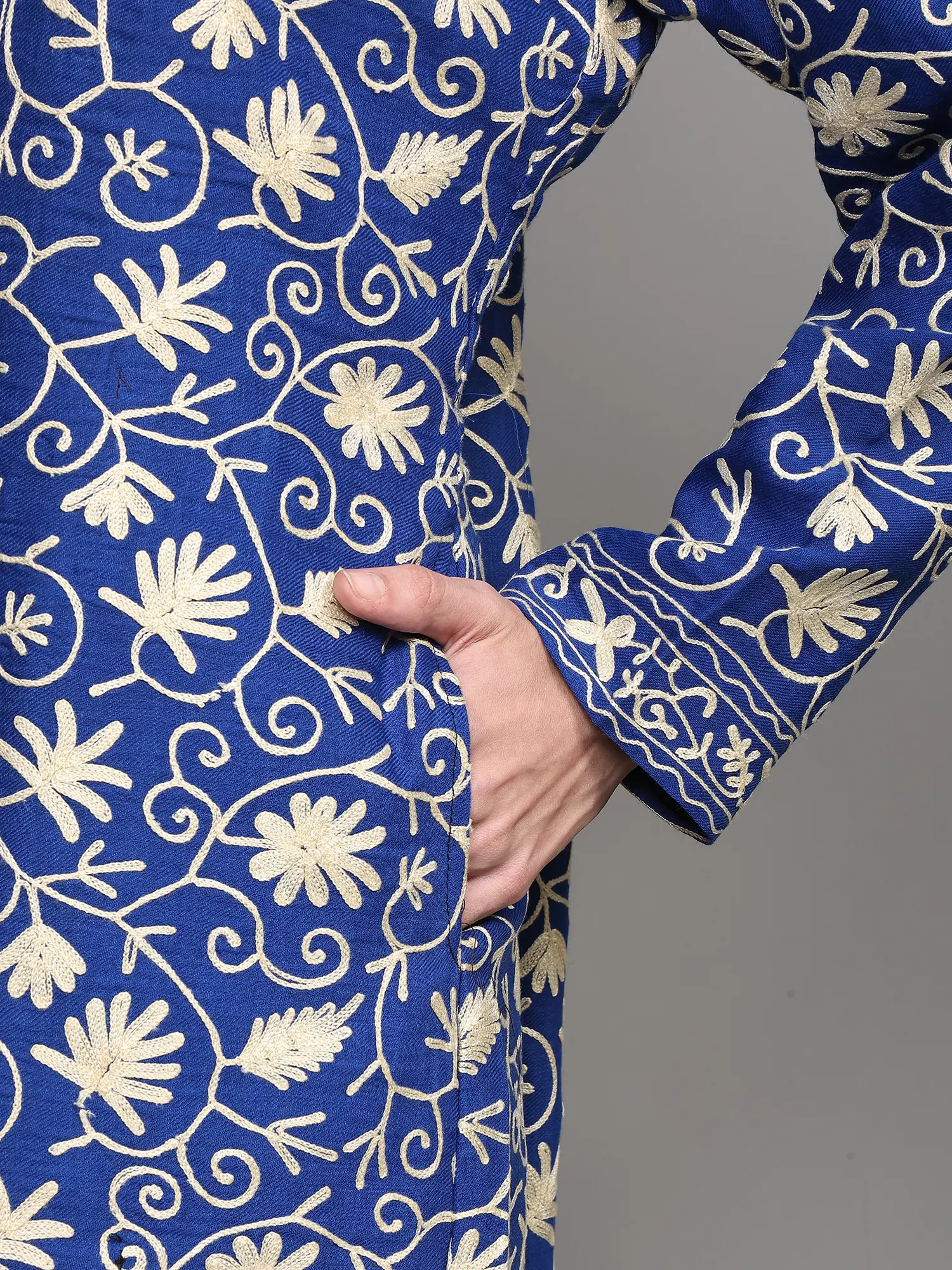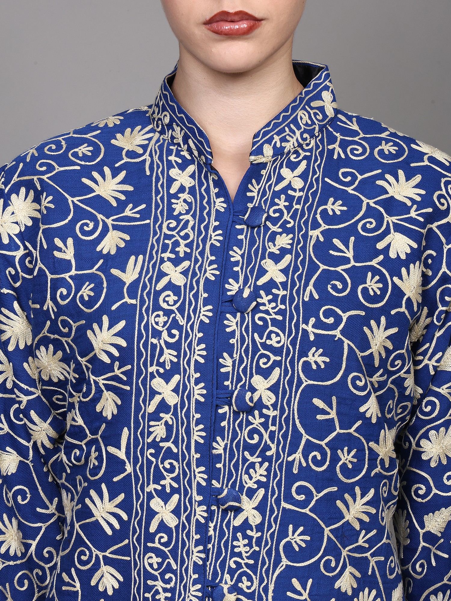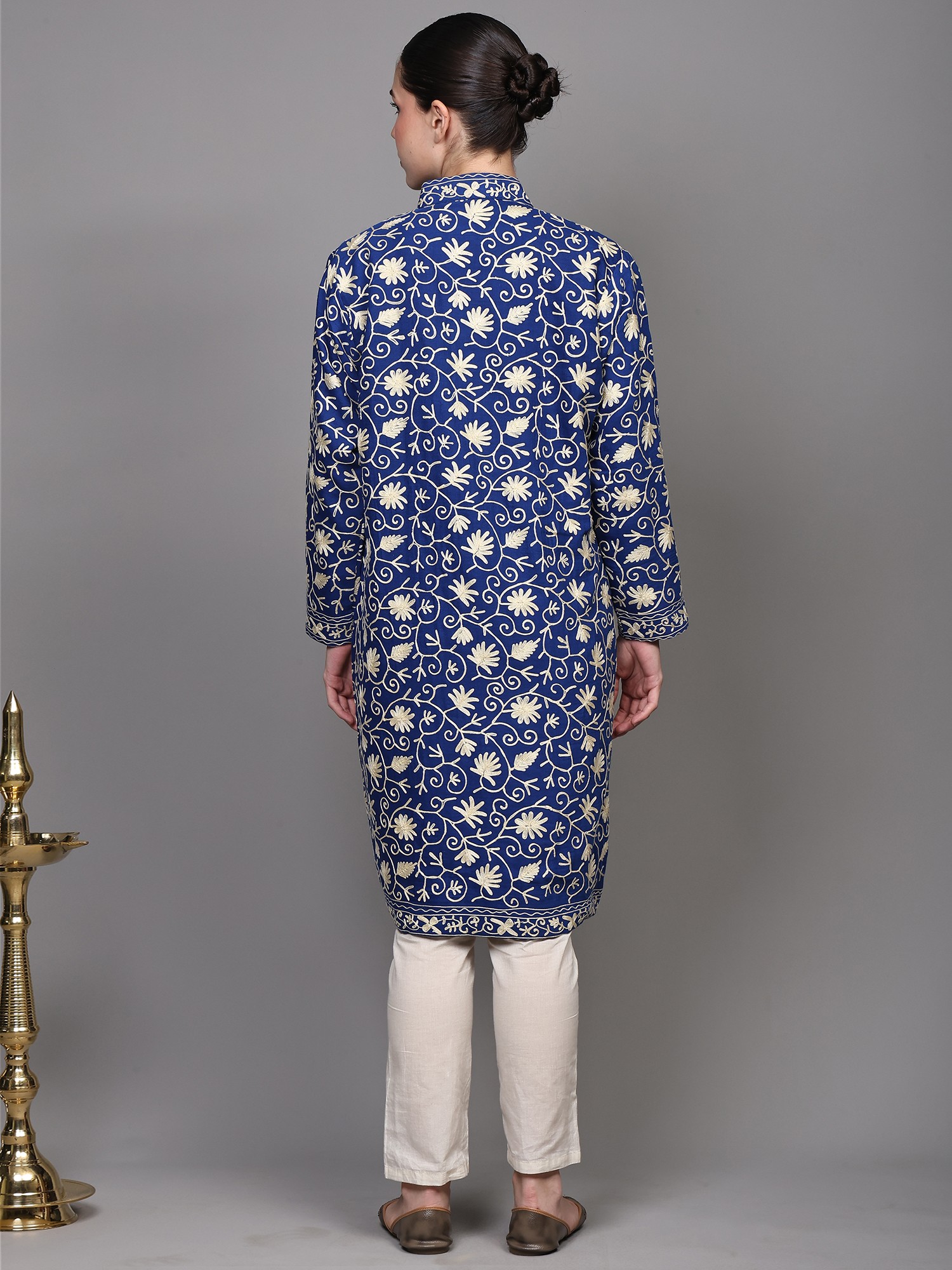 Discover a garment that transcends seasons and trends, a piece designed to be cherished for its artistry and comfort. This long jacket is a testament to the enduring beauty of traditional craftsmanship, meticulously brought to life with a stunning Aari embroidery that adorns its rich, classic blue woolen fabric. The intricate "leaves jaal" design, rendered in a contrasting creamy hue, creates a captivating visual tapestry that speaks of heritage and refined taste.